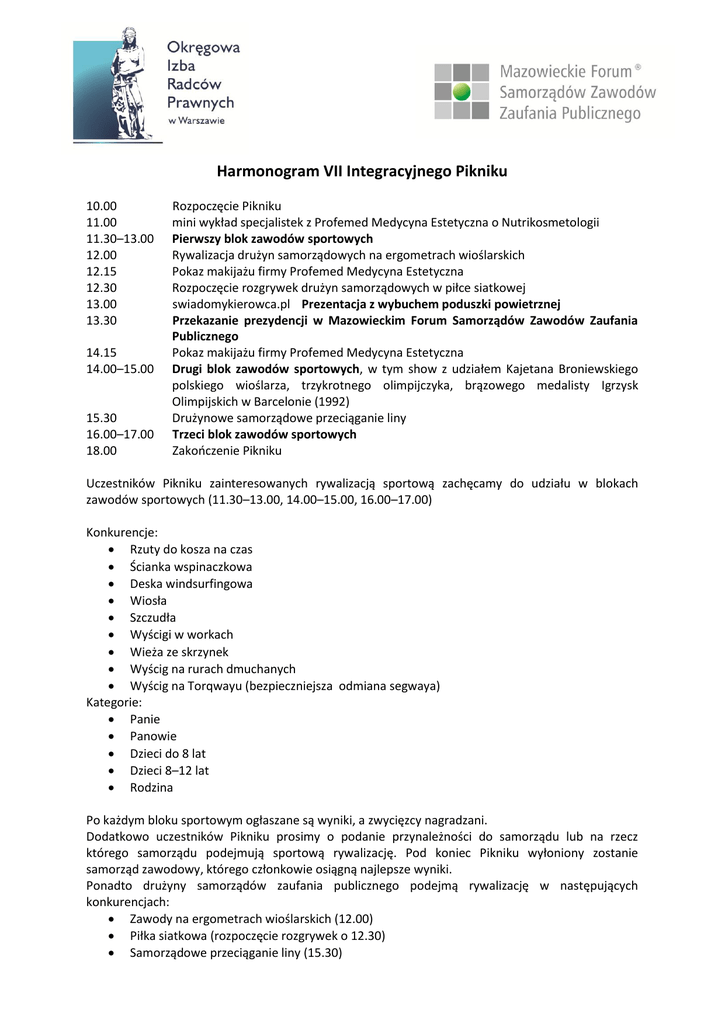 Harmonogram VII Integracyjnego Pikniku 10.00 11.00 11.30–13.00 12.00 12.15 12.30 13.00 13.30 14.15 14.00–15.00 15.30 16.00–17.00 18.00 Rozpoczęcie Pikniku mini wykład specjalistek z Profemed Medycyna Estetyczna o Nutrikosmetologii Pierwszy blok zawodów sportowych Rywalizacja drużyn samorządowych na ergometrach wioślarskich Pokaz makijażu firmy Profemed Medycyna Estetyczna Rozpoczęcie rozgrywek drużyn samorządowych w piłce siatkowej swiadomykierowca.pl Prezentacja z wybuchem poduszki powietrznej Przekazanie prezydencji w Mazowieckim Forum Samorządów Zawodów Zaufania Publicznego Pokaz makijażu firmy Profemed Medycyna Estetyczna Drugi blok zawodów sportowych, w tym show z udziałem Kajetana Broniewskiego polskiego wioślarza, trzykrotnego olimpijczyka, brązowego medalisty Igrzysk Olimpijskich w Barcelonie (1992) Drużynowe samorządowe przeciąganie liny Trzeci blok zawodów sportowych Zakończenie Pikniku Uczestników Pikniku zainteresowanych rywalizacją sportową zachęcamy do udziału w blokach zawodów sportowych (11.30–13.00, 14.00–15.00, 16.00–17.00) Konkurencje: Rzuty do kosza na czas Ścianka wspinaczkowa Deska windsurfingowa Wiosła Szczudła Wyścigi w workach Wieża ze skrzynek Wyścig na rurach dmuchanych Wyścig na Torqwayu (bezpieczniejsza odmiana segwaya) Kategorie: Panie Panowie Dzieci do 8 lat Dzieci 8–12 lat Rodzina Po każdym bloku sportowym ogłaszane są wyniki, a zwycięzcy nagradzani. Dodatkowo uczestników Pikniku prosimy o podanie przynależności do samorządu lub na rzecz którego samorządu podejmują sportową rywalizację. Pod koniec Pikniku wyłoniony zostanie samorząd zawodowy, którego członkowie osiągną najlepsze wyniki. Ponadto drużyny samorządów zaufania publicznego podejmą rywalizację w następujących konkurencjach: Zawody na ergometrach wioślarskich (12.00) Piłka siatkowa (rozpoczęcie rozgrywek o 12.30) Samorządowe przeciąganie liny (15.30)