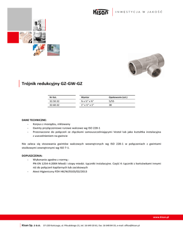 Trójnik redukcyjny GZ-GW-GZ Nr Kat. Wymiar Opakowanie (szt.) 32.50.32 ¾ x ½" x ¾" 5/55 32.60.32 1" x ½" x 1" 38 DANE TECHNICZNE: - Korpus z mosiądzu, niklowany - Gwinty przyłączeniowe rurowe walcowe wg ISO 228-1 - Przeznaczone do połączeń ze złączkami samouszczelniającymi Vestol lub jako kształtka instalacyjna z uszczelnieniem na gwincie Nie zaleca się stosowania gwintów walcowych wewnętrznych wg ISO 228-1 w połączeniach z gwintami stożkowymi zewnętrznymi wg ISO 7-1. DOPUSZCZENIA: - Wykonanie zgodne z normą : PN-EN 1254-4:2004 Miedź i stopy miedzi. Łączniki instalacyjne. Część 4: Łączniki z końcówkami innymi niż do połączeń kapilarnych lub zaciskowych - Atest Higieniczny PZH HK/W/0103/02/2013 www.kisan.pl Kisan Sp. z o.o. 37-220 Kańczuga, ul. Piłsudskiego 21, tel. 16 649 20 61, fax: 16 648 84 33, e-mail: [email protected]