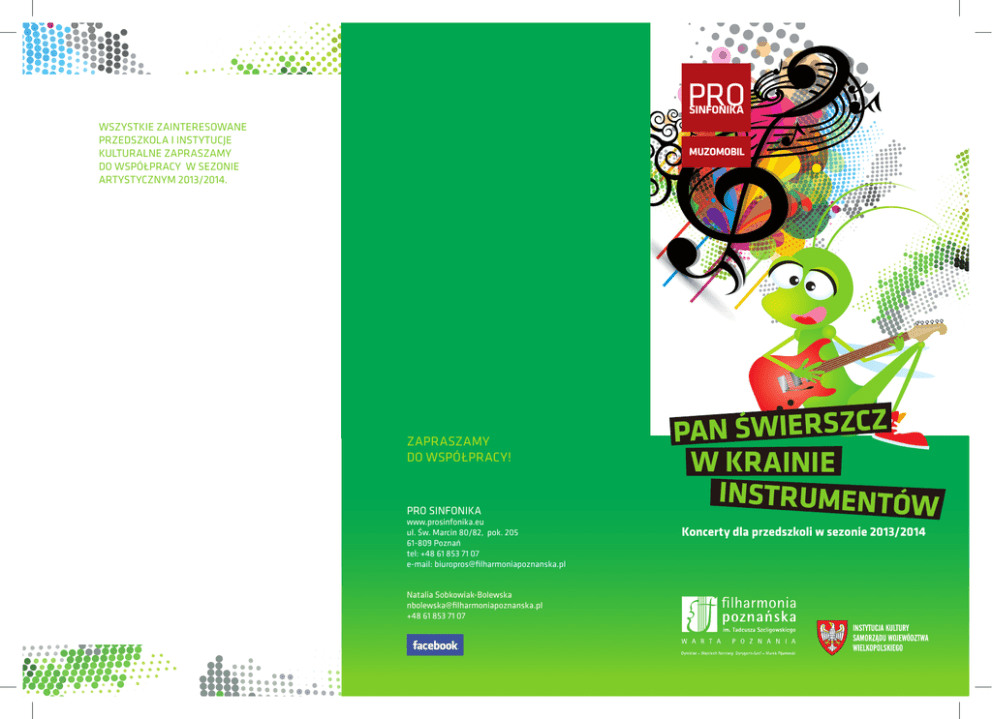PRO SINFONIKA WSZYSTKIE ZAINTERESOWANE PRZEDSZKOLA I INSTYTUCJE KULTURALNE ZAPRASZAMY DO WSPÓŁPRACY W SEZONIE ARTYSTYCZNYM 2013/2014. MUZOMOBIL ZAPRASZAMY DO WSPÓŁPRACY! PRO SINFONIKA www.prosinfonika.eu ul. Św. Marcin 80/82, pok. 205 61-809 Poznań tel: +48 61 853 71 07 e-mail: biuropros@filharmoniapoznanska.pl Natalia Sobkowiak-Bolewska nbolewska@filharmoniapoznanska.pl +48 61 853 71 07 PAN ŚWIERSZCZ W KRAINIE INSTRUMENTÓW Koncerty dla przedszkoli w sezonie 2013/2014 Pan Świerszcz w Krainie Instrumentów 1. PAN ŚWIERSZCZ NA TROPIE MUZYKI 2. ŚWIERSZCZOWE GRANIE W KRAINIE MUZYKI 3. BYŁO HEJNALISTÓW WIELU... 4. 7. MISTRZOWIE DŹWIĘKU: O CZTERECH TAKICH, CO UKRADLI DŹWIĘKI 8. ZACZAROWANY MUZYCZNY OGRÓD 9. A TO (WIELKO)POLSKA WŁAŚNIE 10. JAŚ I MAŁGOSIA W KRAINIE MUZYKI 11. SIEDMIOMILOWE NUTY: Z MUZYKĄ DOOKOŁA ŚWIATA 12. PAN ŚWIERSZCZ NA TROPIE TAŃCA BALETOWA PASJA KONCERT NIESPODZIANKA 9 GRUDNIA 2013 r., AULA UAM, godz. 9.30 i 11.00 5. KIEDY WZEJDZIE PIERWSZA GWIAZDKA 6. Z CYKLU PODRÓŻE W CZASIE: NA BALU U KRÓLA LUDWIKA Moi Drodzy, poznajecie? To ja Pan Świerszcz. Co roku wprowadzam Was we wspaniały świat dźwięków. Kraina Muzyki pełna jest tajemnic, magicznych zaklęć, czarodziejskich gestów. Od trzech lat wspólnie poznajemy ten świat. Słuchamy, śpiewamy, bawimy się i podróżujemy. W sezonie 2013/2014 chciałbym pokazać Wam znane, mniej znane i zupełnie nieznane instrumenty. Poznamy instrumenty dawnych epok oraz te całkiem współczesne. Będą instrumenty, które lubią grać solo, jak i te, które lepiej czują się w towarzystwie. Zobaczymy instrumenty z bardzo odległych krajów oraz te dobrze wszystkim znane. Zapraszam Was w niezwykłą podróż do Krainy Instrumentów. Wystarczy do nas zadzwonić bądź napisać a przyjedziemy do Waszego przedszkola! Pozdrawiam, Świerszcz Świerszczyński