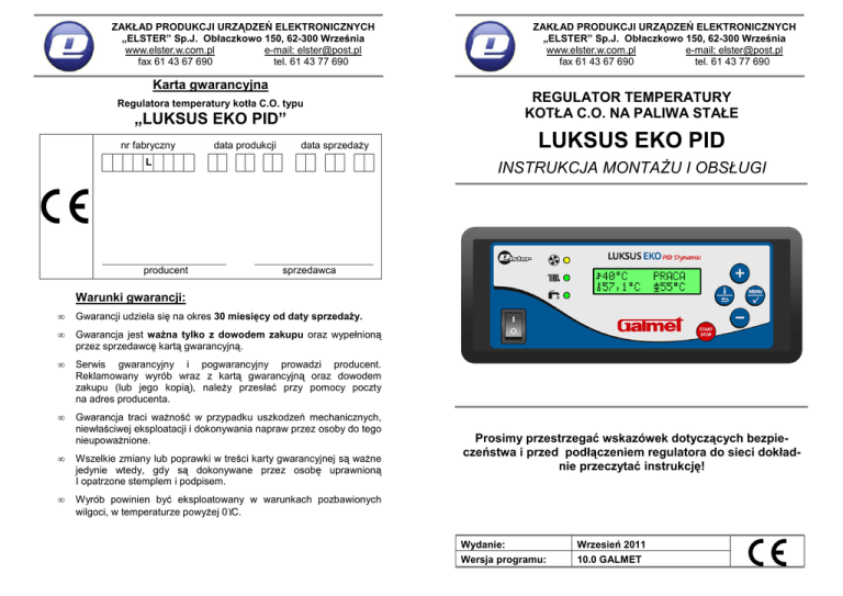 ZAKŁAD PRODUKCJI URZĄDZEŃ ELEKTRONICZNYCH „ELSTER” Sp.J. Obłaczkowo 150, 62-300 Września www.elster.w.com.pl e-mail: [email protected] fax 61 43 67 690 tel. 61 43 77 690 ZAKŁAD PRODUKCJI URZĄDZEŃ ELEKTRONICZNYCH „ELSTER” Sp.J. Obłaczkowo 150, 62-300 Września www.elster.w.com.pl e-mail: [email protected] fax 61 43 67 690 tel. 61 43 77 690 Karta gwarancyjna Regulatora temperatury kotła C.O. typu „LUKSUS EKO PID” nr fabryczny data produkcji data sprzedaży L producent REGULATOR TEMPERATURY KOTŁA C.O. NA PALIWA STAŁE LUKSUS EKO PID INSTRUKCJA MONTAŻU I OBSŁUGI sprzedawca Warunki gwarancji: • Gwarancji udziela się na okres 30 miesięcy od daty sprzedaży. • Gwarancja jest ważna tylko z dowodem zakupu oraz wypełnioną przez sprzedawcę kartą gwarancyjną. • Serwis gwarancyjny i pogwarancyjny prowadzi producent. Reklamowany wyrób wraz z kartą gwarancyjną oraz dowodem zakupu (lub jego kopią), należy przesłać przy pomocy poczty na adres producenta. • Gwarancja traci ważność w przypadku uszkodzeń mechanicznych, niewłaściwej eksploatacji i dokonywania napraw przez osoby do tego nieupoważnione. • Wszelkie zmiany lub poprawki w treści karty gwarancyjnej są ważne jedynie wtedy, gdy są dokonywane przez osobę uprawnioną I opatrzone stemplem i podpisem. • Wyrób powinien być eksploatowany w warunkach pozbawionych wilgoci, w temperaturze powyżej 0°C. Prosimy przestrzegać wskazówek dotyczących bezpieczeństwa i przed podłączeniem regulatora do sieci dokładnie przeczytać instrukcję! Wydanie: Wersja programu: Wrzesień 2011 10.0 GALMET LUKSUS EKO PID – REGULATOR TEMPERATURY KOTŁA C.O. LUKSUS EKO PID – REGULATOR TEMPERATURY KOTŁA C.O. VIII. Karta napraw gwarancyjnych ZPUE ELSTER Sp.J. 62-300 Września Obłaczkowo 150 oświadcza na swoją wyłączną odpowiedzialność, że wyrób REGULATOR TEMPERATURY KOTŁA C.O. LUKSUS EKO PID wyprodukowany po dniu 22 czerwca 2007 r. Data przyjęcia do którego odnosi się niniejsza deklaracja, jest zgodny z poniższymi dyrektywami: • Dyrektywa niskonapięciowa 2006/95/EC • Dyrektywa kompatybilności elektromagnetycznej 2004/108/EC i normami: - PN-EN 60730-1:2002+A1:2006+A12:2004+A13:2005+A14:2006 - EN 60730-1:2000+A1:2004+A12:2003+A13:2004+A14:2005 - PN-EN 60730-2-9:2006 - EN 60730-2-9:2002+A1:2003+A11:2003+A2::2005+A12:2004 - PN-EN 61000-3-2:2007 - EN 61000-3-2:2006 - PN-EN 61000-3-3:1997+A1:2005+A2:2006+IS1:2006 - EN 61000-3-3:1995+A1:2001+A2:2005+IS1:2005 Data wydania w związku z Dyrektywą 2004/108/EC i Dyrektywą 2006/95/EC Opis usterki - 07 Pieczęć serwisu Deklaracja zgodności 2 19 LUKSUS EKO PID – REGULATOR TEMPERATURY KOTŁA C.O. LUKSUS EKO PID – REGULATOR TEMPERATURY KOTŁA C.O. VII. Warunki pracy. Temperatura otoczenia 0 - 40 C Napięcie zasilania 230 V, 50 Hz Pobór mocy przez regulator 4W Moc znamionowa podłączonych urządzeń 370 VA Obciążalność wyjść: Pompa cyrkulacyjna C.O. 100 VA Pompa ładująca zbiornik C.W.U. 100 VA Dmuchawa 160 VA Stopień ochrony IP 30 UWAGA! URZĄDZENIE ELEKTRYCZNE POD NAPIĘCIEM. Wskazówki bezpieczeństwa: 1. Podczas podłączania regulatora należy wziąć pod uwagę lokalne warunki i przepisy dotyczące zaopatrzenia w energię elektryczną. 2. Instalacje elektryczne powinna wykonywać osoba posiadająca odpowiednie uprawnienia, przy wyjętej wtyczce zasilającej urządzenie z gniazda sieci zasilającej. 3. Z uwagi na bezpieczeństwo pracy w trakcie obsługi , a także na zakłócenia elektromagnetyczne sieci energetycznej, które mogą mieć wpływ na pracę układu (objawiające się między innymi błędami pomiaru temperatury), należy bezwzględnie regulator podłączyć do gniazda sieci wyposażonego w prawidłowo podłączony styk ochronny !!! Niezastosowanie się do powyższego spowoduje utratę gwarancji !!! 4. Przed pierwszym uruchomieniem regulatora należy sprawdzić skuteczność zerowania dmuchawy i pomp. 5. Przewód zasilający nie może być naprawiany. Ewentualna wymiana przewodu zasilającego powinna być wykonana jedynie u producenta lub przez odpowiedniego serwisanta! 6. Dla bezpiecznej eksploatacji kotła zasypowego bezwarunkowo konieczne jest podłączenie i prawidłowe zamocowanie wyłącznika termicznego dmuchawy. Brak tego zabezpieczenia może skutkować utratą gwarancji. Podczas wyładowań atmosferycznych napięcie związane z przepływem prądu piorunowego może osiągnąć wartość nawet do 300 kV, uszkadzając urządzenia elektroniczne. Pamiętaj o odłączeniu regulatora oraz innych urządzeń od sieci zasilającej podczas burz i nieobecności w domu. 18 3 LUKSUS EKO PID – REGULATOR TEMPERATURY KOTŁA C.O. LUKSUS EKO PID – REGULATOR TEMPERATURY KOTŁA C.O. • Spis treści I. Opis ogólny 5 II. Panel sterowania. 7 III. Użytkowanie pieca, dobór parametrów. 8 1. Rozpalanie w kotle................................................................8 2. Dokładanie opału do kotła, podgląd jakości spalania............8 3. Dobór parametrów. ...............................................................8 4. Uzyskanie dodatkowych informacji o pracy kotła. ...............11 IV. Zasada działania regulatora. 11 1. Działanie dmuchawy. ..........................................................12 2. Działanie pompy obiegowej C.O. ........................................12 3. Działanie pompy ładującej zbiornik C.W.U..........................12 4. Współpraca z regulatorem pokojowym. ..............................13 V. Stany alarmowe i obsługa błędów. 14 VI. Przyłączenie regulatora do instalacji C.O. 15 1. Montaż elektryczny. ............................................................15 2. Przykładowy schemat instalacji...........................................17 VII. Warunki pracy. 18 VIII. Karta napraw gwarancyjnych 19 Karta gwarancyjna 20 4 żyły przewodu przyłączeniowego podłączyć do zacisków 1 i 2 (dostarczanego na życzenie klienta) wtyku typu XLR; • wtyk podłączyć do odpo