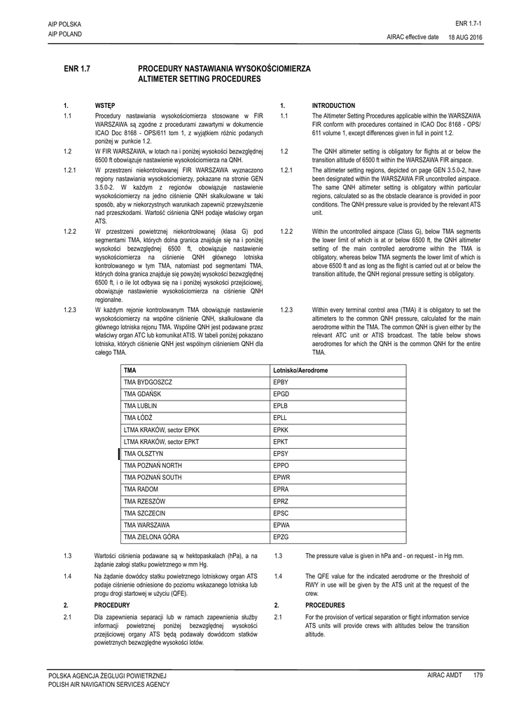 ENR 1.7-1 AIP POLSKA AIP POLAND AIRAC effective date ENR 1.7 18 AUG 2016 PROCEDURY NASTAWIANIA WYSOKOŚCIOMIERZA ALTIMETER SETTING PROCEDURES 1. WSTĘP 1. INTRODUCTION 1.1 Procedury nastawiania wysokościomierza stosowane w FIR WARSZAWA są zgodne z procedurami zawartymi w dokumencie ICAO Doc 8168 - OPS/611 tom 1, z wyjątkiem różnic podanych poniżej w punkcie 1.2. 1.1 The Altimeter Setting Procedures applicable within the WARSZAWA FIR conform with procedures contained in ICAO Doc 8168 - OPS/ 611 volume 1, except differences given in full in point 1.2. 1.2 W FIR WARSZAWA, w lotach na i poniżej wysokości bezwzględnej 6500 ft obowiązuje nastawienie wysokościomierza na QNH. 1.2 The QNH altimeter setting is obligatory for flights at or below the transition altitude of 6500 ft within the WARSZAWA FIR airspace. 1.2.1 W przestrzeni niekontrolowanej FIR WARSZAWA wyznaczono regiony nastawiania wysokościomierzy, pokazane na stronie GEN 3.5.0-2. W każdym z regionów obowiązuje nastawienie wysokościomierzy na jedno ciśnienie QNH skalkulowane w taki sposób, aby w niekorzystnych warunkach zapewnić przewyższenie nad przeszkodami. Wartość ciśnienia QNH podaje właściwy organ ATS. 1.2.1 The altimeter setting regions, depicted on page GEN 3.5.0-2, have been designated within the WARSZAWA FIR uncontrolled airspace. The same QNH altimeter setting is obligatory within particular regions, calculated so as the obstacle clearance is provided in poor conditions. The QNH pressure value is provided by the relevant ATS unit. 1.2.2 W przestrzeni powietrznej niekontrolowanej (klasa G) pod segmentami TMA, których dolna granica znajduje się na i poniżej wysokości bezwzględnej 6500 ft, obowiązuje nastawienie wysokościomierza na ciśnienie QNH głównego lotniska kontrolowanego w tym TMA, natomiast pod segmentami TMA, których dolna granica znajduje się powyżej wysokości bezwzględnej 6500 ft, i o ile lot odbywa się na i poniżej wysokości przejściowej, obowiązuje nastawienie wysokościomierza na ciśnienie QNH regionalne. 1.2.2 Within the uncontrolled airspace (Class G), below TMA segments the lower limit of which is at or below 6500 ft, the QNH altimeter setting of the main controlled aerodrome within the TMA is obligatory, whereas below TMA segments the lower limit of which is above 6500 ft and as long as the flight is carried out at or below the transition altitude, the QNH regional pressure setting is obligatory. 1.2.3 W każdym rejonie kontrolowanym TMA obowiązuje nastawienie wysokościomierzy na wspólne ciśnienie QNH, skalkulowane dla głównego lotniska rejonu TMA. Wspólne QNH jest podawane przez właściwy organ ATC lub komunikat ATIS. W tabeli poniżej pokazano lotniska, których ciśnienie QNH jest wspólnym ciśnieniem QNH dla całego TMA. 1.2.3 Within every terminal control area (TMA) it is obligatory to set the altimeters to the common QNH pressure, calculated for the main aerodrome within the TMA. The common QNH is given either by the relevant ATC unit or ATIS broadcast. The table below shows aerodromes for which the QNH is the common QNH for the entire TMA. TMA Lotnisko/Aerodrome TMA BYDGOSZCZ EPBY TMA GDAŃSK EPGD TMA LUBLIN EPLB TMA ŁÓDŹ EPLL LTMA KRAKÓW, sector EPKK EPKK LTMA KRAKÓW, sector EPKT EPKT TMA OLSZTYN EPSY TMA POZNAŃ NORTH EPPO TMA POZNAŃ SOUTH EPWR TMA RADOM EPRA TMA RZESZÓW EPRZ TMA SZCZECIN EPSC TMA WARSZAWA EPWA TMA ZIELONA GÓRA EPZG 1.3 Wartości ciśnienia podawane są w hektopaskalach (hPa), a na żądanie załogi statku powietrznego w mm Hg. 1.3 The pressure value is given in hPa and - on request - in Hg mm. 1.4 Na żądanie dowódcy statku powietrznego lotniskowy organ ATS podaje ciśnienie odniesione do poziomu wskazanego lotniska lub progu drogi startowej w użyciu (QFE). 1.4 The QFE value for the indicated aerodrome or the threshold of RWY in use will be given by the ATS unit at the request of the crew. 2. PROCEDURY 2. PROCEDURES 2.1 Dla zapewnienia separacji lub w ramach zapewnienia służby informacji powietrznej poniżej bezwzględnej wysokości przejściowej organy ATS będą podawały dowódcom statków powietrznych bezwzględne wysokości lotów. 2.1 For the provision of vertical separation or flight information service ATS units will provide crews with altitudes below the transition altitude. POLSKA AGENCJA ŻEGLUGI POWIETRZNEJ POLISH AIR NAVIGATION SERVICES AGENCY AIRAC AMDT 179 ENR 1.7-2 AIP POLSKA AIP POLAND AIRAC effective date 12 NOV 2015 2.2 Na lotniskach wojskowych i w strefach tych lotnisk (MATZ) obowiązuje nastawienie wysokościomierza według QNH, chyba że lokalnie opublikowane przepisy stanowią inaczej. 2.2 While flying within military aerodrome traffic zones (MATZ) the QNH setting is obligatory unless otherwise published in local regulations. 2.3 Podczas wykonywania lotów związanych z pracami agrotechnicznymi, montażowymi itp. w rejonie położonym w pobliżu lotniska (lądowiska) wysokościomierz może być nastawiony na: 2.3 During agrotechnical and/or similar flights conducted within the airspace in the vicinity of an aerodrome (airfield), the altimeter may be set to: a) ciśnienie atmosferyczne na poziomie lotniska (lądowiska) QFE, o ile różnica wzniesień lotniska (lądowiska) i terenu, nad którym wykonuje się te prace, jest nieznaczna, a pozycja w płaszczyźnie pionowej statku powietrznego może być wyrażana jako wysokość względna nad lotniskiem (lądowiskiem); a) QFE at the aerodrome (airfield) assuming that the difference between the aerodrome (airfield) elevation and the terrain over which a flight is to be conducted is insignificant and the vertical position of the aircraft may be expressed as a height over the aerodrome (airfield). b) ciśnienie atmosferyczne na poziomie terenu, nad którym wykonuje się te prace, o ile różnica wzniesień lotniska (lądowiska) i tego terenu ma wpływ przy innym nastawieniu wysokościomierza na wykonanie tych prac, a pozycja w płaszczyźnie pionowej st