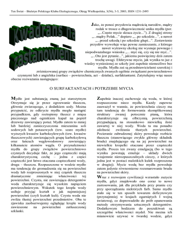 Ten Świat – Biuletyn Polskiego Klubu Ekologicznego, Okręg Wielkopolska, 3(56), 3-5, 2003, ISSN 1231-2495 Jako, Ŝe ponoć przysłowia mądrością narodów, mądry rodak w trosce o długowieczność unika mydła (por. „...Częste mycie skraca Ŝycie...”). Z drugiej strony „...mądry Polak...” dopiero „...po szkodzie...”, a nawet „...przed szkodą i po szkodzie głupi...”. Zestawienie przysłów wywołuje więc pewne zamieszanie, z którego nawet wytrawny ekolog nie wysnuje pewnego i niepodwaŜalnego wniosku „... myć się, czy się nie myć...”. „...Oto jest pytanie...”, jakiemu poświęcimy dziś zatem trochę uwagi. Efektywne mycie, jak wynika to juŜ z wiedzy wyniesionej ze szkoły jest zupełnie niemoŜliwe bez mydła. Mydła zaś są przedstawicielami szerokiej i zróŜnicowanej grupy związków chemicznych zwanych ogólnie związkami powierzchniowo czynnymi lub z angielska (surface – powierzchnia, act – działać), surfaktantami. Zatytułujmy więc nasze obecne rozwaŜania następująco: O SURFAKTANTACH i POTRZEBIE MYCIA Mydło jest substancją znaną juŜ staroŜytnym Otrzymuje się je przez ogrzewanie tłuszczu, głównie zwierzęcego, z dodatkiem sody. MoŜna przypuścić, Ŝe odkrycie mydła mogło nastąpić przypadkiem, gdy roztopiony tłuszcz z mięsa pieczonego nad ogniskiem kapał na popiół drzewny zawierający potaŜ. Mydło zatem to mniej lub bardziej zanieczyszczona mieszanina soli sodowych lub potasowych (tzw. szare mydło) wyŜszych kwasów karboksylowych (tzw. kwasów tłuszczowych) zawierających grupę karboksylową oraz łańcuch węglowodorowy zawierający kilkanaście atomów węgla. O przynaleŜności mydła do grupy związków powierzchniowo czynnych decyduje fakt, Ŝe jego cząsteczki mają charakterystyczną cechę – jedna z części cząsteczki jest łatwo otaczana cząsteczkami wody, druga – tłuszczu. Rozpuszczone w wodzie mydło ma tendencję do gromadzenia się na powierzchni wody lub rozproszonych w niej cząstek tłuszczu dramatycznie zmieniając właściwości tej powierzchni. Czysta, nie zawierająca detergentów woda charakteryzuje się wysokim napięciem powierzchniowym. Wskutek tego kropla wody usiłuje przyjąć kształt o jak najmniejszej powierzchni (czyli kształt kuli). Czysta woda nie zwilŜa tłustej powierzchni przedmiotów. Oba te zjawiska zaobserwujemy oglądając krople wody zawieszone na powierzchni zatłuszczonej szklanki. Zupełnie inaczej zachowuje się woda, w której rozpuszczono nieco mydła. KaŜdy zapewne zauwaŜył w wannie, Ŝe powierzchnia cieczy ma tam tendencję do formowania skomplikowanej struktury zwanej potocznie pianą, która charakteryzuje się olbrzymią powierzchnią przypadającą na stosunkowo niewielką ilość zawartej w niej wody. Woda ta ma ponadto zdolność zwilŜania tłustych powierzchni. Pocieranie zabrudzonej skóry powoduje rozbicie tłuszczu (stanowiącego zwykle główny składnik brudu) znajdującego się na jej powierzchni na niewielkie kropelki otaczane przez cząsteczki mydła. Proces ten zwany emulgacją (bo w tego wyniku powstają emulsje – układy dwóch wzajemnie nierozpuszczalnych cieczy, z których jedna jest w postaci maleńkich kulek rozproszona w drugiej). Mycie wodą bez mydła powoduje zatem jedynie równomierne rozsmarowanie brudu na powierzchni skóry. Wraz z rozwojem cywilizacji wzrastało zuŜycie mydła, gdyŜ znajdowało ono coraz to nowe zastosowania, jak dla przykładu przy praniu czy przy sporządzaniu niektórych farb. Samo mydło stało się w ten sposób towarem deficytowym (przynajmniej w krajach ogarniętych I wojną światową), co doprowadziło do prób opanowania metody otrzymywania sztucznych detergentów. Dodatkowym bodźcem do poszukiwań są szczególne właściwości mydeł. Nie moŜna ich mianowicie uŜywać w twardej wodzie, gdyŜ Ten Świat – Biuletyn Polskiego Klubu Ekologicznego, Okręg Wielkopolska, 3(56), 3-5, 2003, ISSN 1231-2495 reagują z zawartymi w niej jonami wapnia lub magnezu i wypadają w postaci osadu. KaŜda pani domu, która spróbowała uŜyć w pralce automatycznej płatków mydlanych zamiast jednego z nowoczesnych proszków do prania wie, jak trudno doprowadzić pralkę do ładu po takim praniu. Syntetyczne detergenty stały się zatem krótko po ich wynalezieniu dostępniejsze i wygodniejsze w uŜyciu od starego poczciwego mydła. W jaki sposób chemicy zdołali ulepszyć naturę? Pomysł nie był bardzo oryginalny. Nadal cząsteczka surfaktantu posiada unikający wody łańcuch węglowodorowy. Jednak łatwo otaczająca się wodą grupa karboksylowa została wymieniona przez inne, jeszcze chętniej otaczające się wodą grupy funkcyjne, jak na przykład przez grupę siarczanową (w detergentach będących solami kwasów alkilosiarkowych). Przemysłowe uŜycie surfaktantów oraz masowe ich zastosowanie w gospodarstwie domowym spowodowało zainteresowanie, jaki jest los zuŜytych juŜ substancji i jaki mają one wpływ na nasze otoczenie. Szybko stwierdzono, Ŝe związki te nie są obojętne wobec naszych organizmów: zwiększają wchłanianie dowolnych związków przez skórę oraz błony śluzowe, co w przypadku naraŜenia na jednoczesne działanie silnych trucizn, na przykład herbicydów, powoduje znaczne zwiększenie dawki wchłoniętej. Ponadto u sporej grupy ludzi wywołują uczulenia. Do naszego otoczenia detergenty te przedostają się niezmienione, nie ulegają bowiem w zasadzie biodegradacji, a ich rozkładanie lub zatrzymywanie jest nieopłacalne. Przedostawszy się do wód rzek lub jezior obniŜają ich napięcie powierzchniowe, co prowadzi do zakłócenia delikatnej równowagi utrzymującej się na ich powierzchni. ObniŜa się wówczas stęŜenie rozpuszczonego w wodzie tlenu, giną, a dokładniej topią się owady i pajęczaki, które Ŝyją na powierzchni wody dzięki jej naturalnemu wysokiemu napięciu powierzchniowemu. Dla ryb i skorupiaków detergenty okazały się toksyczne. Nal