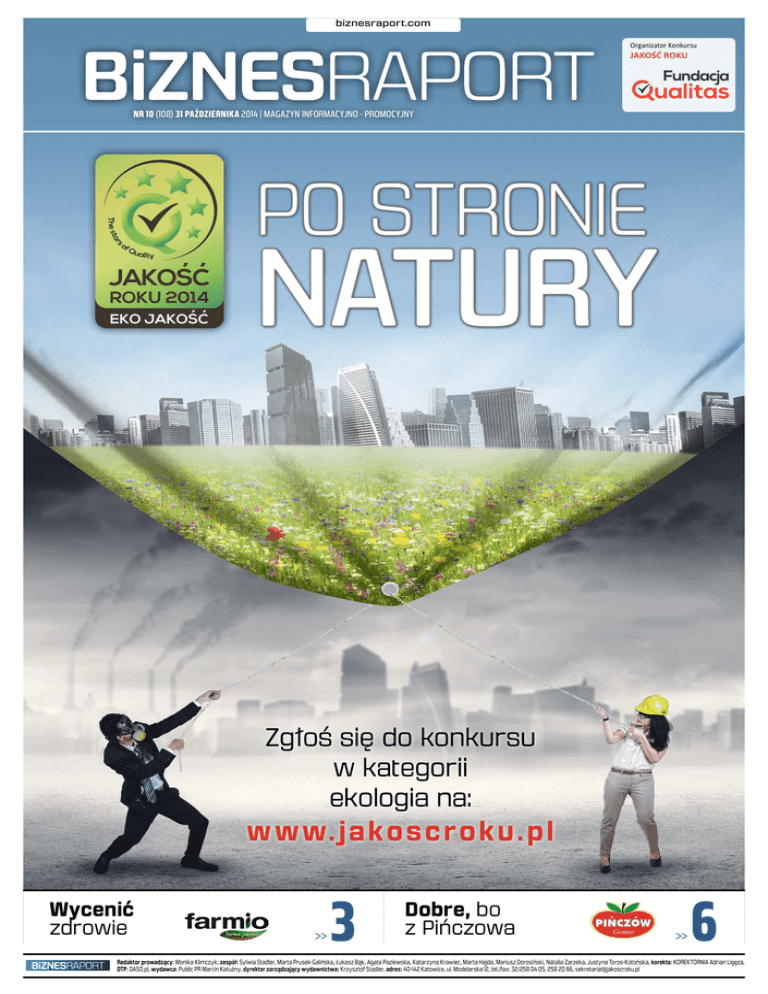 biznesraport.com Organizator Konkursu JAKOŚĆ ROKU nr 10 (108) 31 października 2014 | magazyn INFORMACYJNO - PROMOCYJNY Po stronie natury Zgłoś się do konkursu w kategorii ekologia na: w w w.jakoscroku.pl Wycenić zdrowie >> 3 Dobre, bo z Pińczowa >> 6 Redaktor prowadzący: Monika Klimczyk, zespół: Sylwia Stadler, Marta Prusek-Galińska, Łukasz Bąk, Agata Paziewska, Katarzyna Krawiec, Marta Hajda, Mariusz Dorosiński, Natalia Zarzeka, Justyna Toros-Kotońska, korekta: KOREKTORNIA Adrian Ligęza, DTP: DASO.pl, wydawca: Public PR Marcin Kałużny, dyrektor zarządzający wydawnictwa: Krzysztof Stadler, adres: 40-142 Katowice, ul. Modelarska 12, tel./fax: 32/258 04 05, 258 20 66, [email protected] E2 BR | nr 10 (108) | piątek 31 października 2014 | magazyn Informacyjno-Promocyjny O D R E D A K C J I (Eko)logiczny cel Rozwój nauki i techniki zawsze niesie ze sobą szanse i zagrożenia. Dotyczy to wszystkich obszarów naszego życia, a w szczególności środowiska naturalnego, dzięki któremu egzystujemy, rozwijamy się, po prostu jesteśmy. Już dziś potrafimy doskonale czerpać z wszystkich jego dobrodziejstw, niwelując jednocześnie negatywne skutki ludzkiej ingerencji oraz przewidywać efekty takich działań. B ogaci doświadczeniami epoki industrialnej, jak przystało na społeczeństwo informacyjne, obecnie dostrzegamy wiele perspektyw. Wśród ważnych przymiotów, jakie nas charakteryzują, wyróżnić należy dwa – świadomość i empatię. Te cechy znajdują odzwierciedlenie w kierunkach naszych reakcji i postępowań. Dziś popularyzujemy postawę pro-, i w szczególności dotyczy to ekologii. Przecież środowisko bezpośrednio wpływa na nasze zdrowie czy samopoczucie, a szybkie tempo życia, praca w zamkniętych pomieszczeniach, korki i uliczny hałas wzmagają potrzebę obcowania z naturą. Czując się odpowiedzialnymi za Matkę Ziemię, wymagamy coraz więcej od siebie i od innych. Promujemy recykling, oddając posegregowane odpady wyspecjalizowanym spółkom np. CHIMIREC Polska. Obniżamy straty w zużyciu wody, stosując nowoczesne rozwiązania technologiczne, które dostarcza m.in. „Złote Runo” z Warszawy. Ponadto zwracamy uwagę na pochodzenie i skład towarów. Chcemy wiedzieć, gdzie i jak zostały wyprodukowane. Tak przejrzystą politykę firmy gwarantuje marka FARMIO. Podejmując decyzję o zakupie, często bierzemy pod uwagę niezależne badania i obiektywnie przyznane nagrody, które traktujemy bardzo poważnie. Dlatego program JAKOŚĆ ROKU, wychodząc naprzeciw oczekiwaniom społecznym, umożliwia otrzymanie tytułu w kategorii EKOLOGIA. Zapraszam do lektury wydania poświęconego tej tematyce, a także do zapoznania się z sylwetkami wszystkich przedsiębiorstw prezentowanych w niniejszym wydaniu. GOSPODARKA KOMUNALNA | STRZELECKIE WODOCIĄGI I KANALIZACJA nagrodzone tytułem EKO JAKOŚĆ ROKU 2014 W trosce o przyszłość regionu Województwo opolskie, choć najmniejsze w naszym kraju, może pochwalić się osobami o niebywałym zaangażowaniu w poprawę stanu środowiska naturalnego regionu oraz komfortu życia jego mieszkańców. Mowa o Zarządzie Strzeleckich Wodociągów i Kanalizacji Sp. z o.o. w Strzelcach Opolskich, który dzięki determinacji i pasji towarzyszącej ich codziennej pracy realizuje współfinansowany przez Unię Europejską ze środków Funduszu Spójności w ramach Programu Infrastruktura i Środowisko projekt pn. „Poprawa gospodarki wodno-ściekowej w aglomeracji Strzelce Opolskie”. - Celem projektu jest ochrona znajdującego się na terenie Górnego Śląska triasowego zbiornika wód podziemnych, który zaopatruje w wodę 1/3 mieszkańców województwa i jednocześnie stanowi jeden z największych pod względem zasobności zbiornik w Polsce – informuje Małgorzata Sokołowska, kierownik biura JRP. Realne zagrożenie dla zbiornika stanowią nieskanalizowane obszary aglomeracji i siedlisk wiejskich, które powodują pogorszenie jakości wody podziemnej na tym terenie. Dlatego podjęte przez Zarząd Spółki działania w zakresie gospodarki wodno-ściekowej dążą do zapewnienia mieszkańcom jak najlepszego standardu życia poprzez dostarczanie wody o najwyższej jakości i stworzeniu jak największej ilości mieszkań- com możliwości odprowadzania ścieków do urządzeń kanalizacyjnych – mówi Marian Waloszyński, Prezes Zarządu Strzeleckich Wodociągów i Kanalizacji Sp. z o.o. Rozstrzygnięcie konkursu „BUDOWA KANALIZACJI OCZAMI DZIECKA”. Prace dzieci w wieku przedszkolnym 4-7lat Na dzień dzisiejszy zrealizowano już blisko 90% całego projektu, co przekłada się na wybudowanie ponad 106 km sieci kanalizacyjnej z założonych 122,8 km. – Skala projektu o wartości 120 024 790,75 zł (z czego dofi- stwo wie, jakie wypływają z nich korzyści i tylko wtedy aktywnie angażuje się w ich propagowanie. Będąc tego świadomym Zarząd Spółki, w ramach społecznej odpowiedzialności biznesowej, poza licznymi spotkaniami informacyjnymi z mieszkańcami prowadzi także akcje promocyjno-edukacyjne w miejscowych przedszkolach i szkołach. Efektem wspólnego zaangażowania dzieci i rodziców są liczne prace plastyczne nagradzane w organizowanych przez Spółkę konkursach. Należy zatem stwierdzić, iż postępowanie w myśl powiedzenia „Czym skorupka za młodu nasiąknie…” jest spójne z prowadzoną przez Zarząd Spółki polityką proekologiczną i w sposób jednoznaczny wpływa na świadomość mieszkańców, a tym samym na ustawiczną poprawę jakości życia obecnych i przyszłych pokoleń regionu. Monika Klimczyk 100% odzysku! Synonim nowoczesnego rolnictwa Rozmowa z Piotrem Osińskim, dyrektorem generalnym Väderstad Sp. z o.o. Siewnik do siewu precyzyjnego TEMPO W tych warunkach powstają rozwiązania dedykowane, takie jak siewniki Rapid, Spirit czy Tempo. Väderstad oferuje dwuletnią gwarancję na sprzęt! - Jesteśmy innowatorem i jednym z wiodących producentów w swojej branży. Ofe