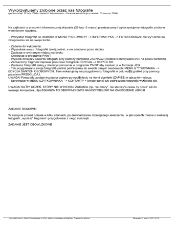 Wykorzystujemy zrobione przez nas fotografie (poniedzia³ek, 27 luty 2006) - Nades³a³ Administrator - Ostatnia aktualizacja (czwartek, 02 marzec 2006) Na zajêciach w pracowni informatycznej aktualnie (27 luty -3 marca) przetwarzamy i wykorzystujemy fotografie zrobione w minionym tygodniu. - Wszystkie fotografie s± dostêpne w MENU PRZEDMIOTY --> INFORMATYKA --> FOTOROBOCZE ale wy³±cznie po zalogowaniu sie na swoje konto. - Zadanie do wykonania: - Wyszukaæ swoj± fotografiê (swój portret, a nie zriobione przez siebie) - Zapisaæ w wybranym miejscu na dysku - Otworzyæ w programie PAINT - Wyci±æ mniejszy kawa³ek fotografii przy pomocy narzêdzia ZAZNACZ (prostok±t przerywana lini± na pasku narzêdzi) - Zaznaczony fragment zapisaæ jako now± fotografiê: EDYCJA --> KOPIUJ DO - Zapisan± fotografiê nale¿y otworzyc ponownie w programie PAINT aby zapisac j± w formacje JPG - Tak przygotowany swoja fotografiê-portret pod³±czamy do swoich danych osobowych: MENU U¯YTKOWNIKA --> EDYCJA DANYCH OSOBOWYCH. Tam wskazujemy na przygotowan± fotografiê w polu wy¶lij grafikê przy pomocy przycisku PRZEGL¡DAJ. UWAGA! Fotografia zostaje wczytana dopiero po naci¶nieciu na ikonê dyskietki (ZAPISZ) w górze formularza. - Sprawdziæ w MENU UZYTKOWNIAKA --> KONTAKTY + [swoje dane] czy pod³±czona fotografia wy¶wietla siê. UWAGA! KA¯DY UCZEÑ, KTÓRY NIE WYKONA£ ZADANIA (np. nie zdazy³, nie starczy³o czasu by dosta³ siê do swojego komputera...itp) ZG£ASZA TO OBOWIAZKOWO NAUCZYCIELOWI NA ZAKOCZENIE LEKCJI ZADANIE DOMOWE: W zeszycie proszê opisaæ w kilku zdaniach, po doswiadczeniu dzisuejszego æwiczenia, w jaki sposób mozna z wiekszej fotografii ,,wyci±æ'' fragment i przygotowaæ z niego ilustracjê. ZADANIE JEST OBOWI¡ZKOWE http://sp65.edu.pl - Szko³a Podstawowa nr 65 im. Alfa Liczmañskiego w Gdañsku Powered by Mambo Generated: 7 March, 2017, 02:15