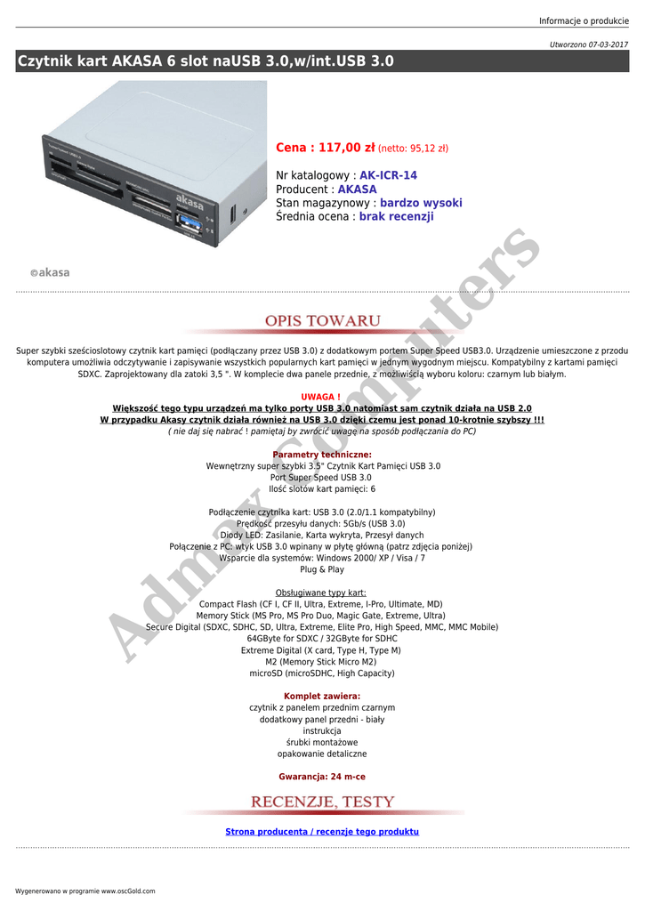 Informacje o produkcie Utworzono 07-03-2017 Czytnik kart AKASA 6 slot naUSB 3.0,w/int.USB 3.0 Cena : 117,00 zł (netto: 95,12 zł) pu te r s Nr katalogowy : AK-ICR-14 Producent : AKASA Stan magazynowy : bardzo wysoki Średnia ocena : brak recenzji Super szybki sześcioslotowy czytnik kart pamięci (podłączany przez USB 3.0) z dodatkowym portem Super Speed USB3.0. Urządzenie umieszczone z przodu komputera umożliwia odczytywanie i zapisywanie wszystkich popularnych kart pamięci w jednym wygodnym miejscu. Kompatybilny z kartami pamięci SDXC. Zaprojektowany dla zatoki 3,5 ". W komplecie dwa panele przednie, z możliwiścią wyboru koloru: czarnym lub białym. C om UWAGA ! Większość tego typu urządzeń ma tylko porty USB 3.0 natomiast sam czytnik działa na USB 2.0 W przypadku Akasy czytnik działa również na USB 3.0 dzięki czemu jest ponad 10-krotnie szybszy !!! ( nie daj się nabrać ! pamiętaj by zwrócić uwagę na sposób podłączania do PC) Parametry techniczne: Wewnętrzny super szybki 3.5" Czytnik Kart Pamięci USB 3.0 Port Super Speed USB 3.0 Ilość slotów kart pamięci: 6 m ax Podłączenie czytnika kart: USB 3.0 (2.0/1.1 kompatybilny) Prędkość przesyłu danych: 5Gb/s (USB 3.0) Diody LED: Zasilanie, Karta wykryta, Przesył danych Połączenie z PC: wtyk USB 3.0 wpinany w płytę główną (patrz zdjęcia poniżej) Wsparcie dla systemów: Windows 2000/ XP / Visa / 7 Plug & Play Ad Obsługiwane typy kart: Compact Flash (CF I, CF II, Ultra, Extreme, I-Pro, Ultimate, MD) Memory Stick (MS Pro, MS Pro Duo, Magic Gate, Extreme, Ultra) Secure Digital (SDXC, SDHC, SD, Ultra, Extreme, Elite Pro, High Speed, MMC, MMC Mobile) 64GByte for SDXC / 32GByte for SDHC Extreme Digital (X card, Type H, Type M) M2 (Memory Stick Micro M2) microSD (microSDHC, High Capacity) Komplet zawiera: czytnik z panelem przednim czarnym dodatkowy panel przedni - biały instrukcja śrubki montażowe opakowanie detaliczne Gwarancja: 24 m-ce kod1014 Strona producenta / recenzje tego produktu Wygenerowano w programie www.oscGold.com