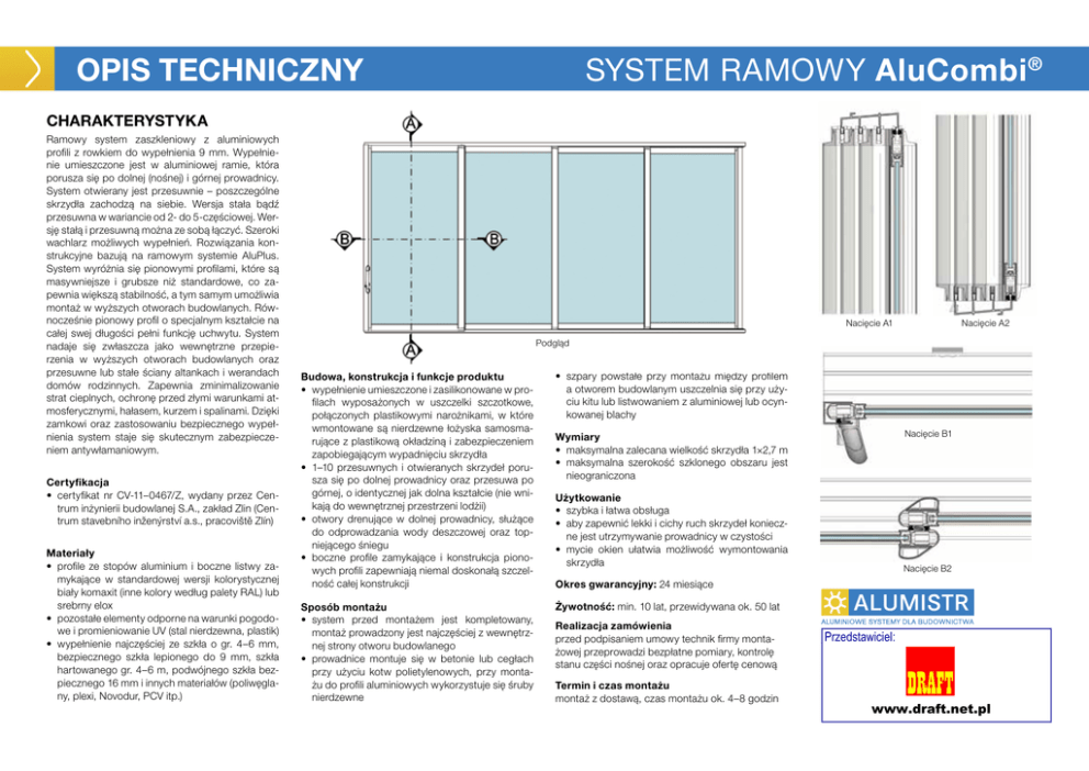 Opis techniczny SYSTEM RAMOWY AluCombi ® CHARAKTERYSTYKA Ramowy system zaszkleniowy z aluminiowych profili z rowkiem do wypełnienia 9 mm. Wypełnienie umieszczone jest w aluminiowej ramie, która porusza się po dolnej (nośnej) i górnej prowadnicy. System otwierany jest przesuwnie – poszczególne skrzydła zachodzą na siebie. Wersja stała bądź przesuwna w wariancie od 2- do 5-częściowej. Wersję stałą i przesuwną można ze sobą łączyć. Szeroki wachlarz możliwych wypełnień. Rozwiązania konstrukcyjne bazują na ramowym systemie AluPlus. System wyróżnia się pionowymi profilami, które są masywniejsze i grubsze niż standardowe, co zapewnia większą stabilność, a tym samym umożliwia montaż w wyższych otworach budowlanych. Równocześnie pionowy profil o specjalnym kształcie na całej swej długości pełni funkcję uchwytu. System nadaje się zwłaszcza jako wewnętrzne przepierzenia w wyższych otworach budowlanych oraz przesuwne lub stałe ściany altankach i werandach domów rodzinnych. Zapewnia zminimalizowanie strat cieplnych, ochronę przed złymi warunkami atmosferycznymi, hałasem, kurzem i spalinami. Dzięki zamkowi oraz zastosowaniu bezpiecznego wypełnienia system staje się skutecznym zabezpieczeniem antywłamaniowym. Certyfikacja •certyfikat nr CV-11–0467/Z, wydany przez Centrum inżynierii budowlanej S.A., zakład Zlin (Centrum stavebního inženýrství a.s., pracoviště Zlín) Materiały •profile ze stopów aluminium i boczne listwy zamykające w standardowej wersji kolorystycznej biały komaxit (inne kolory według palety RAL) lub srebrny elox •pozostałe elementy odporne na warunki pogodowe i promieniowanie UV (stal nierdzewna, plastik) •w ypełnienie najczęściej ze szkła o gr. 4–6 mm, bezpiecznego szkła lepionego do 9 mm, szkła hartowanego gr. 4–6 m, podwójnego szkła bezpiecznego 16 mm i innych materiałów (poliwęglany, plexi, Novodur, PCV itp.) Nacięcie A1 Nacięcie A2 Podgląd Budowa, konstrukcja i funkcje produktu •wypełnienie umieszczone i zasilikonowane w profilach wyposażonych w uszczelki szczotkowe, połączonych plastikowymi narożnikami, w które wmontowane są nierdzewne łożyska samosmarujące z plastikową okładziną i zabezpieczeniem zapobiegającym wypadnięciu skrzydła •1–10 przesuwnych i otwieranych skrzydeł porusza się po dolnej prowadnicy oraz przesuwa po górnej, o identycznej jak dolna kształcie (nie wnikają do wewnętrznej przestrzeni lodżii) •otwory drenujące w dolnej prowadnicy, służące do odprowadzania wody deszczowej oraz topniejącego śniegu •boczne profile zamykające i konstrukcja pionowych profili zapewniają niemal doskonałą szczelność całej konstrukcji •szpary powstałe przy montażu między profilem a otworem budowlanym uszczelnia się przy użyciu kitu lub listwowaniem z aluminiowej lub ocynkowanej blachy Sposób montażu • system przed montażem jest kompletowany, montaż prowadzony jest najczęściej z wewnętrznej strony otworu budowlanego •prowadnice montuje się w betonie lub cegłach przy użyciu kotw polietylenowych, przy montażu do profili aluminiowych wykorzystuje się śruby nierdzewne Żywotność: min. 10 lat, przewidywana ok. 50 lat Wymiary •maksymalna zalecana wielkość skrzydła 1×2,7 m •maksymalna szerokość szklonego obszaru jest nieograniczona Użytkowanie •szybka i łatwa obsługa •aby zapewnić lekki i cichy ruch skrzydeł konieczne jest utrzymywanie prowadnicy w czystości • mycie okien ułatwia możliwość wymontowania skrzydła Nacięcie B1 Nacięcie B2 Okres gwarancyjny: 24 miesiące Realizacja zamówienia przed podpisaniem umowy technik firmy montażowej przeprowadzi bezpłatne pomiary, kontrolę stanu części nośnej oraz opracuje ofertę cenową Termin i czas montażu montaż z dostawą, czas montażu ok. 4–8 godzin Przedstawiciel: ALUMISTR SE U Výzkumu 603, CZ 664 62 Hrušovany u Brna tel.:+420 547 237 231 fax:+420 547 237 230 e-mail: [email protected] www.alumistr.cz www.draft.net.pl
