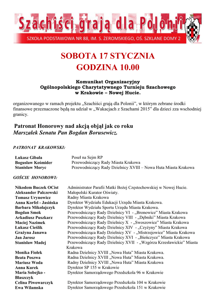 SOBOTA 17 STYCZNIA GODZINA 10.00 Komunikat Organizacyjny Ogólnopolskiego Charytatywnego Turnieju Szachowego w Krakowie – Nowej Hucie. organizowanego w ramach projektu „Szachiści grają dla Polonii”, w którym zebrane środki finansowe przeznaczone będą na udział w „Wakacjach z Szachami 2015” dla dzieci zza wschodniej granicy. Patronat Honorowy nad akcją objął jak co roku Marszałek Senatu Pan Bogdan Borusewicz. PATRONAT KRAKOWSKI: Łukasz Gibała Bogusław Kośmider Stanisław Moryc Poseł na Sejm RP Przewodniczący Rady Miasta Krakowa Przewodniczący Rady Dzielnicy XVIII – Nowa Huta Miasta Krakowa GOŚCIE HONOROWI: Nikodem Buczek OCist Aleksander Palczewski Tomasz Urynowicz Anna Korfel - Jasińska Barbara Mikołajczyk Bogdan Smok Arkadiusz Puszkarz Maciej Nazimek Łukasz Cieślik Grażyna Janawa Jan Jarosz Stanisław Madej Monika Fiołek Beata Poszwa Mariusz Woda Anna Kurek Maria Sobejko Błaszczyk Celina Piwowarczyk Ewa Wilamska Administrator Parafii Matki Bożej Częstochowskiej w Nowej Hucie. Małopolski Kurator Oświaty. Radny Miasta Krakowa Dyrektor Wydziału Edukacji Urzędu Miasta Krakowa. Dyrektor Wydziału Sportu Urzędu Miasta Krakowa. Przewodniczący Rady Dzielnicy VI - „Bronowice” Miasta Krakowa Przewodniczący Rady Dzielnicy VIII - „Dębniki” Miasta Krakowa Przewodniczący Rady Dzielnicy X - „Swoszowice” Miasta Krakowa Przewodniczący Rady Dzielnicy XIV - „Czyżyny” Miasta Krakowa Przewodnicząca Rady Dzielnicy XV - „Mistrzejowice” Miasta Krakowa Przewodniczący Rady Dzielnicy XVI - „Bieńczyce” Miasta Krakowa Przewodniczący Rady Dzielnicy XVII - „Wzgórza Krzesławickie” Miasta Krakowa Radna Dzielnicy XVIII „Nowa Huta” Miasta Krakowa. Radna Dzielnicy XVIII „Nowa Huta” Miasta Krakowa. Radny Dzielnicy XVIII „Nowa Huta” Miasta Krakowa Dyrektor SP 155 w Krakowie Dyrektor Samorządowego Przedszkola 96 w Krakowie Dyrektor Samorządowego Przedszkola 104 w Krakowie Dyrektor Samorządowego Przedszkola 151 w Krakowie 1. Organizatorzy Szkoła Podstawowa nr. 88 im. Stefana Żeromskiego w Krakowie – Nowej Hucie – os. Szklane Domy 2 Ludowo Uczniowski Katolicki Klub Sportowy – LUKKS Kielce 2. Sponsorzy Poseł Łukasz Gibała Rada Dzielnicy XVIII „Nowa Huta” Miasta Krakowa Szkoła Podstawowa Nr 88 w Krakowie Panorama szachowa – miesięcznik szachowy Mat – miesięcznik szachowy Szachista – miesięcznik szachowy 3. Patronat Medialny: Jerzy Moraś Agnieszka Łoś Marcin Warszawski Panorama szachowa Mat Szachista – Panorama szachowa – Głos Nowej Huty – Dziennik Polski – miesięcznik szachowy – miesięcznik szachowy – miesięcznik szachowy 4. Termin i miejsce rozgrywek Zawody odbędą się w dniu 17 stycznia 2015 r. (sobota) w Szkole Podstawowej nr 88 w Krakowie – Nowej Hucie os. Szklane Domy 2 o godz. 10:00. 5. Zgłoszenia Zgłoszenia do turnieju mogą być dokonywane poprzez stronę: http://www.chessarbiter.com, lub do sędziego turnieju Marka Czepca na adres [email protected] w nieprzekraczalnym terminie do 15 stycznia 2015 roku 6. Grupy turniejowe: A – dzieci urodzone w roku 2003 i młodsze. B - pozostali 7. Wpisowe: Grupa A - w wysokości 10,00 PLN * Grupa B – w wysokości 15,00 PLN * *- uczniowie SP 88 Kraków płacą 50% wpisowego. Wpisowe w całości będzie przeznaczone na niezwykle szczytny cel, tj. na realizację projektu „Szachiści grają dla Polonii” – organizację wakacyjnego obozu szachowego dla polskich dzieci spoza granic Polski. 8. Przepisy, system i tempo gry: Turniej rozgrywany będzie systemem szwajcarskim, na dystansie 7 rund w dwóch grupach. Tempo gry wynosić będzie 15 minut dla zawodnika. 9. Kolejność miejsc: Decyduje suma zdobytych punktów, przy równej ilości punktów decyduje punktacja pomocnicza w kolejności: 1.Buchholz średni 2.Buchholz 3.Liczba zwycięstw 4.Progress. 10. Nagrody: Ze względu na charytatywny charakter zawodów nie przewiduje się nagród pieniężnych. Zwycięzcy grup otrzymają odpowiednio: Grupa A chłopcy Puchar Posła RP Pana Łukasza Gibały. dziewczęta - Puchar Przewodniczącego Rady Miasta Krakowa Pana Bogusława Kośmidera Nadto W grupie A – spośród uczestników zostanie wylosowana 1 dziewczynka oraz 1 chłopiec do lat 12 (rocznik 2003 i młodszy) którzy wraz z opiekunem uzyskują prawo do wyjazdu na Finał akcji „Szachiści grają dla Polonii”, który zostanie rozegrany w I kwartale 2015 w Senacie RP w Warszawie. Grupa B Chłopcy - Puchar Przewodniczącego Rady Dzielnicy XVIII „Nowa Huta” Miasta Krakowa – Pana Stanisława Moryca Dziewczęta – Puchar Dyrektora Szkoły Podstawowej Nr 88 w Krakowie – Pani Anny Mroczkowskiej W obu grupach pamiątkowe medale oraz dyplomy. 11. Uwagi końcowe Wszystkie osoby niepełnoletnie powinny przebywać na turnieju pod opieką osób pełnoletnich. OSTATECZNA INTERPRETACJA KOMUNIKATU NALEŻY DO ORGANIZATORÓW. Zapraszamy wszystkich miłośników królewskiej gry