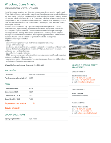 Wrocław, Stare Miasto LOKAL BIUROWY W OVO / WYNAJEM Lokal biurowy o powierzchni 54 m kw, mieszczący się na trzeciej kondygnacji OVO. OVO offices to najbardziej prestiżowe i komfortowe powierzchnie biurowe we Wrocławiu. Unikalne, a jednocześnie funkcjonalne biura OVO oferują więcej niż typowe lokale użytkowe klasy A. Doskonała lokalizacja i dostęp do licznych udogodnień to nie jedyne korzyści wynikające z położenia w inwestycji, która daje właścicielom i najemcom biur wygodę i renomę na jakie pozwolić mogą sobie tylko nieliczni. Na OVO Wrocław składa się 5-gwiazdkowy hotel z dedykowaną częścią konferencyjną, apartamenty, spa i centrum fitness, najwyższej klasy biura i ekskluzywna część handlowa. OVO Wrocław odzwierciedla dynamiczną i kosmopolityczną naturę Wrocławia, łączy biznes z kulturą. Swoje miejsce znajdą tu wiodące światowe marki. Ponad połowę powierzchni OVO Wrocław zajmuje Double Tree by Hilton - 5-gwiazdkowy hotel należący do międzynarodowej sieci hoteli. ZALETY: - usytuowanie w prestiżowym budynku o rozpoznawalnej bryle - usługa OVO Concierge - elastyczne powierzchnie oraz wydajny wskaźnik powierzchni netto do brutto - dostęp do licznych udogodnień obiektu OVO (m.in. luksusowe centrum wellness, spa i krytego basenu) - całodobowa recepcja i ochrona - BMS - nowoczesny system kontroli i sterowania systemami bezpieczeństwa pożarowego, kontroli dostępu itp) - wewnętrzne patio z dostępem do kawiarni, restauracji oraz części handlowej - podziemny, dwupoziomowy parking Więcej informacji: Ania Szkopek 514 706 683 SZCZEGÓŁY Lokalizacja KONTAKT W SPRAWIE OFERTY IGM-LW-15839 OPIEKUN OFERTY Wrocław Stare Miasto Powierzchnia całkowita [m2] 54.00 Dział mieszkaniowy tel.: +48 (0)71/79 666 00 tel. kom.: +48 (0)71/79 666 00 e-mail: [email protected] CENA Cena najmu / PLN 4 104 Cena najmu / EUR 4 104 Cena / 1mKW / PLN 76.00 Cena / 1mKW / EUR 76.00 Sugerowana rata kredytu 21 Anna Szkopek Nr Licencji osoby odp.: MANAGER BIURA Kamila Kaczorowska tel.: +48 (0)71/79 666 00 tel. kom.: +48 514 706 681 e-mail: [email protected] Zapytaj o kredyt! OPŁATY DODATKOWE Opłaty wg liczników OPIEKUN OFERTY prąd, woda