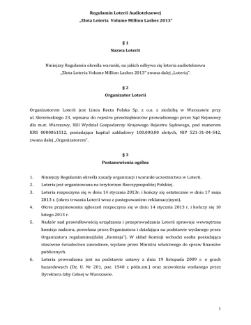 Regulamin Loterii Audioteksowej „Złota Loteria Volume Million Lashes 2013” §1 Nazwa Loterii Niniejszy Regulamin określa warunki, na jakich odbywa się loteria audioteksowa „Złota Loteria Volume Million Lashes 2013” zwana dalej „Loterią”. §2 Organizator Loterii Organizatorem Loterii jest Linea Recta Polska Sp. z o.o. z siedzibą w Warszawie przy ul. Skrzetuskiego 23, wpisana do rejestru przedsiębiorców prowadzonego przez Sąd Rejonowy dla m.st. Warszawy, XIII Wydział Gospodarczy Krajowego Rejestru Sądowego, pod numerem KRS 0000061512, posiadająca kapitał zakładowy 100.000,00 złotych, NIP 521-31-04-542, zwana dalej „Organizatorem”. §3 Postanowienia ogólne 1. Niniejszy Regulamin określa zasady organizacji i warunki uczestnictwa w Loterii. 2. Loteria jest organizowana na terytorium Rzeczypospolitej Polskiej . 3. Loteria rozpoczyna się w dniu 14 stycznia 2013r. i kończy się ostatecznie w dniu 17 maja 2013 r. (okres trwania Loterii wraz z postępowaniem reklamacyjnym). 4. Okres przyjmowania zgłoszeń rozpoczyna się w dniu 14 stycznia 2013 r. i kończy się 10 lutego 2013 r. 5. Nadzór nad prawidłowością urządzania i przeprowadzania Loterii sprawuje wewnętrzna komisja nadzoru, powołana przez Organizatora i działająca na podstawie wydanego przez Organizatora regulaminu(dalej „Komisja”). W skład Komisji wchodzi osoba posiadająca stosowne świadectwo zawodowe, wydane przez Ministra właściwego do spraw finansów publicznych. 6. Loteria prowadzona jest na podstawie ustawy z dnia 19 listopada 2009 r. o grach hazardowych (Dz. U. Nr 201, poz. 1540 z późn.zm.) oraz zezwolenia wydanego przez Dyrektora Izby Celnej w Warszawie. 1 §4 Uczestnicy Loterii, zasady i jej przebieg 1. Udział w Loterii mogą brać tylko osoby fizyczne, które ukończyły 18 lat, zamieszkałe na terytorium Polski, posiadające pełną zdolność do czynności prawnych, nabywające określone w niniejszym regulaminie Produkty Promocyjne. 2. Nagród w Loterii nie mogą otrzymać pracownicy oraz członkowie rodzin pracowników Organizatora oraz Firmy L'ORÉAL Polska Sp. z o.o., z siedzibą przy ul. Daniszewska 4, 03230 w Warszawie. 3. Przez członków rodziny, o których mowa w ust. 2 powyżej, rozumie się: wstępnych, zstępnych, rodzeństwo, małżonków, małżonków i zstępnych rodzeństwa, rodziców i rodzeństwo małżonków oraz osoby pozostające w stosunku przysposobienia. 4. W Loterii biorą udział następujące produkty marki L'ORÉAL PARIS: VOLUME MILLION LASHES BLACK VOLUME MILLION LASHES BROWN VOLUME MILLION LASHES EXTRA BLACK VOLUME MILION LASHES WODOODPORNA VOLUME MILLION LASHES EXCESS BLACK VOLUME MILLION LASHES LUMINIZER BROWN VOLUME MILLION LASHES LUMINIZER BLUE VOLUME MILLION LASHES LUMINIZER GREEN VOLUME MILLION LASHES LUMINIZER HAZEL zwane „Produktami Promocyjnymi”. 5. Sprzedaż Produktów Promocyjnych rozpoczyna się w dniu 14 stycznia 2013 r. i trwa do 10 lutego 2013r. Poza tym okresem Produkty Promocyjne są dostępne w sprzedaży, jednak ich zakup nie uprawnia do udziału w Loterii. 6. Uczestnikiem Loterii może być każda osoba fizyczna, o której mowa w ust. 1, (dalej „Uczestnik”), która w okresie od dnia 14 stycznia 2013 r. do 10 lutego 2013r. spełnia łącznie następujące warunki: 1) Dokona jednorazowo zakupu, co najmniej jednego Produktu Promocyjnego potwierdzonego dowodem zakupu - paragonem. 2) Dokona prawidłowego zgłoszenia swojego udziału w Loterii na zasadach określonych w ust. 7 (dalej „Zgłoszenie”). 3) Zachowa oryginał dowodu zakupu -paragon 7. Uczestnicy dokonują Zgłoszenia w Loterii w następujący sposób: 1. za pomocą wiadomości tekstowej SMS, wysłanej na numer 70856 o następującej treści: VML. Numer z paragonu (np.: VML.1234567). Koszt SMS to 0,50 zł bez VAT(0,62 zł z VAT). Koszt wysłania wiadomości SMS ponoszą Uczestnicy Loterii. W 2 odpowiedzi na prawidłowo przesłane Zgłoszenie, Uczestnicy otrzymują zwrotnego, bezpłatnego SMS-a informującego o przyjęciu ich Zgłoszenia do Loterii . O terminie dostarczenia Zgłoszenia decyduje data wpłynięcia Zgłoszenia do Organizatora. 8. Jeden paragon uprawnia do dokonania jednego Zgłoszenia w loterii. Jeśli Uczestnik zgłosi wielokrotnie ten sam numer z paragonu, Organizator do udziału w Loterii przyjmuje tylko jedno, pierwsze prawidłowe Zgłoszenie z tym numerem z paragonu. Kolejne Zgłoszenia z tym samym numerem z paragonu są pomijane w Loterii. 9. Przesłanie większej liczby numerów z paragonów w jednym Zgłoszeniu za pomocą wiadomości tekstowej SMS, traktowane jest jako 1 (jedno) Zgłoszenie. Zgłoszeniem jest pierwszy wpisany do Zgłoszenia numer z paragonu 10. Do udziału w Loterii Organizator przyjmuje Zgłoszenia zawierające zarówno małe, jak i duże litery. W rozumieniu niniejszego Regulaminu, pojęcie „takie samo Zgłoszenie” oznacza Zgłoszenie o tym samym ciągu literowo-numerycznym, niezależnie od wielkości wpisanych liter, np. VML.1234567 jest to, takie same Zgłoszenie co: vml.1234567, Vml.1234567, vML.1234567 itd. 11. Termin wysyłania Zgłoszeń rozpoczyna się 14 stycznia 2013r. o godzinie 00:00:00 i mija 10 lutego 2013r. o godz. 23:59:59. Decyduje data i godzina otrzymania Zgłoszenia przez Organizatora. 12. Zgłoszenia niekompletne lub wypełnione nieprawidłowo są nieważne. 13. Ilekroć w niniejszym Regulaminie jest mowa o dotarciu Zgłoszenia do Organizatora, należy przez to rozumieć wpływ Zgłoszenia na serwer systemu teleinformatycznego przyjmującego Zgłoszenie . 14. Dowód zakupu (paragon) potwierdza zakup Produktów Promocyjnych, jeżeli spełnia następujące warunki: 1) Paragon jest prawdziwy, tzn. został wystawiony przez sklep, którego nazwa i adres się na nim znajdują i nie jest podrobiony lub sfałszowany; 2) Paragon jest czytelny; 3) W liście zakupów na paragonie widnieje oznaczenie pozwalające stwierdzić, iż zakup dotyczy Produktów Promocyjnych, w przypadku braku możliwości stwierdz