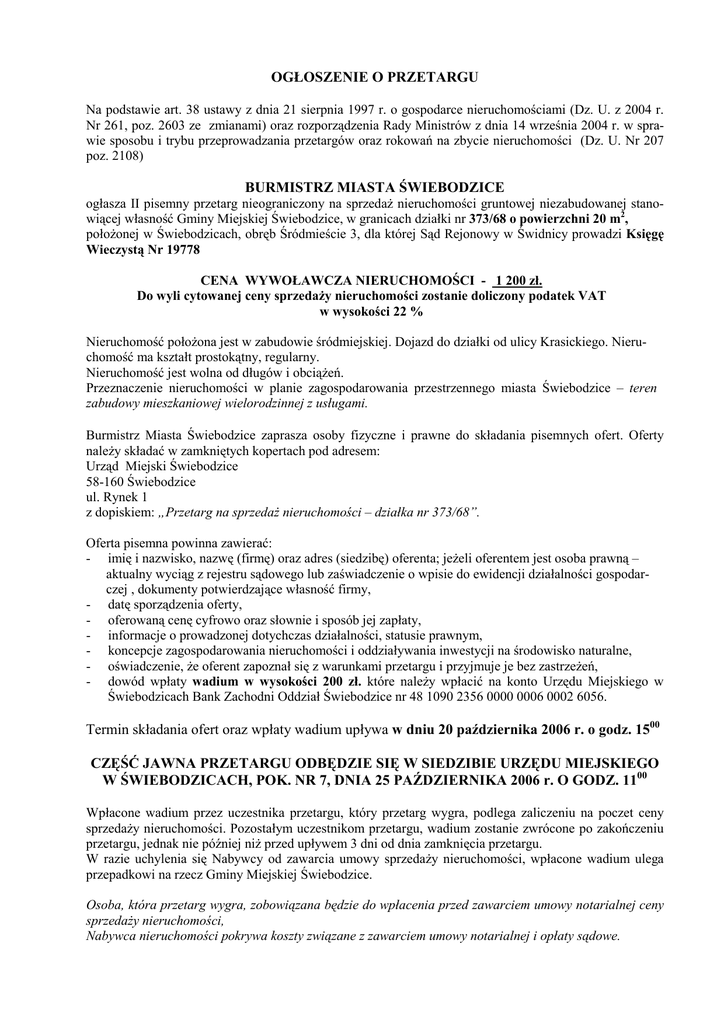 OGŁOSZENIE O PRZETARGU Na podstawie art. 38 ustawy z dnia 21 sierpnia 1997 r. o gospodarce nieruchomościami (Dz. U. z 2004 r. Nr 261, poz. 2603 ze zmianami) oraz rozporządzenia Rady Ministrów z dnia 14 września 2004 r. w sprawie sposobu i trybu przeprowadzania przetargów oraz rokowań na zbycie nieruchomości (Dz. U. Nr 207 poz. 2108) BURMISTRZ MIASTA ŚWIEBODZICE ogłasza II pisemny przetarg nieograniczony na sprzedaŜ nieruchomości gruntowej niezabudowanej stanowiącej własność Gminy Miejskiej Świebodzice, w granicach działki nr 373/68 o powierzchni 20 m2, połoŜonej w Świebodzicach, obręb Śródmieście 3, dla której Sąd Rejonowy w Świdnicy prowadzi Księgę Wieczystą Nr 19778 CENA WYWOŁAWCZA NIERUCHOMOŚCI - 1 200 zł. Do wyli cytowanej ceny sprzedaŜy nieruchomości zostanie doliczony podatek VAT w wysokości 22 % Nieruchomość połoŜona jest w zabudowie śródmiejskiej. Dojazd do działki od ulicy Krasickiego. Nieruchomość ma kształt prostokątny, regularny. Nieruchomość jest wolna od długów i obciąŜeń. Przeznaczenie nieruchomości w planie zagospodarowania przestrzennego miasta Świebodzice – teren zabudowy mieszkaniowej wielorodzinnej z usługami. Burmistrz Miasta Świebodzice zaprasza osoby fizyczne i prawne do składania pisemnych ofert. Oferty naleŜy składać w zamkniętych kopertach pod adresem: Urząd Miejski Świebodzice 58-160 Świebodzice ul. Rynek 1 z dopiskiem: „Przetarg na sprzedaŜ nieruchomości – działka nr 373/68”. Oferta pisemna powinna zawierać: - imię i nazwisko, nazwę (firmę) oraz adres (siedzibę) oferenta; jeŜeli oferentem jest osoba prawną – aktualny wyciąg z rejestru sądowego lub zaświadczenie o wpisie do ewidencji działalności gospodarczej , dokumenty potwierdzające własność firmy, - datę sporządzenia oferty, - oferowaną cenę cyfrowo oraz słownie i sposób jej zapłaty, - informacje o prowadzonej dotychczas działalności, statusie prawnym, - koncepcje zagospodarowania nieruchomości i oddziaływania inwestycji na środowisko naturalne, - oświadczenie, Ŝe oferent zapoznał się z warunkami przetargu i przyjmuje je bez zastrzeŜeń, - dowód wpłaty wadium w wysokości 200 zł. które naleŜy wpłacić na konto Urzędu Miejskiego w Świebodzicach Bank Zachodni Oddział Świebodzice nr 48 1090 2356 0000 0006 0002 6056. Termin składania ofert oraz wpłaty wadium upływa w dniu 20 października 2006 r. o godz. 1500 CZĘŚĆ JAWNA PRZETARGU ODBĘDZIE SIĘ W SIEDZIBIE URZĘDU MIEJSKIEGO W ŚWIEBODZICACH, POK. NR 7, DNIA 25 PAŹDZIERNIKA 2006 r. O GODZ. 1100 Wpłacone wadium przez uczestnika przetargu, który przetarg wygra, podlega zaliczeniu na poczet ceny sprzedaŜy nieruchomości. Pozostałym uczestnikom przetargu, wadium zostanie zwrócone po zakończeniu przetargu, jednak nie później niŜ przed upływem 3 dni od dnia zamknięcia przetargu. W razie uchylenia się Nabywcy od zawarcia umowy sprzedaŜy nieruchomości, wpłacone wadium ulega przepadkowi na rzecz Gminy Miejskiej Świebodzice. Osoba, która przetarg wygra, zobowiązana będzie do wpłacenia przed zawarciem umowy notarialnej ceny sprzedaŜy nieruchomości, Nabywca nieruchomości pokrywa koszty związane z zawarciem umowy notarialnej i opłaty sądowe. Burmistrz Miasta Świebodzice zastrzega sobie prawo swobodnego wyboru oferty, jak teŜ prawo zamknięcia przetargu bez wybrania którejkolwiek oferty. Osoby nabywające nieruchomość na rzecz firmy, powinny posiadać przy sobie pisemne pełnomocnictwo lub dokumenty potwierdzające własność firmy. Pełnomocnicy nabywający nieruchomość w imieniu osób fizycznych powinni posiadać przy sobie notarialne pełnomocnictwo tych osób, o ile będą w ich imieniu przystępować do umowy notarialnej, natomiast w przypadku reprezentowania innych osób wyłącznie w przetargu, winni posiadać oświadczenie z potwierdzonym przez notariusza podpisem upowaŜniającego. Wszelkie informacje dotyczące przedmiotu przetargu moŜna uzyskać w Wydziale Rolnictwa, Geodezji i Gospodarki Gruntami Urzędu Miejskiego w Świebodzicach, Rynek 1, pok. 15, tel. 0 74 666 95 25 Świebodzice, 11.09.2006 r.