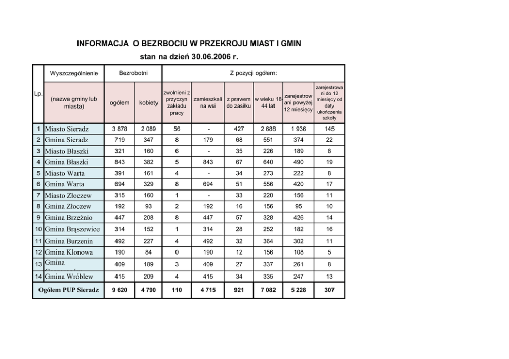 Bezrobocie w podziale na gminy na dzień 30.06.2006 r.