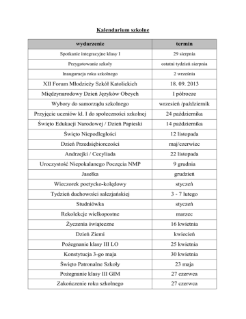 Kalendarium szkolne wydarzenie termin Spotkanie integracyjne klasy I 29 sierpnia Przygotowanie szkoły ostatni tydzień sierpnia Inauguracja roku szkolnego 2 września XII Forum Młodzieży Szkół Katolickich 18. 09. 2013 Międzynarodowy Dzień Języków Obcych I półrocze Wybory do samorządu szkolnego wrzesień /październik Przyjęcie uczniów kl. I do społeczności szkolnej 24 października Święto Edukacji Narodowej / Dzień Papieski 14 października Święto Niepodległości 12 listopada Dzień Przedsiębiorczości maj/czerwiec Andrzejki / Cecyliada 22 listopada Uroczystość Niepokalanego Poczęcia NMP 9 grudnia Jasełka grudzień Wieczorek poetycko-kolędowy styczeń Tydzień duchowości salezjańskiej 3 - 7 lutego Studniówka styczeń Rekolekcje wielkopostne marzec Życzenia świąteczne 16 kwietnia Dzień Ziemi kwiecień Pożegnanie klasy III LO 25 kwietnia Konstytucja 3-go maja 30 kwietnia Święto Patronalne Szkoły 23 maja Pożegnanie klasy III GIM 27 czerwca Zakończenie roku szkolnego 27 czerwca