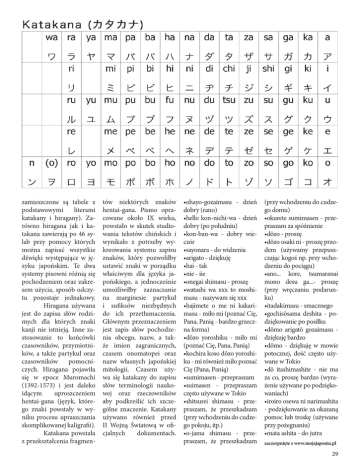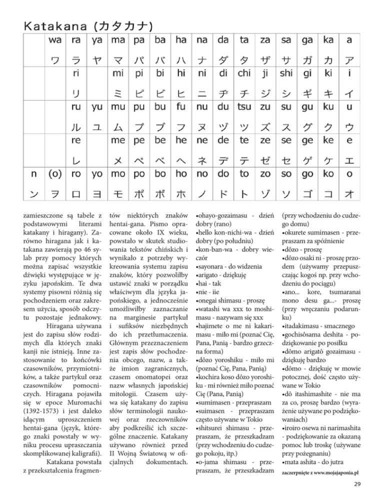 zamieszczone są tabele z podstawowymi literami katakany i hiragany). Zarówno hiragana jak i katakana zawierają po 46 sylab przy pomocy których można zapisać wszystkie dźwięki występujące w języku japońskim. Te dwa systemy pisowni różnią się pochodzeniem oraz zakresem użycia, sposób odczytu pozostaje jednakowy. Hiragana używana jest do zapisu słów rodzimych dla których znaki kanji nie istnieją. Inne zastosowanie to końcówki czasowników, przymiotników, a także partykuł oraz czasowników pomocniczych. Hiragana pojawiła się w epoce Muromachi (1392-1573) i jest daleko idącym uproszczeniem hentai-gana (język, którego znaki powstały w wyniku procesu upraszczania skomplikowanej kaligrafii). Katakana powstała z przekształcenia fragmen- tów niektórych znaków hentai-gana. Pismo opracowane około IX wieku, powstało w skutek studiowania tekstów chińskich i wynikało z potrzeby wykreowania systemu zapisu znaków, który pozwoliłby ustawić znaki w porządku właściwym dla języka japońskiego, a jednocześnie umożliwiłby zaznaczanie na marginesie partykuł i sufiksów niezbędnych do ich przetłumaczenia. Głównym przeznaczeniem jest zapis słów pochodzenia obcego, nazw, a także imion zagranicznych, czasem onomatopei oraz nazw własnych japońskiej mitologii. Czasem używa się katakany do zapisu słów terminologii naukowej oraz rzeczowników aby podkreślić ich szczególne znaczenie. Katakany używano również przed II Wojną Światową w oficjalnych dokumentach. •ohayo-gozaimasu - dzień dobry (rano) •hello kon-nichi-wa - dzień dobry (po południu) •kon-ban-wa - dobry wieczór •sayonara - do widzenia •arigato - dziękuję •hai - tak •nie - iie •onegai shimasu - proszę •watashi wa xxx to moshimasu - nazywam się xxx •hajimete o me ni kakarimasu - miło mi (poznać Cię, Pana, Panią - bardzo grzeczna forma) •dôzo yoroshiku - miło mi (poznać Cię, Pana, Panią) •kochira koso dôzo yoroshiku - mi również miło poznać Cię (Pana, Panią) •sumimasen - przepraszam •suimasen - przepraszam często używane w Tokio •shitsurei shimasu - przepraszam, że przeszkadzam (przy wchodzeniu do cudzego pokoju, itp.) •o-jama shimasu - przepraszam, że przeszkadzam (przy wchodzeniu do cudzego domu) •okurete sumimasen - przepraszam za spóźnienie •dôzo - proszę •dôzo osaki ni - proszę przodem (używamy przepuszczając kogoś np. przy wchodzeniu do pociągu) •ano... kore, tsumaranai mono desu ga...- proszę (przy wręczaniu podarunku) •itadakimasu - smacznego •gochisôsama deshita - podziękowanie po posiłku •dômo arigatô gozaimasu dziękuję bardzo •dômo - dziękuję w mowie potocznej, dość często używane w Tokio •dô itashimashite - nie ma za co, proszę bardzo (wyrażenie używane po podziękowaniach) •iroiro osewa ni narimashita - podziękowanie za okazaną pomoc lub troskę (używane przy pożegnaniu) •mata ashita - do jutra zaczerpnięte z www.mojajaponia.pl 29