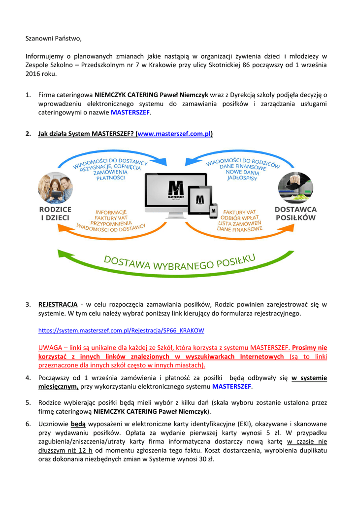 Szanowni Państwo, Informujemy o planowanych zmianach jakie nastąpią w organizacji żywienia dzieci i młodzieży w Zespole Szkolno – Przedszkolnym nr 7 w Krakowie przy ulicy Skotnickiej 86 począwszy od 1 września 2016 roku. 1. Firma cateringowa NIEMCZYK CATERING Paweł Niemczyk wraz z Dyrekcją szkoły podjęła decyzję o wprowadzeniu elektronicznego systemu do zamawiania posiłków i zarządzania usługami cateringowymi o nazwie MASTERSZEF. 2. Jak działa System MASTERSZEF? (www.masterszef.com.pl) 3. REJESTRACJA - w celu rozpoczęcia zamawiania posiłków, Rodzic powinien zarejestrować się w systemie. W tym celu należy wybrać poniższy link kierujący do formularza rejestracyjnego. https://system.masterszef.com.pl/Rejestracja/SP66_KRAKOW UWAGA – linki są unikalne dla każdej ze Szkół, która korzysta z systemu MASTERSZEF. Prosimy nie korzystać z innych linków znalezionych w wyszukiwarkach Internetowych (są to linki przeznaczone dla innych szkół często w innych miastach). 4. Począwszy od 1 września zamówienia i płatność za posiłki będą odbywały się w systemie miesięcznym, przy wykorzystaniu elektronicznego systemu MASTERSZEF. 5. Rodzice wybierając posiłki będą mieli wybór z kilku dań (skala wyboru zostanie ustalona przez firmę cateringową NIEMCZYK CATERING Paweł Niemczyk). 6. Uczniowie będą wyposażeni w elektroniczne karty identyfikacyjne (EKI), okazywane i skanowane przy wydawaniu posiłków. Opłata za wydanie pierwszej karty wynosi 5 zł. W przypadku zagubienia/zniszczenia/utraty karty firma informatyczna dostarczy nową kartę w czasie nie dłuższym niż 12 h od momentu zgłoszenia tego faktu. Koszt dostarczenia, wyrobienia duplikatu oraz dokonania niezbędnych zmian w Systemie wynosi 30 zł. 7. Rezygnacje z posiłku dokonywane są w systemie MASTERSZEF lub poprzez SMS-y wysyłane do Systemu – komunikacja z maszyną, ściśle ustalone zasady wysyłania wiadomości. Rezygnacje telefoniczne i mailowe nie będą uwzględniane. Rezygnacji można dokonać najpóźniej w dniu wydania posiłku do godziny 8.00. 8. Formy opłaty za złożone zamówienie (do wyboru). a. Przelew tradycyjny dokonywany na indywidualne konto bankowe każdego użytkownika (System automatycznie nadaje numer konta każdej osobie). b. Przelew natychmiastowy on-line (Przelewy 24) – istnieje dodatkowa opłata administracyjna pobierana przez operatora bankowego w wysokości 1,5% wartości zamówienia 9. Ochrona danych osobowych, aspekty prawne Wszystkie funkcje Systemu MASTERSZEF zostały skonsultowane prawnie i odpowiadają aktualnym wymogom jakie są stawiane przed tego typu produktami informatycznymi. Dane osobowe są gromadzone i przetwarzane przez firmę MS Systems Sp. z o.o. wyłącznie w celu obsługi posiłków w szkole i nie będą wykorzystywane w żadnym innym zakresie. Baza danych należąca do firmy MS Systems Sp. z o.o. jest zgłoszona do GIODO, firma posiada zgłoszonego Administratora Danych Osobowych i jest obsługiwana przez zewnętrznego wyspecjalizowanego audytora. 10. PYTANIA? Jeżeli będą Państwo mieli pytania dotyczące działania systemu MASTERSZEF prosimy o kontakt z Kierownikiem Projektu MASTERSZEF Systems Panią Joanną Wierzejską: [email protected] telefon 22 110 50 07 w godzinach 8-16 od poniedziałku do piątku.