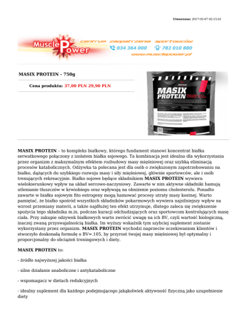 Utworzono: 2017-03-07 02:15:41 MASIX PROTEIN - 750g Cena produktu: 37,00 PLN 29,90 PLN MASIX PROTEIN – to kompleks białkowy, którego fundament stanowi koncentrat białka serwatkowego połączony z izolatem białka sojowego. Ta kombinacja jest idealna dla wykorzystania przez organizm z maksymalnym efektem rozbudowy masy mięśniowej oraz szybką eliminacją procesów katabolicznych. Odżywka ta polecana jest dla osób o zwiększonym zapotrzebowaniu na białko, dążących do szybkiego rozwoju masy i siły mięśniowej, głównie sportowców, ale i osób trenujących rekreacyjnie. Białko sojowe będące składnikiem MASIX PROTEIN wywiera wielokierunkowy wpływ na układ sercowo-naczyniowy. Zawarte w nim aktywne składniki hamują utlenianie tłuszczów w krwiobiegu oraz wpływają na obniżenie poziomu cholesterolu. Ponadto zawarte w białku sojowym fito estrogeny mogą hamować procesy utraty masy kostnej. Warto pamiętać, że białko spośród wszystkich składników pokarmowych wywiera najsilniejszy wpływ na wzrost przemiany materii, a także najdłużej ten efekt utrzymuje, dlatego zaleca się zwiększenie spożycia tego składnika m.in. podczas kuracji odchudzających oraz sportowcom kontrolujących masę ciała. Przy zakupie odzywek białkowych warto zwrócić uwagę na ich BV, czyli wartość biologiczną, inaczej zwaną przyswajalnością białka. Im wyższy wskaźnik tym szybciej suplement zostanie wykorzystany przez organizm. MASIX PROTEIN wychodzi naprzeciw oczekiwaniom klientów i stworzyło doskonałą formułę o BV=.105, by przyrost twojej masy mięśniowej był optymalny i proporcjonalny do obciążeń treningowych i diety. MASIX PROTEIN to: - źródło najwyższej jakości białka - silne działanie anaboliczne i antykataboliczne - wspomagacz w dietach redukcyjnych - idealny suplement dla każdego podejmującego jakąkolwiek aktywność fizyczną jako uzupełnienie diety Skład: Porcja: 30 g Porcji w opakowaniu: 25 Opakowanie: 750 g Wartość odżywcza w 100 g Glicyna 1,56 g L-alanina 4,17 g L-walina 4,95 g L-leucyna 10,84 g L-izoleucyna 5,51 g L-seryna 4,04 g L-treonina 5,03 g L-cystyna/L-cysteina 1.81 g L-metionina 2,20 g L-fenyloalanina 2,98 g L-tyrozyna 2,64 g L-tryptofan 1,51 g L-prolina 4,90 g Kwas L-Asparaginowy 9,34 g Kwas L-Glutaminowy/ L-Glutamina 18,0 g L-lizyna 7,89 g L-arginina 2,41 g L-histydyna 1,61 g Oxyprolina 0,22 g Dawkowanie: Porcję 30g wymieszać z 200 – 250ml wody lub mleka. ilość Adres: http://www.muscle.trustnet.pl/ 750g Telefon: 34 36 43 000, 782 010 880 Email: [email protected]