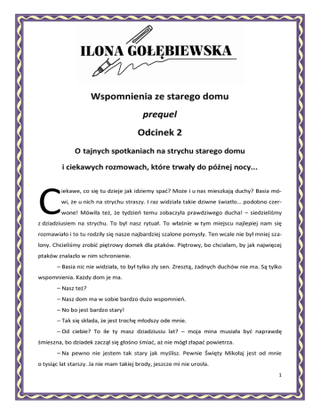 Wspomnienia ze starego domu prequel Odcinek 2 O tajnych spotkaniach na strychu starego domu i ciekawych rozmowach, które trwały do późnej nocy... C iekawe, co się tu dzieje jak idziemy spad? Może i u nas mieszkają duchy? Basia mówi, że u nich na strychu straszy. I raz widziała takie dziwne światło… podobno czerwone! Mówiła też, że tydzieo temu zobaczyła prawdziwego ducha! – siedzieliśmy z dziadziusiem na strychu. To był nasz rytuał. To właśnie w tym miejscu najlepiej nam się rozmawiało i to tu rodziły się nasze najbardziej szalone pomysły. Ten wcale nie był mniej szalony. Chcieliśmy zrobid piętrowy domek dla ptaków. Piętrowy, bo chciałam, by jak najwięcej ptaków znalazło w nim schronienie. – Basia nic nie widziała, to był tylko zły sen. Zresztą, żadnych duchów nie ma. Są tylko wspomnienia. Każdy dom je ma. – Nasz też? – Nasz dom ma w sobie bardzo dużo wspomnieo. – No bo jest bardzo stary! – Tak się składa, że jest trochę młodszy ode mnie. – Od ciebie? To ile ty masz dziadziusiu lat? – moja mina musiała byd naprawdę śmieszna, bo dziadek zaczął się głośno śmiad, aż nie mógł złapad powietrza. – Na pewno nie jestem tak stary jak myślisz. Pewnie Święty Mikołaj jest od mnie o tysiąc lat starszy. Ja nie mam takiej brody, jeszcze mi nie urosła. 1 – Mikołaj ma ponad miliard lat. Tak myślę… A nasz dom ile ma lat? – Widzisz słoneczko drogie... ten dom wybudowałem razem z twoją babcią. – Naprawdę? Jak to zrobiłeś? – Byliśmy wtedy z babcią bardzo młodzi, tuż po ślubie. Chcieliśmy mied własny dom. Nawet nie wyobrażaliśmy sobie, że mógłby stanąd w innym miejscu niż Pniewo. – Jesteśmy tutaj od zawsze? – Tak... od zawsze. Właśnie tutaj jest nasz dom... nasze miejsce. – A potem był mój tata i jak był mały, to cały czas był niegrzeczny. – Czasami był grzeczny, ale jak to chłopak, wiele razy sprowadził na siebie duże problemy. Razem z babcią martwiliśmy się, że wyrośnie na solidnego łobuza, ale na szczęście jak dorósł, stał się rozsądnym człowiekiem. Potem zakochał się w twojej mamie, wzięli ślub... – I też tutaj mieszkali! Cały czas mieszkają! – Wszystko się zgadza. Potem pojawiłaś się ty i mamy rodzinkę w komplecie. – Ja też zawsze będę mieszkad w starym domu! – Różnie może byd... ale będziesz mogła zawsze tutaj przyjeżdżad i nas odwiedzad. – Dziadku! Ale ja nie chcę nigdzie się stąd wyprowadzad! – Doskonale o tym wiem. Tutaj zawsze będzie twój dom. Na zawsze... – Na zawsze… Budujemy karmik czy nie? – Musimy, przecież trzeba dbad o naszych przyjaciół z sadu. – One też chcą mied domek tak jak i ja. Każdy musi mied swój dom. – Dom to ważna sprawa w życiu. W żadnym innym miejscu nie będziesz czuła się tak dobrze jak tutaj. I zawsze ktoś będzie na ciebie czekał. – Dziadziusiu... mówisz tak dziwnie. Dom to dom i koniec! Teraz już wiem, że dziadek chciał mi przekazad, że dom i rodzina są czymś najcenniejszym w życiu, ale i ja miałam trochę racji. Dom to dom. W tym słowie zamknięte są największe uczucia, jakich można doświadczyd w życiu. Człowiek wędruje po świecie w poszukiwaniu szczęścia i w koocu wraca do domu, bo tylko tu może je odnaleźd. Dom to mama i tata, dom to dziadkowie, dom to rodzeostwo. Nie ma innej definicji. A może... jest odwrotnie. Każdy człowiek ma własną definicję domu. Bo dom to ludzie, doświadczenia, uczucia, myśli, wspomnienia. A te są różne. Trzeba tylko zamknąd oczy i przenieśd się do swojego domu. 2 Wspomnienia mają niebywałą moc. Dzięki nim człowiek nie zapomina o tym, kim jest, skąd pochodzi, co było dla niego kiedyś ważne. Jak porównuję siebie teraz i z okresu dzieciostwa, to tak sobie myślę, że jeszcze trochę siedzi we mnie tej radości małej Alicji. Stary dom i związane z nim liczne chwile szczęścia dały mi siłę na pokonanie wszystkich życiowych burz i nie pozwoliły na zwątpienie w siebie oraz w to, że jeszcze kiedyś moje życie wróci na właściwy tor. A teraz jestem tutaj... siedzę przykryta ciepłym kocem na mojej werandzie. Oglądam spadające liście i nie mogę się nadziwid, że życie jest tak wspaniałe! Stary dom... moja przystao... historia mojej rodziny. Często wracam pamięcią do tych wszystkich chwil, które dawno temu wydawały mi się czymś danym raz na zawsze. Nigdy bym nawet nie dopuściła myśli, że to wszystko mogę stracid w tak krótkim czasie. Naiwne to było myślenie… Życie szybko nauczyło mnie, że szczęście w jednej chwili może się rozpaśd na miliony kawałków. Teraz dobrze to wiem… czasu nie cofnę… nie ma obok mnie rodziców i dziadków, a jeszcze przed chwilą los zabrał mi najmniejszą nadzieję na szczęście. Znowu trzeba było się podnosid po upadku i próbowad od nowa. Bo człowieka można zniszczyd, ale nie pokonad. Ciężki to był czas, przepełniony smutkiem i strachem, że już nigdy nie uda mi się znaleźd właściwej drogi. Tylko wspomnienia… tylko one dawały mi siłę, by każdego dnia stawiad kolejny krok… przypominały o moich korzeniach. Teraz już wiem, jak wiele zawdzięczam tym drewnianym ścianom i ludziom, dla których stary, drewniany dom był bezpiecznym chronieniem przed każdym gorszym momentem w życiu. Pamięd o nich stała się źródłem mojej siły… każda rozmowa, gest, spojrzenie są ze mną do dzisiaj i nie pozwalają zapomnied o moim dzieciostwie. KONIEC Odcinka 2 Odcinek 3 ukaże się we wtorek, 20 grudnia 2016 r., www.ilonagolebiewska.pl 3