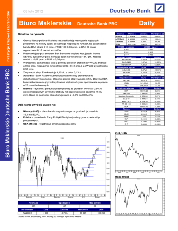 Inwestycje krajowe i zagraniczne Biuro Maklerskie Deutsche Bank PBC 08 luty 2012 Biuro Maklerskie Wartość Zmiana Obrót (mln zł) WIG20 2 374,64 -0,65% 683,54 mWIG40 2 428,99 -0,11% 158,43 sWIG80 9 884,14 0,89% 80,49 41 912,98 -0,41% 987,35 Ostatnio na rynkach: Indeks Greccy liderzy polityczni kolejny raz przekładają rozwiązanie naglących problemów na kolejny dzień, co wzmaga niepokój na rynkach. Na zakończenie handlu DAX stracił 0,16 proc., FTSE 100 0,03 proc., a CAC 40 zdołał wypracować 0,18 procent wzrostów. Przemawiający prze senatem Ben Bernanke wspiera kupujących. Indeks S&P500 zyskał 0,20 proc. kończąc dzień na wysokości 1347 pkt., Nasdaq wzrósł o 0,07 proc., a DJIA o 0,26 proc. Warszawski parkiet nadal traci z powodu greckich problemów. WIG20 zniżkuje o 0,65 proc, nieznacznie mniej stracił WIG (-0,41 proc.), a sWIG80 zyskał blisko 0,90 proc. Złoty nadal silny. Euro kosztuje 4,15 zł., a dolar 3,13 zł. Australia –Bank Rezerw Australii pozostawił stopy procentowe na dotychczasowym poziomie. Obecnie główna stopy wynosi 4,25%. Decyzja RBA była zaskoczeniem, gdyż zdecydowana większość rynku spodziewała się cięcia o 25 punktów bazowych. Niemcy – dynamika produkcji przemysłowej za grudzień wyniosła -2,9% w ujęciu miesięcznym. Wynik był słabszy niż oczekiwania na poziomie -0,4% m/m. Dane za poprzedni okres korygowano z -0,6% do 0,0% m/m. Daily Deutsche Bank PBC WIG WIG20 - wsparcia WIG20 - opory 2 364 2 390 2 331 2 415 2 317 Kurs Zmiana INTERBUD 7,00 zł 25,00% BARLINEK 1,67 zł 12,80% HBPOLSKA 1,26 zł 12,50% Największe spadki Kurs Zmiana ADVADIS 0,07 zł -12,50% BIOTON 0,10 zł -9,10% YAWAL 6,20 zł -7,70% Najaktywniesi Kurs Obrót (mln zł) PKOBP 35,70 zł 101,52 KGHM 141,80 zł 96,56 PZU 346,00 zł 77,62 Indeksy światowe Wartość Zmiana DJIA 12 878,20 0,26% S&P 500 1 347,05 0,20% Nasdaq Composite 2 904,08 0,07% CAC 40 3 411,54 0,18% Xetra DAX 6 754,20 -0,16% FT-SE 100 5 890,26 -0,03% BUX 19 655,70 -1,23% Nazwa Kurs Zmiana Dziś warto zwrócić uwagę na: Niemcy (8:00) – bilans handlu zagranicznego za grudzień (poprzednio 15,1 mld EUR). Polska – posiedzenie Rady Polityki Pieniężnej – decyzja w sprawie stóp procentowych. USA (16:30) – tygodniowa zmiana zapasów paliw 2 433 Największe wzrosty Złoto 1 748,4 1,36% Miedź 8 535,0 0,25% Ropa 116,2 0,23% EUR 4,1818 -0,05% USD 3,1806 -0,87% CHF 3,4633 -0,18% EUR/USD EUR/USD 1.46 1.45 1.44 1.43 1.42 WIG20 2450 1.41 1.40 2400 1.39 1.38 1.37 1.36 2350 1.35 1.34 1.33 2300 1.32 1.31 1.30 1.29 2250 1.28 1.27 1.26 2200 1.25 22 29 5 12 September 19 26 3 10 October 17 24 31 7 14 November 21 28 5 12 December 19 26 2 9 2012 16 23 30 6 13 February 20 2150 Ropa Brent BRENT OIL 2100 119 118 117 116 115 2050 114 113 112 111 2000 16 22 29 5 12 September 19 26 3 10 October 17 24 31 7 14 November 21 28 5 12 December 19 27 2 9 2012 16 23 30 6 13 February 110 109 20 108 107 106 105 Rosnące Spadające Bez Zmian 175 167 69 103 102 101 Instrument Kurs Zmiana Wolumen LOP FW20H12 2 390 -0,79% 39 821 113 260 źródło: GPW, Bloomberg, NBP, money.pl, stooq.pl, wyliczenia własne 104 100 99 98 22 29 5 12 September 19 26 3 10 October 17 24 31 7 14 November 21 28 5 12 December 19 27 3 9 2012 16 23 30 6 13 February 20 Grecja nadal przekłada decyzje na jutro S&P500 S&P500 Wczorajsza sesja zakończyła się spadkami większość europejskich indeksów, czego przyczyną ponownie była Grecja. I choć nic się nie zmieniło w temacie zadłużenia, to niepokój wzbudzają tamtejsi liderzy polityczni, którzy po raz kolejny przełożyli spotkanie w sprawie warunków na których Ateny otrzymają drugi pakiet pomocowy. Wczoraj prasa donosiła, że spotkanie to odbędzie się o 11:00, potem o 15:00, a ostatecznie potwierdzone przez rzecznika rządu na godzinę 20:00 zostało przełożone na dziś z powodu niedostarczenia liderom politycznym projektu umowy w sprawie warunków otrzymania przez Grecję drugiego pakietu ratunkowego. Inwestorzy wydają się być coraz bardziej zniecierpliwieni zachowaniem ateńskich polityków, którzy w obliczu kolejnych masowych strajków oraz powiększającego się z każdym dniem zadłużenia nie potrafią zmobilizować się do działania oraz współpracy i po raz kolejny przekładają sprawy wagi państwowej na następny dzień. Wszystko to przekłada się na rynkowe niepokoje, nie sprzyjające zakupom akcji. Przez większość dnia główne indeksy traciły około jednego procenta. Na zakończenie handlu DAX stracił 0,16 proc., FTSE 100 0,03 proc., a CAC 40 zdołał wypracować 0,18 procent wzrostów. Przed południem nastroje dodatkowo popsuły dane z Niemiec. W grudniu produkcja przemysłowa spadła tam o -2,9 proc w ujęciu miesiąc do miesiąca. Były to dane o wiele gorsze od rynkowych przewidywań, które kształtowały się na poziomie 0,4 proc. W ujęciu rok do roku produkcja przemysłowa wzrosła o 0,9 proc., wobec 4,4 proc. poprzednio. 1370 1360 1350 1340 1330 1320 1310 1300 1290 1280 1270 1260 1250 1240 1230 1220 1210 1200 1190 1180 1170 1160 1150 1140 1130 1120 1110 1100 1090 1080 1070 1060 22 29 6 12 19 26 3 10 September October 17 24 31 7 14 21 28 5 12 19 27 3 9 November December 2012 17 23 30 6 13 February 20 mWIG 40 mWIG40 2450 2400 2350 2300 2250 2200 2150 2100 Bernanke wspiera kupujących 2050 Wczoraj po południu szef Fedu przemawiając przed senacką komisją budżetową zapewnił, że zrobi wszystko by uchronić amerykańską gospodarkę przed skutkami kryzysu w Europie. Słowa te pozytywnie wpłynęły na inwestorów na Wall Street. Indeks S&P500 zyskał 0,20 proc. kończąc dzień na wysokości 1347 pkt., Nasdaq wzrósł o 0,07 proc., a DJIA o 0,26 proc. Ben Bernanke wypowiedział się krytycznie na temat obecnej sytuacji na rynku pracy i to pomimo, że cotygodniowa liczba nowych bezrobotnych spada (utrzymuje się poniżej 400 tys.), a stopa bezrobocia niespodziewanie stopniała z 8,5 do 8,3 proc. Zdaniem szefa Fedu rynek pracy jest nadal niestabilny,
