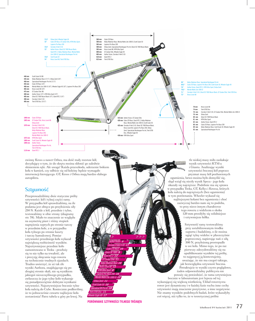 71,5° 72° 72,5° 73° 73,5° 74° 440 mm 445 mm 450 mm 455 mm 460 mm 465 mm 475 mm 480 mm 485 mm 490 mm 495 mm 1060 mm 1065 mm 1070 mm 1075 mm 1080 mm 1090 mm 1110 mm Orbea Zenit, Wheeler Eagle 40 Cube LTD Race, GT Zaskar Elite, KTM Ultra Sport, Lapierre Pro Race 200 Corratec X-Vert S 03 Author Vision, Ghost SE 7000 Recon Black, Giant XTC 2, Kellys Madman Race, Merida Matts Lite 1000-D, Specialized Rockhopper Pro Int Scott Scale 50 Kross Level A8, Trek 6700 Disc 560 mm 580 mm 585 mm 590 mm 595 mm 600 mm 605 mm 610 mm 615 mm Cube LTD Race Kellys Madman Race, Merida Matts Lite 1000-D, Scott Scale 50 Lapierre Pro Race 200 Orbea Zenit, Specialized Rockhopper Pro Int, Ghost SE 7000 Recon Black Kross Level A8, KTM Ultra Sport GT Zaskar Elite, Wheeler Eagle 40 Author Vision, Corratec X-Vert S 03 Giant XTC 2 Trek 6700 Disc Scott Scale 50 (M) Kellys Madman Race (17.5”), Orbea Zenit (18”) Specialized Rockhopper Pro Int (17.5”) Cube LTD Race (18”) Merida Matts Lite 1000-D (18”), Wheeler Eagle 40 (18”), Lapierre Pro Race 200 Kross Level A8 (18”) GT Zaskar Elite (M) Author Vision (19”), KTM Ultra Sport (19”) Ghost SE 7000 Recon Black (19”), Giant XTC 2 (19”) Corratec X-Vert S 03 Trek 6700 Disc (19.5”) 69 ° 69,5 ° 70 ° 70,5 ° 71 ° 72 ° Cube LTD Race GT Zaskar Elite, Kross Level A8, Orbea Zenit Corratec X-Vert S 03, Ghost SE 7000 Recon Black, Kellys Madman Race, Lapierre Pro Race 200, Merida Matts Lite 1000-D KTM Ultra Sport Scott Scale 50, Wheeler Eagle 40 Author Vision, Specialized Rockhopper Pro Int, Trek 6700 Disc Giant XTC 2 415 mm Author Vision, GT Zaskar Elite 420 mm Cube LTD Race, Giant XTC 2, Kellys Madman Race, Merida Matts Lite 1000-D, Scott Scale 50 425 mm Corratec X-Vert S 03, Ghost SE 7000 Recon Black, Kross Level A8, Lapierre Pro Race 200, Orbea Zenit, Specialized Rockhopper Pro Int, Trek 6700 Disc, Wheeler Eagle 40 430 mm KTM Ultra Sport zwinny Kross a nawet Orbea, ma dość mały rozstaw kół, decydujący o tym, że do skrętu można skłonić go zaledwie skinieniem ręki. Ale uwaga! Każda przeszkoda, uderzenie bokiem koła w kamień, czy odbicie się od koleiny będzie wymagało interwencji kierującego. GT, Kross i Orbea mają bardzo słabego autopilota. Sztywność Przeprowadziliśmy dwie statyczne próby sztywności: kół i tylnej części ramy. W przypadku kół sprawdzaliśmy, na ile podatna jest obręcz po przyłożeniu siły 250 N. Każde z kół, przednie i tylne, testowaliśmy w obie strony (diagramy str. 78). Miało to znaczenie ze względu na asymetrię piast i różny stopień naprężenia szprych po stronie tarczy w przednim kole, a w przypadku koła tylnego po stronie kasety i tarczy hamulcowej. Pomiar sztywności przedniego koła wykazał największą rozbieżność wyników. Najsztywniejsze przednie koło zamontowano w Treku - przełoży się to nie tylko na trwałość, ale i precyzję skręcania tego roweru na technicznie trudnych zjazdach. Trudno uwierzyć, że aż tak złe wyniki Authora, znajdującego się po drugiej stronie skali, nie są wynikiem jakiegoś nieszczęśliwego przypadku, zwłaszcza że jego tylne koło wykazuje się ponadprzeciętnie dobrymi wynikami sztywności. Najsztywniejsze bocznie tylne koła należą do Cube. Koniecznie podkreślmy, że to jednocześnie czwarte najlżejsze koła zestawienia! Patrz tabela u góry po lewej. Na Author Vision - 9 Corratec X-Vert S 03 - 17 Cube LTD Race -10 Ghost SE 7000 - 8 Giant XTC 2 -13 GT Zaskar Elite -11 Kellys Madman Race -10 Kross Level A8 -12 KTM Ultra Sport -8 Lapierre Pro Race 200 -16 Merida Matts Lite 1000-D -12 Orbea Zenit -11 Scott Scale 50 -10 Specialized RH Pro Int -10 Trek 6700 Disc - 11 Wheeler Eagle 40 -17 Kellys Madman Race, Specialized Rockhopper Pro Int Cube LTD Race, Lapierre Pro Race 200, Scott Scale 50, Wheeler Eagle 40 Author Vision, Giant XTC 2, KTM Ultra Sport, Oreba Zenit Merida Matts Lite 1000-D Corratec X-Vert S 03, Ghost SE 7000 Recon Black, GT Zaskar Elite, Trek 6700 Disc Kross Level A8 70 mm 74 mm 76 mm 78 mm 80 mm 81 mm 82 mm 86 mm 89 mm 93 mm Kross Level A8 Trek 6700 Disc Corratec X-Vert S 03, GT Zaskar Elite, Merida Matts Lite 1000-D Orbea Zenit Ghost SE 7000 Recon Black KTM Ultra Sport Author Vision, Giant XTC 2 Cube LTD Race, Lapierre Pro Race 200 Kellys Madman Race, Scott Scale 50, Wheeler Eagle 40 Specialized Rockhopper Pro Int tle niskiej masy miło zaskakuje wynik sztywności KTM-a i Gianta. Analizując wyniki sztywności bocznej kół poprzez pryzmat masy kół pozbawionych ogumienia, łatwo można było domyślić się, skąd wziął się niezły wynik Speca - jego koła okazały się najcięższe. Podobnie ma się sprawa w przypadku Treka, GT, Kellys i Krossa, których koła należą do najcięższych (bez ogumienia) w tym porównaniu. Wheeler wykazał się najlżejszymi kołami bez ogumienia i choć zazwyczaj bardzo nam się to podoba, to przy nieco innym charakterze tego roweru z widelcem o skoku 120 mm prosiłyby się solidniejsze i sztywniejsze kółka. Sztywność ramy testowaliśmy przy ustabilizowanym środku suportu i badaliśmy, o ile można ugiąć tylny widelec w płaszczyźnie poprzecznej, napierając nań z siłą 500 N, przyłożoną prostopadle w osi koła. Mimo tego, że po raz pierwszy zdecydowaliśmy się na opublikowanie wyników tej próby, to najgoręcej ją kontestujemy, uważając, że nie ma czegoś takiego, jak bezwzględna sztywność boczna. Potraktujcie te wyniki czysto poglądowo, żaden odpowiedzialny publicysta nie poważy się powiedzieć, że rama sztywniejsza bocznie w laboratorium jest lepsza od tej wykazującej się większą wiotkością. Układ rowerzystarower jest dynamiczny i w każdej fazie ruchu inne cechy sztywności mają znaczenie pozytywne, a inne negatywne. Nie znamy wyników podobnych badań, które wykazałyby coś więcej, niż tylko to, że w teoretycznej próbie PORÓWNANIE SZTYWNOŚCI TYLNEGO TRÓJKĄTA b i keB o a r d # 4 kwi ec i eń 2 011 77