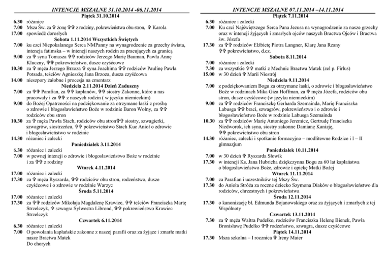 INTENCJE MSZALNE 31.10.2014 -06.11.2014 Piątek 31.10.2014 6.30 różaniec 7.00 Msza Św. za żonę z rodziny, pokrewieństwa obu stron, Karola 17.00 spowiedź dorosłych Sobota 1.11.2014 Wszystkich Świętych 7.00 ku czci Niepokalanego Serca NMPanny na wynagrodzenie za grzechy świata, intencja fatimska – w intencji naszych rodzin za pracujących za granicą 9.00 za syna Tomasza rodziców Jerzego Marię Bauman, Pawła Annę Kluczny, pokrewieństwo, dusze czyśćcowe 10.30 za męża Jerzego Brzoza syna Joachima rodziców Paulinę Pawła Potsada, teściów Agnieszkę Jana Brzoza, dusza czyśćcowa 14.00 nieszpory żałobne i procesja na cmentarz Niedziela 2.11.2014 Dzień Zaduszny 7.00 za Parafian, za kapłanów, siostry Zakonne, które u nas pracowały i za z naszych rodzin ( w języku niemieckim) 9.00 do Bożej Opatrzności na podziękowanie za otrzymane łaski z prośbą o zdrowie i błogosławieństwo Boże w rodzinie Baron Wolny, za rodziców obu stron 10.30 za męża Pawła Stach, rodziców obu stron siostry, szwagierki, szwagrów, siostrzeńca, pokrewieństwo Stach Kuc Anioł o zdrowie i błogosławieństwo w rodzinie 14.30 różaniec i zalecki Poniedziałek 3.11.2014 6.30 różaniec i zalecki 7.00 w pewnej intencji o zdrowie i błogosławieństwo Boże w rodzinie i za z rodziny Wtorek 4.11.2014 17.00 różaniec i zalecki 17.30 za męża Ryszarda, rodziców obu stron, rodzeństwo, dusze czyśćcowe i o zdrowie w rodzinie Warzyc Środa 5.11.2014 17.00 różaniec i zalecki 17.30 za rodziców Mikołaja Magdalenę Krawiec, teściów Franciszka Martę Strzelczyk, szwagra Sylwestra Librond, pokrewieństwo Krawiec Strzelczyk Czwartek 6.11.2014 6.30 różaniec i zalecki 7.00 O powołania kapłańskie zakonne z naszej parafii oraz za żyjące i zmarłe matki nasze Bractwa Matek Do chorych INTENCJE MSZALNE 07.11.2014 –14.11.2014 Piątek 7.11.2014 6.30 różaniec i zalecki 7.00 Ku czci Najświętszego Serca Pana Jezusa na wynagrodzenie za nasze grzechy oraz w intencji żyjących i zmarłych ojców naszych Bractwa Ojców i Bractwa św. Józefa 17.30 za rodziców Elżbietę Piotra Langner, Klarę Jana Rzany pokrewieństwo, d.cz. Sobota 8.11.2014 7.00 różaniec i zalecki 7.30 za wszystkie matki z Mechnic Bractwa Matek (zel p. Firlus) 15.00 w 30 dzień Marii Niestrój Niedziela 9.11.2014 7.00 z podziękowaniem Bogu za otrzymane łaski, o zdrowie i błogosławieństwo Boże w rodzinach Mika Giza Hoffman, za męża Józefa, rodziców obu stron, dusze czyśćcowe (w języku niemieckim) 9.00 za rodziców Franciszkę Gerharda Szemainda, Marię Franciszka Labusga braci, szwagrów, pokrewieństwo i o zdrowie i błogosławieństwo Boże w rodzinie Labusga Szemainda 10.30 za rodziców Marię Antoniego Jeremicz, Gertrudę Franciszka Niedworok, ich syna, siostry zakonne Damianę Kanizję, pokrewieństwo obu stron 14.30 różaniec, zalecki i spotkanie formacyjno – modlitewne Rodzice i I – II gimnazjum Poniedziałek 10.11.2014 7.00 w 30 dzień Ryszarda Słowik 17.30 w intencji Ks. Jana Hubricha dziękczynna Bogu za 60 lat kapłaństwa o błogosławieństwo Boże, zdrowie i opiekę Matki Bożej Wtorek 11.11.2014 7.00 za Parafian i uczestników tej Mszy Św. 17.30 do Anioła Stróża za roczne dziecko Szymona Diaków o błogosławieństwo dla rodziców, chrzestnych i pokrewieństwa Środa 12.11.2014 17.30 o kanonizację bł. Edmunda Bojanowskiego oraz za żyjących i zmarłych z tej Wspólnoty Czwartek 13.11.2014 7.30 za męża Waltra Pudełko, rodziców Franciszka Helenę Bienek, Pawła Bronisławę Pudełko rodzeństwo, szwagra, dusze czyśćcowe Piątek 14.11.2014 17.30 Msza szkolna – I rocznica Ireny Maier INTENCJE MSZALNE 15.11.2014 – 23.11.2014 7.30 13.00 7.00 9.00 10.30 14.30 7.00 7.00 17.30 17.30 17.30 7.30 15.00 7.00 9.00 10.30 14.30 Sobota 15.11.2014 za osoby z 3 Róży Różańcowej Marię Leja, Elżbietę Marię Przybyla, Augustynę Firlus, Marię Niedziela, Teresę Kubis (zel. P. Firlus) z okazji 60. rocznicy sakramentu małżeństwa Jadwigi Karola Nowak z podziękowaniem Bogu za otrzymane łaski oraz z prośbą o zdrowie i opiekę Bożą Niedziela 16.11.2014 za rodziców obu stron Wieschala, Glomb, wnuka Łukasza, 3 braci, 3 szwagrów o zdrowie i błogosławieństwo Boże w rodzinie za rodziców Kluczny, Szymainda rodzeństwo, pokrewieństwo, dusze czyśćcowe, o zdrowie i błogosławieństwo Boże w rodzinie z podziękowaniem Bogu za otrzymane łaski z prośbą o zdrowie i błogosławieństwo w rodzinie Urszuli i Krzysztofa Pudełko zalecki i różaniec + spotkanie formacyjno – modlitewne Rodzice i młodzież III klasy gimnazjum Poniedziałek 17.11.2014 za Elżbietę Krzysztofa Sosnowskich - z rodziny Wtorek 18.11.2014 za męża z rodziny pokrewieństwo i dusze czyśćcowe Środa 19.11.2014 I rocznica Klary Niedziela Czwartek 20.11.2014 za ochrzczone dziecko Xavier Giedrojć o opiekę Anioła Stróża i błogosławieństwo Boże dla rodziców, chrzestnych, rodziny i dziadków Piątek 21.11.2014 Msza szkolna, za Annę Kotula Sobota 22.11.2014 z podziękowaniem Bogu za odebrane łaski z prośbą o opiekę Bożą z okazji urodzin 65 lat Melanii Polednia roczne dziecko Dominik Swientek, o opiekę Anioła Stróża oraz o błogosławieństwo Boże Matki Bożej w 40. rocznicę urodzin dla męża Rafała Niedziela 23.11.2014 za męża Józefa Wieczorek, rodziców Franciszka Marię Wodarz, Antoniego Marię Wieczorek, Krystynę Waltra Baron, wnuka, siostrę zakonną Goiaris, o błogosławieństwo w rodzinie za rodziców Klarę Stefana Fonfara, brata Jana, siostrę Helenę i o zdrowie i błogosławieństwo Boże w rodzinie Fonfara Mikoś Sopa o opiekę Anioła Stróża za roczne dziecko Michała Baucz oraz o błogosławieństwo Boże dla rodziców i chrzestnych zalecki i różaniec + spotkanie formacyjno – modlitewne Rodziców i dzieci I Komunijnych 26 października 2014 Nr 233 www.parafia.chroscina.eu „Wróćmy do modlitwy w naszych rodzinach za żyjących i zmarłych!” Rodzina doświa