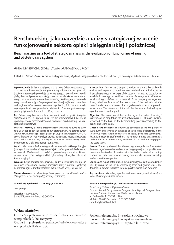 226 Probl Hig Epidemiol 2009, 90(2): 226-232 Benchmarking jako narzędzie analizy strategicznej w ocenie funkcjonowania sektora opieki pielęgniarskiej i położniczej Benchmarking as a tool of strategic analysis in the evaluation of functioning of nursing and obstetric care system Anna Ksykiewicz-Dorota, Sylwia Gradowska-Burczyk Katedra i Zakład Zarządzania w Pielęgniarstwie, Wydział Pielęgniarstwa i Nauk o Zdrowiu, Uniwersytet Medyczny w Lublinie Wprowadzenie. Zmieniająca się sytuacja na rynku świadczeń zdrowotnych oraz rosnąca konkurencja związana z ograniczonym dostępem do środków finansowych powoduje, że osoby zarządzające sektorem opieki pielęgniarskiej i położniczej szukają coraz to bardziej skutecznych metod zarządzania. W piśmiennictwie benchmarking określany jest jako metoda zarządzania instytucją, która polega na identyfikacji najlepszych sposobów realizacji procesów zarówno wewnątrz organizacji, jak i poza nią, w celu wykorzystania ich do usprawnienia działalności. Punktem porównawczym powinny być wyniki instytucji o zbliżonym profilu. Introduction. Due to the changing situation on the market of health services, and a growing competition associated with the limited access to financial resources, the managers of the sector of nursing and obstetric care search for increasingly more efficient methods of management. In literature, benchmarking is defined as a method of the company management through the identification of the best modes of the realization of the internal and external processes of an organization in order to improve its performance. The reference point should be the results obtained by an organization of a similar profile. Cel. Celem pracy była ocena funkcjonowania sektora opieki pielęgniarskiej/położniczej w szpitalach na terenie województwa lubelskiego i podkarpackiego przeprowadzona na podstawie benchmarkingu w skali graficznej i punktowej. Objective. The evaluation of the functioning of the sector of nursing/ obstetric care in hospitals in the area of two regions: Lublin and Rzeszów, performed on the basis of the benchmarking process according to the graphic and score scales. Materiał i metody. Badania przeprowadzono w okresie od 2005 do 2007 roku w 24 szpitalach trzech poziomów referencyjnych, na terenie dwóch województw: lubelskiego i podkarpackiego. Grupę badawczą stanowiło 289 osób z kierowniczej kadry pielęgniarskiej/położniczej. Metodą badawczą była analiza strategiczna, techniką – badania ankietowe, narzędziami: benchmarking w skali graficznej i punktowej. Material and methods. The study was conducted during the period of 2005-2007 and covered 24 hospitals of three levels of reference, in the area of two regions: Lublin and Rzeszów. The study group were 289 nursing/ obstetric managerial staff members. The research method was a strategic analysis, the technique – a survey, and the tool: the benchmarking graphic and score scales. Wyniki. Kierownicza kadra pielęgniarska własne jednostki organizacyjne (skala graficzna benchmarkingu) ocenia jako porównywalne lub słabsze od wzorcowych. W odniesieniu do badań przeprowadzonych w skali punktowej, własny sektor opieki pielęgniarskiej był oceniany także jako słabszy od konkurencyjnych. Results. The study showed that the nursing managerial staff estimated their own organizational units (benchmarking graphics) as comparable to, or lower than the standard. In relation with the studies conducted according to the score scale, own sector of nursing care was also assessed as being weaker than the competition. Wnioski. Część badanej pielęgniarskiej kadry kierowniczej wzoruje się na innych jednostkach, stosując narzędzia: skalę punktową i graficzną benchmarkingu. Jednostki wzorcowe były ocenione wyżej, niż własne. Conclusions. A part of the studied nursing managerial staff followed other units by using the tools of benchmarking score and graphic scales. The standard units were evaluated in more positive terms than own ones. Słowa kluczowe: benchmarking (skala graficzna i punktowa), analiza strategiczna, sektor opieki pielęgniarskiej i położniczej Key words: benchmarking (graphic and score scales), strategic analysis, sector of nursing and obstetric care © Probl Hig Epidemiol 2009, 90(2): 226-232 Adres do korespondencji / Address for correspondence www.phie.pl Nadesłano: 12.04.2009 Zakwalifikowano do druku: 05.06.2009 Dr hab. prof. UM Anna Ksykiewicz-Dorota Katedra i Zakład Zarządzania w Pielęgniarstwie Wydział Pielęgniarstwa i Nauk o Zdrowiu, Uniwersytet Medyczny w Lublinie Al. Racławickie 1, 20-059 Lublin tel. 0 81 528 88 84, telefax. 0 81 528 88 85 e-mail: [email protected] Wykaz skrótów: Grupa A – pielęgniarki pełniące funkcje kierownicze w szpitalach Lubelszczyzny Grupa B – pielęgniarki pełniące funkcje kierownicze w szpitalach Podkarpacia Poziom referencyjny I – szpitale powiatowe Poziom referencyjny II – szpitale wojewódzkie Poziom referencyjny III – szpitale kliniczne Ksykiewicz-Dorota A i wsp. Benchmarking jako narzędzie analizy strategicznej w ocenie funkcjonowania sektora opieki... Wprowadzenie Zmieniająca się sytuacja na rynku świadczeń zdrowotnych oraz rosnąca konkurencja związana z ograniczonym dostępem do środków finansowych powoduje, że osoby zarządzające sektorem opieki pielegniarskiej i położniczej szukają coraz to bardziej skutecznych metod zarządzania [1]. Jedną z metod analizy strategicznej jest benchmarking, który zdobył uznanie w krajach zachodnich i powoli zaczyna być stosowany na rynku krajowym we wszystkich rodzajach zakładów opieki zdrowotnej, w tym również w sektorze opieki pielęgniarskiej/położniczej. Autorzy brytyjscy są zdania, że w doskonaleniu organizacji opieki pielęgniarskiej/położniczej benchmarking może być dobrym punktem odniesienia do rozpoznania słabszych ogniw opieki, a tym samym poprawy jakości świadczeń [2]. Kierując się powy