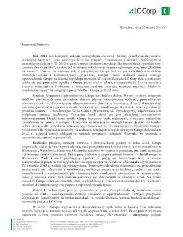 Wrocław, dnia 20 marca 2013 r. Szanowni Państwo, Rok 2012 był kolejnym rokiem szczególnym dla całej branży deweloperskiej mocno dotkniętej kryzysem oraz zawirowaniami na rynkach finansowym i nieruchomościowym w wcześniejszych latach. W 2012 r. weszły nowe ustawowe regulacje dla branży deweloperskiej tzw. „ustawa deweloperska”, a także był to ostatni rok obowiązywania rządowego programu „Rodzina na swoim”. Patrząc na miniony rok z perspektywy Grupy był to, po wcześniejszym okresie istotnych zmian i restrukturyzacji projektów, kolejny okres realizacji nowej strategii wprowadzenia Grupy na ścieżkę szybkiego rozwoju. W ocenie Zarządu LC Corp S.A. z sukcesem udało się przeprowadzić Spółkę i Grupę przez trudny okres, co sprawiło że Grupa wyszła z kryzysu wzmocniona i obecnie z sukcesem realizuje przyjętą strategię rozwoju. Miało to przełożenie na wyniki osiągnięte przez Spółkę i Grupę w 2012 roku. Sytuacja finansowa i płynnościowa Grupy jest bardzo dobra. Wysoki poziom własnych środków pieniężnych oraz posiadane aktywa płynne zabezpieczają realizację prowadzonych obecnie projektów. Zobowiązanie długoterminowe (kredyt refinansujący Arkady Wrocławskie) jest zabezpieczone wpływami z działalności centrum handlowego. Realizacja kolejnego dużego projektu biurowo – handlowego: Wola Center (Warszawa, ul. Przyokopowa) zapewniona jest podpisaną umową kredytową. Posiadany bank ziemi nie jest obciążony zewnętrznymi zobowiązaniami. Dzięki temu spółki Grupy bez presji będą realizowały inwestycje najbardziej uzasadnione rynkowo, w tempie i kolejności wynikającej ze strategii Grupy. Jest to też bardzo dobra sytuacja dla pozyskania zewnętrznego finansowania, do akwizycji i prowadzenia nowych projektów. Dla pozyskania środków na realizację kolejnych nowych akwizycji Grupa dokonała w 2012 r. kolejnej emisji obligacji w ramach programu obligacji. Wszystko to pozwala z optymizmem patrzeć w przyszłość. Realizując przyjętą strategię rozwoju i dywersyfikacji podaży w roku 2012, Grupa rozpoczęła realizację oraz wprowadziła w fazę przygotowania kolejne inwestycje mieszkaniowe w Warszawie , Wrocławiu, Krakowie i Gdańsku zarówno w oparciu o posiadany już Bank ziemi, jak i dokonując nowych akwizycji. Prace przy budowie dużego centrum biurowo – handlowego w Warszawie: Wola Center przebiegają zgodnie z przyjętym harmonogramem, a tempo komercjalizacji powierzchni wygląda bardzo optymistycznie. Oddanie obiektu do użytkowania w IV kwartale 2013 r. wydaje się niezagrożone. Intensywne działania skierowane na poszukiwanie atrakcyjnych nieruchomości z możliwością szybkiego rozpoczęcia budowy, zarówno na rynku nieruchomości mieszkaniowych jak i komercyjnych skutkowały akwizycjami w zakończonym roku, a znaczna część tych działań zakończy się akwizycjami w obecnym roku. Na rynku mieszkań Grupa znacząco zmieniła strukturę budowanych mieszkań dostosowując ich wielkość i standard do zmieniającego się popytu i zapotrzebowania rynku. Dzięki konsekwentnej polityce prowadzonej przez Zarząd udało się wzmocnić naszą pozycję na rynku deweloperskim. Zmiany związane z wprowadzeniem nowych przepisów, dotyczących deweloperów na rynku mieszkań, w ocenie Zarządu, jeszcze bardziej ustabilizują i wzmocnią pozycję LC Corp. W 2012 r. Grupa wypracowała skonsolidowany zysk netto w kwocie 70,6 milionów złotych, który jest istotnie wyższy niż wynik wypracowany w roku 2011. Przez proces wymiany najemców dobrze przeszło centrum handlowe Arkady Wrocławskie – utrzymując jedynie LC Corp S.A. ul. Powstańców Śląskich 2-4 53-333 Wrocław tel. +48 71 79 88 010 fax. +48 71 79 88 011 Wysokość kapitału zakładowego: 447.558.311 zł, kapitał opłacony w całości Sąd Rejonowy dla Wrocławia-Fabrycznej Nr KRS 0000253077 VI Wydział Gospodarczy Krajowego Rejestru Sądowego NIP 899-25-62-750, REGON 020246398 minimalny poziom pustostanów. Przy sprzedaży mieszkań udało się utrzymać zadowalające marże. Należy jednak pamiętać przy tym, że efekty podjętych w roku 2012 i wcześniej przez Zarząd działań będą widoczne w znaczącej mierze dopiero w kolejnych latach. Kontynuacją strategii Spółki jest zbudowanie znaczącej pozycji na rynku deweloperskim w Polsce. Cel ten realizowany jest konsekwentnie dzięki wprowadzanym przez spółkę na rynek inwestycjom zarówno w oparciu o posiadany bank ziemi, jak i poprzez akwizycje nowych projektów – wykorzystując obecnie znaczny spadek cen gruntów. Dywersyfikacja oferty mieszkaniowej zarówno pod względem geograficznym jak i segmentu zaczyna przynosić zamierzone efekty i zapewnia Grupie ciągłość inwestycyjną w perspektywie następnych kilku lat. Zauważalny rozwój w kluczowych dla Grupy lokalizacjach takich jak Warszawa, Wrocław, Kraków i Gdańsk wpływa istotnie na podniesienie rangi Grupy w skali ogólnopolskiej. Grupa zmierza również w ramach strategii do realizacji kolejnych inwestycji komercyjnych. Z pewnością rok 2013 wymagał będzie wielkiego zaangażowania, pracy, poświęcenia i koncentracji na wszystkich istotnych obszarach działania Grupy. Bardzo szybki rozwój i nowe wyzwania motywują do jeszcze bardziej wytężonej pracy, wpływając na umocnienie pozycji oraz wzrost znaczenia rynkowego Grupy. Pragnę podziękować wszystkim akcjonariuszom, którzy wspierali nasze działania. Jestem przekonany, iż udowodniliśmy, że nasza Grupa potrafi szybko dostosować się do zmieniającej się sytuacji rynkowej i dostrzec nowe możliwości, by móc nadal dynamicznie rozwijać się w przyszłości. Podziękowania należą się również Radzie Nadzorczej , naszym Pracownikom i Zarządom spółek z Grupy LC Corp za ogromny wysiłek i wkład w wyniki Grupy. Z pewnością nie byłoby to możliwe bez ich zaangażowania, profesjonalizmu i umiejętności. Analizując rok 2012, cieszy mnie fakt, iż udało się zrealizo