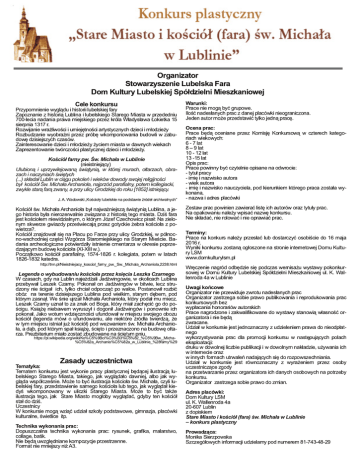 Organizator Stowarzyszenie Lubelska Fara Dom Kultury Lubelskiej Spółdzielni Mieszkaniowej Cele konkursu Przypomnienie wyglądu i historii lubelskiej fary Zapoznanie z historią Lublina i lubelskiego Starego Miasta w przededniu 700-lecia nadania prawa miejskiego przez króla Władysława Łokietka 1 5 sierpnia 1 31 7 r. Rozwijanie wrażliwości i umiejętności artystycznych dzieci i młodzieży Rozbudzanie wyobraźni przez próbę wkomponowania budowli w zabudowę dzisiejszych czasów. Zainteresowanie dzieci i młodzieży życiem miasta w dawnych wiekach Zaprezentowanie twórczości plastycznej dzieci i młodzieży. Kościół farny pw. Św. Michała w Lublinie (nieistniejący) Ulubioną i uprzywilejowaną świątynią, w której murach, ołtarzach, obra zach i naczyniach świętych (...) składał Lublin w ciągu pokoleń i wieków dowody swojej religijności był kościół Św. Michała Archanioła, najprzód parafialny, potem kollegiacki, zwykle starą farą zwany, a przy ulicy Grodzkiej do roku [1852] istniejący. J. A. Wadowski „Kościoły lubelskie na podstawie źródeł archiwalnych” Kościół św. Michała Archanioła był najważniejszą świątynią Lublina, a jego historia była nierozerwalnie związana z historią tego miasta. Dziś fara jest kościołem niewidzialnym, o którym Józef Czechowicz pisał: Na zielonym skwerze gwiazdy przeświecają przez gotyckie żebra kościoła z powietrza?. Kościół znajdował się na Placu po Farze przy ulicy Grodzkiej, w północno-wschodniej części Wzgórza Staromiejskiego na Starym Mieście. Badania archeologiczne potwierdziły istnienie cmentarza w okresie poprzedzającym budowę kościoła (XI-XIII w.). Początkowo kościół parafialny, 1 574-1 826 r. kolegiata, potem w latach 1 826-1 832 katedra. http://tnn.pl/Nieistniejacy_kosciol_farny_pw._Sw._Michala_Archaniola,2238.html Legenda o wybudowaniu kościoła przez księcia Leszka Czarnego W czasach, gdy na Lublin najeżdżali Jadźwingowie, w okolicach Lublina przebywał Leszek Czarny. Pokonał on Jadźwingów w bitwie, lecz strudzony nie ścigał ich, tylko chciał odpocząć po walce. Postanowił rozbić obóz na terenie dzisiejszego Lublina pod wielkim, starym dębem, pod którym zasnął. We śnie ujrzał Michała Archanioła, który podał mu miecz. Leszek Czarny uznał to za znak od Boga, który miał zachęcić go do pościgu. Książę niebawem wyruszył i dogonił Jadźwingów i ponownie ich pokonał. Jako wotum wdzięczności ufundował w miejscu swojego obozu kościół (legenda mówi o ufundowaniu, ale niektóre źródła twierdzą, że w tym miejscu istniał już kościół) pod wezwaniem św. Michała Archanioła, a dąb, pod którym spał książę, ścięto i przeznaczono na budowę ołtarza. Prezbiterium miało zostać zbudowane na ściętym pniu. https://pl.wikipedia.org/wiki/Ko%C5%9Bci%C3%B3%C5%82_%C5%9Bw._Micha%C5%82a_Archanio%C5%82a_w_Lublinie_%28farny%29 Tematyka: Zasady uczestnictwa Tematem konkursu jest wykonie pracy plastycznej będącej ilustracją lubelskiego Starego Miasta, takiego, jak wyglądało dawniej, albo jak wygląda współcześnie. Może to być ilustracja kościoła św. Michała, czyli lubelskiej fary, przedstawienie samego kościoła lub tego, jak wyglądał kiedyś wkomponowany w uliczki Starego Miasta. Może to być także ilustracja tego, jak Stare Miasto mogłoby wyglądać, gdyby ten kościół stał do dziś. Uczestnicy W konkursie mogą wziąć udział szkoły podstawowe, gimnazja, placówki kulturalne, świetlice itp. Technika wykonania prac: Dopuszczalna technika wykonania prac: rysunek, grafika, malarstwo, collage, batik. Nie będą uwzględniane kompozycje przestrzenne. Format nie mniejszy niż A3. Warunki: Prace nie mogą być grupowe. Ilość nadesłanych prac z danej placówki nieograniczona. Jeden autor może przedstawić tylko jedną pracę. Ocena prac: Prace będą oceniane przez Komisję Konkursową w czterech kategoriach wiekowych: 6 - 7 lat 8 – 9 lat 1 0 - 1 2 lat 1 3 -1 5 lat Opis prac: Prace powinny być czytelnie opisane na odwrocie: - tytuł pracy - imię i nazwisko autora - wiek autora - imię i nazwisko nauczyciela, pod kierunkiem którego praca została wykonana, - nazwa i adres placówki Zestaw prac powinien zawierać listę ich autorów oraz tytuły prac. Na opakowaniu należy wpisać nazwę konkursu. Nie składać, nie rolować i nie oprawiać prac. Terminy: Prace na konkurs należy przesłać lub dostarczyć osobiście do 1 6 maja 201 6 r. Wyniki konkursu zostaną ogłoszone na stronie internetowej Domu Kultury LSM www.domkulturylsm.pl Wręczenie nagród odbędzie się podczas wernisażu wystawy pokonkursowej w Domu Kultury Lubelskiej Spółdzielni Mieszkaniowej ul. K. Wallenroda 4a w Lublinie Uwagi końcowe Organizator nie przewiduje zwrotu nadesłanych prac Organizator zastrzega sobie prawo publikowania i reprodukowania prac konkursowych bez wypłacania honorariów autorskich Prace nagrodzone i zakwalifikowane do wystawy stanowią własność organizatora i nie będą zwracane. Udział w konkursie jest jednoznaczny z udzieleniem prawa do nieodpłatnego wykorzystywania prac dla promocji konkursu w następujących polach eksploatacji: druku w dowolnej liczbie publikacji i w dowolnym nakładzie, używania ich w internecie oraz w innych formach utrwaleń nadających się do rozpowszechniania. Udział w konkursie jest równoznaczny z wyrażeniem przez osoby uczestniczące zgody na przetwarzanie przez organizatora ich danych osobowych na potrzeby konkursu. Organizator zastrzega sobie prawo do zmian. Adres placówki: Dom Kultury LSM ul. K. Wallenroda 4a 20-607 Lublin z dopiskiem Stare Miasto i kościół (fara) św. Michała w Lublinie – konkurs plastyczny Prowadząca: Monika Sierzpowska Szczegółowych informacji udzielamy pod numerem 81 -743-48-29