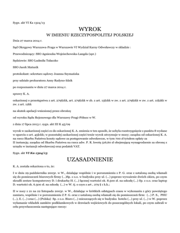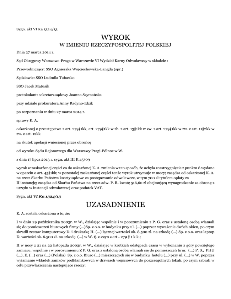 Sygn. akt VI Ka 1324/13 WYROK W IMIENIU RZECZYPOSPOLITEJ POLSKIEJ Dnia 27 marca 2014 r. Sąd Okręgowy Warszawa-Praga w Warszawie VI Wydział Karny Odwoławczy w składzie : Przewodniczący: SSO Agnieszka Wojciechowska-Langda (spr.) Sędziowie: SSO Ludmiła Tułaczko SSO Jacek Matusik protokolant: sekretarz sądowy Joanna Szymańska przy udziale prokuratora Anny Radyno-Idzik po rozpoznaniu w dniu 27 marca 2014 r. sprawy K. A. oskarżonej o przestępstwa z art. 279§1kk, art. 279§1kk w zb. z art. 13§1kk w zw. z art. 279§1kk w zw. z art. 11§2kk w zw. z art. 12kk na skutek apelacji wniesionej przez obrońcę od wyroku Sądu Rejonowego dla Warszawy Pragi-Północ w W. z dnia 17 lipca 2013 r. sygn. akt III K 45/09 wyrok w zaskarżonej części co do oskarżonej K. A. zmienia w ten sposób, że uchyla rozstrzygnięcie z punktu 8 wydane w oparciu o art. 45§1kk; w pozostałej zaskarżonej części tenże wyrok utrzymuje w mocy; zasądza od oskarżonej K. A. na rzecz Skarbu Państwa koszty sądowe za postępowanie odwoławcze, w tym 700 zł tytułem opłaty za II instancję; zasądza od Skarbu Państwa na rzecz adw. P. R. kwotę 516,60 zł obejmującą wynagrodzenie za obronę z urzędu w instancji odwoławczej oraz podatek VAT. Sygn. akt VI Ka 1324/13 UZASADNIENIE K. A. została oskarżona o to, że: I w dniu 29 października 2003r. w W., działając wspólnie i w porozumieniu z P. G. oraz z ustaloną osobą włamali się do pomieszczeń biurowych firmy (...)Sp. z o.o. w budynku przy ul. (...) poprzez wyważenie dwóch okien, po czym skradli zestaw komputerowy D. i drukarkę H. (...) łącznej wartości ok. 8.500 zł. na szkodę (...) Sp. z o.o. oraz laptop D. wartości ok. 6.500 zł. na szkodę (...) w W. tj. o czyn z art . 279 § 1 k.k.; II w nocy z 21 na 22 listopada 2003r. w W., działając w krótkich odstępach czasu w wykonaniu z góry powziętego zamiaru, wspólnie i w porozumieniu Z P. G. oraz z ustaloną osobą włamali się do pomieszczeń firm: (...) P. S., PHU (...), E. (...) oraz (...) (Polska) Sp. z o.o. Biuro (...) mieszczących się w budynku hotelu (...) przy ul. (...) w W. poprzez wyłamanie wkładek zamków podklamkowych w drzwiach wejściowych do poszczególnych lokali, po czym zabrali w celu przywłaszczenia następujące rzeczy: - serwer, monitor B., laptop A. oraz dokumenty firmowe łącznej wartości ok. 14.000 zł. na szkodę (...) P. S., - zestaw komputerowy - składak z monitoremS. łącznej wartości 7000 zł. na szkodę firmy PHU (...), - dwa zestawy komputerowe-składaki i drukarkę H. (...) łącznej wartości 15.000 zł. na szkodę E. (...), -dwa zestawy komputerowe A. (...), laptop A. M. oraz router bezprzewodowy łącznej wartości 11.100 zł. na szkodę(...)(Polska) Sp. z o.o. w S. oraz -modem (...) nieustalonej wartości na szkodę hotelu (...) w łącznej wartości strat na szkodę wskazanych firm 47.100 zł., a ponadto usiłowali włamać się niszcząc wkładki zamków podklamkowych do następujących firm mieszczących się w budynku hotelu (...) przy ul. (...) w W. tj. (...) Sp. z o.o., (...) Sp. z o.o. - Filia (...) 3, Agencja (...) s.c, Biuro A. (...) oraz (...) tj. o czyn z art. 279 § 1 k.k. w zb. z art. 13 § 1 k.k. w zw. z art. 279 § 1 k.k. w zw. z art. 11 § 2 k.k. w zw. z art. 12 k.k. Sąd Rejonowy dla Warszawy Pragi Północ w W. wyrokiem z 17 lipca 2013 r. w sprawie o sygn. akt III K 45/09 uznał oskarżoną za winną popełnienia zarzucanych jej czynów i za czyn z pkt. I na podstawie art. 279 § l k.k. skazał ją i wymierzył karę roku pozbawienia wolności oraz na podstawie art. 33 § 2 k.k. karę grzywny w wysokości 50 stawek dziennych po 20 zł każda; za czyn z pkt. II na podstawie art. 279 § l k.k. w zb. z art. 13 § 1 k.k. w zw. z art. 279 § 1 k.k. w zw. z art. 11 § 2 k.k. w zw. z art. 12 k.k. skazał ją, a na postawie art. 14 § 1 k.k. w zw. z art. 279 § 1 k.k. w zw. z art. 11 § 3 k.k wymierzył karę roku pozbawienia wolności oraz na podstawie art. 33 § 2 k.k. karę grzywny w wysokości 50 stawek dziennych po 20 zł każda; na podstawie art. 85 k.k. i art. 86 § l k.k. wymierzył oskarżonej karę łączną 1 roku i 6 miesięcy pozbawienia wolności, której wykonanie na podstawie art. 69 § 1 k.k, art. 70 § 1 pkt. 1 k.k. warunkowo zawiesił na okres próby 4 lat ; na podstawie art. 85 k.k. i art. 86 § 2 k.k. wymierzył oskarżonej karę łączną grzywny w wysokości 100 stawek dziennych po 20 zł każda; na podstawie art. 45 § l k.k. orzekł wobec oskarżonej przepadek korzyści osiągniętych z popełnienia przestępstw w kwotach: za czyn I 5000 zł, za czyn II 15700 zł. Apelację od powyższego wyroku wniósł obrońca oskarżonej zaskarżając wyrok w całości na jej korzyść. Na podstawie art. 427 § 2 k.p.k. oraz art. 438 pkt 1, 2 oraz 3 k.p.k. zaskarżonemu wyrokowi zarzucił: I naruszenie przepisów postępowania mające istotny wpływ na wynik sprawy, a to: a) art. 7 k.p.k. w zw. z art. 410 k.p.k. w zw. z art. 424 par. 1 pkt. 1 k.p.k. polegające na przekroczenie przez Sąd I instancji granicy swobodnej oceny dowodów poprzez dokonanie dowolnej a nie swobodnej oceny dowodów bez uwzględnienia zasad prawidłowego rozumowania oraz wskazań wiedzy i doświadczenia życiowego, w szczególności poprzez: I. przyznanie przymiotu pełnej wiarygodności zeznaniom świadka K. S. w sytuacji, gdy: - osoba ta jest osobiście zainteresowana wynikiem niniejszego postępowania, jak również równocześnie prowadzone jest względem świadka inne postępowanie o charakterze karnym, których wynik może zależeć od postawy świadka w ramach niniejszego postępowania; - uznaniu za wiarygodne zeznań K. S. dotyczących osobistego stosunku świadka do K. A. wbrew zeznaniom oskarżonej, współoskarżonych, a także świadka powołanego dla ustalenia tego faktu; II. przyjęcie zeznań świadka K. S. za w pełni wiarygodne, argumentując, iż świadek został pouczony o odpowiedzialności karnej za składanie fałszywych 