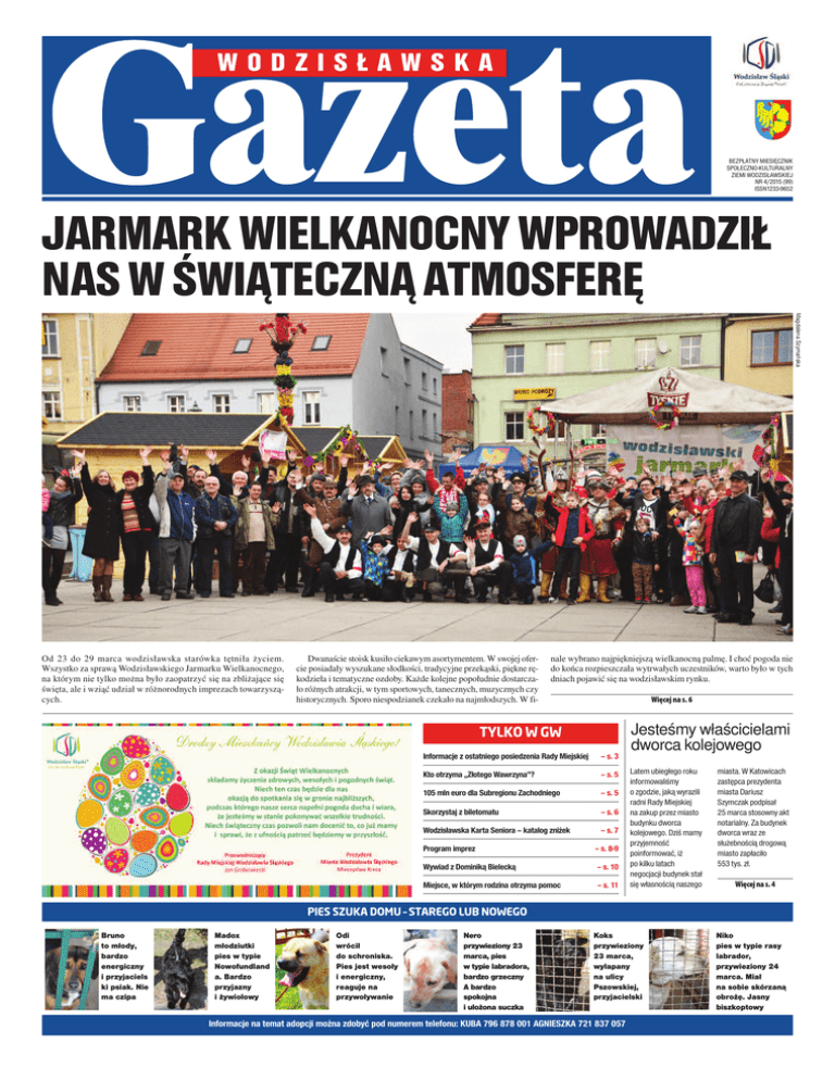 WODZISŁAWSKA BeZpłatny MieSięcZniK SpołecZno-KuLtuRaLny ZieMi WoDZiSłaWSKiej nR 4/2015 (99) iSSn1233-9652 JARMARK WIELKANOCNY WPROWADZIŁ NAS W ŚWIĄTECZNĄ ATMOSFERĘ Magdalena Szymańska Od 23 do 29 mar ca wo dzi sławska sta rów ka tęt ni ła życiem. Wszystko za sprawą Wodzisławskiego Jar marku Wielkanocnego, na którym nie tylko można było zaopatrzyć się na zbliżające się święta, ale i wziąć udział w różnorodnych imprezach towarzyszących. Dwanaście stoisk kusiło ciekawym asortymentem. W swojej ofercie posiadały wyszukane słodkości, tradycyjne przekąski, piękne rękodzieła i tematyczne ozdoby. Każde kolejne popołudnie dostarczało różnych atrakcji, w tym sportowych, tanecznych, muzycznych czy historycznych. Sporo niespodzianek czekało na najmłodszych. W fi- nale wybrano najpiękniejszą wielkanocną palmę. I choć pogoda nie do końca rozpieszczała wytrwałych uczestników, warto było w tych dniach pojawić się na wodzisławskim rynku. Więcej na s. 6 TYLKO W GW Informacje z ostatniego posiedzenia Rady Miejskiej – s. 3 Kto otrzyma „Złotego Wawrzyna”? – s. 5 105 mln euro dla Subregionu Zachodniego – s. 5 Skorzystaj z biletomatu – s. 6 Wodzisławska Karta Seniora – katalog zniżek – s. 7 Program imprez – s. 8-9 Wywiad z Dominiką Bielecką – s. 10 Miejsce, w którym rodzina otrzyma pomoc – s. 11 Jesteśmy właścicielami dworca kolejowego Latem ubiegłego roku informowaliśmy o zgodzie, jaką wyrazili radni Rady Miejskiej na zakup przez miasto budynku dworca kolejowego. Dziś mamy przyjemność poinformować, iż po kilku latach negocjacji budynek stał się własnością naszego miasta. W Katowicach zastępca prezydenta miasta Dariusz Szymczak podpisał 25 marca stosowny akt notarialny. Za budynek dworca wraz ze służebnością drogową miasto zapłaciło 553 tys. zł. Więcej na s. 4 Pies szuKa dOmu – sTareGO Lub nOWeGO Bruno to młody, bardzo energiczny i przyjaciels ki psiak. Nie ma czipa Madox młodziutki pies w typie Nowofundland a. Bardzo przyjazny i żywiołowy Odi wrócił do schroniska. Pies jest wesoły i energiczny, reaguje na przywoływanie Nero przywieziony 23 marca, pies w typie labradora, bardzo grzeczny A bardzo spokojna i ułożona suczka Koks przywieziony 23 marca, wyłapany na ulicy Pszowskiej, przyjacielski Informacje na temat adopcji można zdobyć pod numerem telefonu: KUBA 796 878 001 AGNIESZKA 721 837 057 Niko pies w typie rasy labrador, przywieziony 24 marca. Miał na sobie skórzaną obrożę. Jasny biszkoptowy ratusz 2 zdaniem PrezYdenTa Szanowni Współmieszkańcy, Od 1 kwietnia możemy oceniać urząd WWW.fAcEBooK.coM/ GAZEtAWoDZISlAWSKA PISZ • KoMENtUj PRoPoNUj ZDjęcIA Z MARcoWych WyDARZEń NA fAcEBooKU GAZEty WoDZISłAWSKIEj Od 1 kwietnia do 1 czerwca przeprowadzane jest badanie stopnia satysfakcji klientów Urzędu Miasta Wodzisławia Śląskiego. Głównym celem przeprowadzania badania jest bieżące uzyskiwanie informacji na temat poziomu jakości usług świadczonych przez pracowników urzędu, co pozwoli m.in. precyzyjnie określić słabe obszary działalności urzędu, wprowadzić procedury doskonalące, lepiej zarządzać komórkami organizacyjnymi, podnieść jakość świadczonych usług publicznych, a w konsekwencji poprawić wizerunek urzędu. Badanie satysfakcji klientów przeprowadzane jest poprzez zebranie danych w formie anonimowej ankiety zgodnie z wzorem ustalonym przez Prezydenta Miasta Wodzisławia Śląskiego. W okresie przeprowadzania badania formularze ankiety dostępne będą: • w formie papierowej w ogólnodostępnych miejscach budynków Urzędu Miasta Wodzisławia Śląskiego oraz w poszczególnych komórkach organizacyjnych • w formie elektronicznej na stronie internetowej urzędu. Red. WODZISŁAWSKA Redakcja: 44-300 Wodzisław Śl., ul. Ks. płk. W. Kubsza 17, tel. 32 454 72 03 e-mail: [email protected] Redaktor naczelny: anna Szweda-piguła Dziennikarze: Magdalena Szymańska, ireneusz Skupień Reklama: [email protected] Wydawca: Wodzisławskie centrum Kultury Nakład: 18 500 egzemplarzy Projekt graficzny: emildesign ankiety pobrane w formie papierowej po wypełnieniu będzie można wrzucać do udostępnionych w urzędzie wyraźnie oznaczonych urn. urny będą się znajdowały w miejscach ogólnodostępnych we wszystkich budynkach urzędu, tj. w budynkach: przy ulicy Bogumińskiej 4, przy ulicy Bogumińskiej 4a, przy ulicy Bogumińskiej 4b, przy ul. Ks. Płk. Wilhelma Kubsza (Urząd Stanu cywilnego), przy ul. Rzecznej 24 (Straż Miejska Wodzisławia Śląskiego). ankiety wypełnione poprzez stronę internetową zwracane będą w formie elektronicznej. pracownik urzędu nie może wypełniać ankiety za klienta oraz nie może przyjmować wypełnionych ankiet. Do dnia 30 czerwca 2015 r. na stronie internetowej urzędu zostanie udostępniony raport oraz wnioski końcowe z przeprowadzonego badania ankietowego. Skład i druk: Silesia press agencja Dziennikarska Wydrukowano w: Drukarnia polskapresse Sp. z o.o., Sosnowiec Redakcja nie zwraca niezamówionych materiałów; zastrzega sobie prawo do dokonywania skrótów, przeredagowań i zmiany tytułów. Redakcja przyjmuje materiały wyłącznie w postaci elektronicznej. Redakcja nie odpowiada za treść reklam, ogłoszeń i listów. Remonty dróg i chodników miejskich należą do zadań miasta. Jednak przez Wodzisław Śląski biegną również drogi wojewódzkie. Za nie odpowiadają władze województwa śląskiego. Znany wszystkim użytkownikom kiepski stan tych dróg wpływa na komfort i bezpieczeństwo jazdy. Nie da się ukryć, że pilnego remontu potrzebuje droga DW 933. Dlatego też Mieczysław Kieca zwrócił się z prośbą do Marszałka Województwa Śląskiego Wojciecha Saługi w sprawie jej natychmiastowego remontu. – W kwestii DW 933 jest wiele do zrobienia. Zwróciłem się do marszałka Wojciecha Saługi o jak najszybsze, wręcz natychmiastowe, podjęcie kontynuacji prac związanych z przygoto