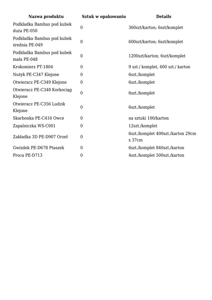 Nazwa produktu Podkładka Bambus pod kubek Sztuk w opakowaniu Details 0 360szt/karton; 6szt/komplet 0 600szt/karton; 6szt/komplet 0 1200szt/karton; 6szt/komplet Krokomierz PT-1804 0 9 szt./ komplet, 600 szt./ karton Nożyk PE-C347 Klejone 0 6szt./komplet Otwieracz PE-C349 Klejone 0 6szt./komplet 0 6szt./komplet 0 6szt./komplet Skarbonka PE-C416 Owce 0 na sztuki 100/karton Zapalniczka WS-C001 0 12szt./komplet Zakładka 3D PE-D907 Orzeł 0 Gwizdek PE-D678 Ptaszek 0 6szt./komplet 840szt./karton Proca PE-D713 0 4szt./komplet 500szt./karton duża PE-050 Podkładka Bambus pod kubek średnia PE-049 Podkładka Bambus pod kubek mała PE-048 Otwieracz PE-C348 Korkociąg Klejone Otwieracz PE-C356 Ludzik Klejone 6szt./komplet 400szt./karton 29cm x 37cm