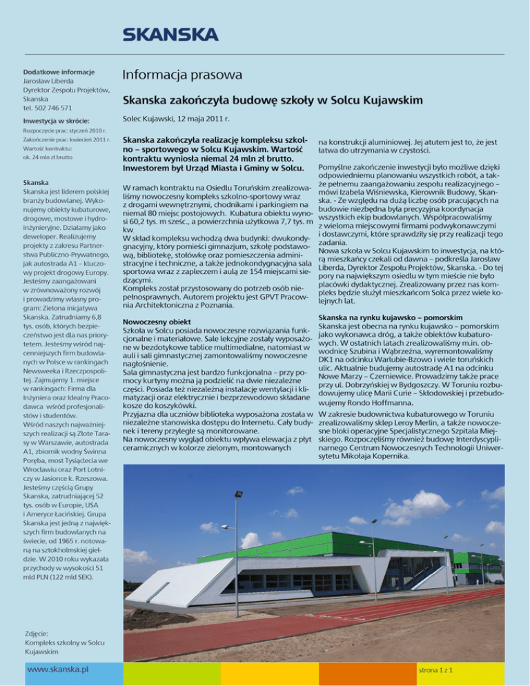 Dodatkowe informacje Jarosław Liberda Dyrektor Zespołu Projektów, Skanska tel. 502 746 571 Inwestycja w skrócie: Informacja prasowa Skanska zakończyła budowę szkoły w Solcu Kujawskim Solec Kujawski, 12 maja 2011 r. Rozpoczęcie prac: styczeń 2010 r. Zakończenie prac: kwiecień 2011 r. Wartość kontraktu: ok. 24 mln zł brutto Skanska Skanska jest liderem polskiej branży budowlanej. Wykonujemy obiekty kubaturowe, drogowe, mostowe i hydroinżynieryjne. Działamy jako deweloper. Realizujemy projekty z zakresu Partnerstwa Publiczno-Prywatnego, jak autostrada A1 – kluczowy projekt drogowy Europy. Jesteśmy zaangażowani w zrównoważony rozwój i prowadzimy własny program: Zielona inicjatywa Skanska. Zatrudniamy 6,8 tys. osób, których bezpieczeństwo jest dla nas priorytetem. Jesteśmy wśród najcenniejszych firm budowlanych w Polsce w rankingach Newsweeka i Rzeczpospolitej. Zajmujemy 1. miejsce w rankingach: Firma dla Inżyniera oraz Idealny Pracodawca wśród profesjonalistów i studentów. Wśród naszych najważniejszych realizacji są Złote Tarasy w Warszawie, autostrada A1, zbiornik wodny Świnna Poręba, most Tysiąclecia we Wrocławiu oraz Port Lotniczy w Jasionce k. Rzeszowa. Jesteśmy częścią Grupy Skanska, zatrudniającej 52 tys. osób w Europie, USA i Ameryce Łacińskiej. Grupa Skanska jest jedną z największych firm budowlanych na świecie, od 1965 r. notowaną na sztokholmskiej giełdzie. W 2010 roku wykazała przychody w wysokości 51 mld PLN (122 mld SEK). Skanska zakończyła realizację kompleksu szkolno – sportowego w Solcu Kujawskim. Wartość kontraktu wyniosła niemal 24 mln zł brutto. Inwestorem był Urząd Miasta i Gminy w Solcu. W ramach kontraktu na Osiedlu Toruńskim zrealizowaliśmy nowoczesny kompleks szkolno-sportowy wraz z drogami wewnętrznymi, chodnikami i parkingiem na niemal 80 miejsc postojowych. Kubatura obiektu wynosi 60,2 tys. m sześc., a powierzchnia użytkowa 7,7 tys. m kw. W skład kompleksu wchodzą dwa budynki: dwukondygnacyjny, który pomieści gimnazjum, szkołę podstawową, bibliotekę, stołówkę oraz pomieszczenia administracyjne i techniczne, a także jednokondygnacyjna sala sportowa wraz z zapleczem i aulą ze 154 miejscami siedzącymi. Kompleks został przystosowany do potrzeb osób niepełnosprawnych. Autorem projektu jest GPVT Pracownia Architektoniczna z Poznania. Nowoczesny obiekt Szkoła w Solcu posiada nowoczesne rozwiązania funkcjonalne i materiałowe. Sale lekcyjne zostały wyposażone w bezdotykowe tablice multimedialne, natomiast w auli i sali gimnastycznej zamontowaliśmy nowoczesne nagłośnienie. Sala gimnastyczna jest bardzo funkcjonalna – przy pomocy kurtyny można ją podzielić na dwie niezależne części. Posiada też niezależną instalację wentylacji i klimatyzacji oraz elektrycznie i bezprzewodowo składane kosze do koszykówki. Przyjazna dla uczniów biblioteka wyposażona została w niezależne stanowiska dostępu do Internetu. Cały budynek i tereny przyległe są monitorowane. Na nowoczesny wygląd obiektu wpływa elewacja z płyt ceramicznych w kolorze zielonym, montowanych na konstrukcji aluminiowej. Jej atutem jest to, że jest łatwa do utrzymania w czystości. Pomyślne zakończenie inwestycji było możliwe dzięki odpowiedniemu planowaniu wszystkich robót, a także pełnemu zaangażowaniu zespołu realizacyjnego – mówi Izabela Wiśniewska, Kierownik Budowy, Skanska. - Ze względu na dużą liczbę osób pracujących na budowie niezbędna była precyzyjna koordynacja wszystkich ekip budowlanych. Współpracowaliśmy z wieloma miejscowymi firmami podwykonawczymi i dostawczymi, które sprawdziły się przy realizacji tego zadania. Nowa szkoła w Solcu Kujawskim to inwestycja, na którą mieszkańcy czekali od dawna – podkreśla Jarosław Liberda, Dyrektor Zespołu Projektów, Skanska. - Do tej pory na największym osiedlu w tym mieście nie było placówki dydaktycznej. Zrealizowany przez nas kompleks będzie służył mieszkańcom Solca przez wiele kolejnych lat. Skanska na rynku kujawsko – pomorskim Skanska jest obecna na rynku kujawsko – pomorskim jako wykonawca dróg, a także obiektów kubaturowych. W ostatnich latach zrealizowaliśmy m.in. obwodnicę Szubina i Wąbrzeźna, wyremontowaliśmy DK1 na odcinku Warlubie-Bzowo i wiele toruńskich ulic. Aktualnie budujemy autostradę A1 na odcinku Nowe Marzy – Czerniewice. Prowadzimy także prace przy ul. Dobrzyńskiej w Bydgoszczy. W Toruniu rozbudowujemy ulicę Marii Curie – Skłodowskiej i przebudowujemy Rondo Hoffmanna. W zakresie budownictwa kubaturowego w Toruniu zrealizowaliśmy sklep Leroy Merlin, a także nowoczesne bloki operacyjne Specjalistycznego Szpitala Miejskiego. Rozpoczęliśmy również budowę Interdyscyplinarnego Centrum Nowoczesnych Technologii Uniwersytetu Mikołaja Kopernika. Zdjęcie: Kompleks szkolny w Solcu Kujawskim www.skanska.pl strona 1 z 1