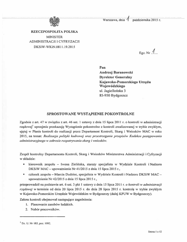 Zespól kontrolny Departamentu Kontroli, Skarg i Wniosków Ministerstwa Administracji i Cyfryzacji