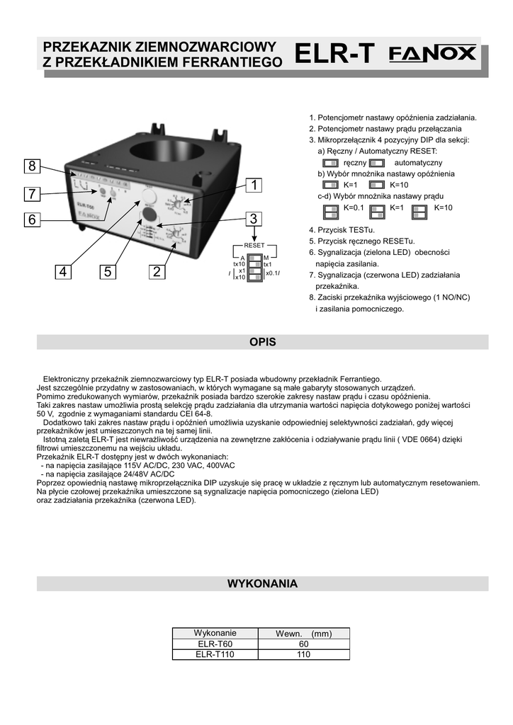 PRZEKAZNIK ZIEMNOZWARCIOWY Z PRZEK£ADNIKIEM FERRANTIEGO ELR-T 1. Potencjometr nastawy opóŸnienia zadzia³ania. 2. Potencjometr nastawy pr¹du prze³¹czania 3. Mikroprze³¹cznik 4 pozycyjny DIP dla sekcji: a) Rêczny / Automatyczny RESET: rêczny automatyczny b) Wybór mno¿nika nastawy opóŸnienia K=1 K=10 c-d) Wybór mno¿nika nastawy pr¹du K=0.1 K=1 K=10 8 1 7 3 6 RESET 4 5 2 A tx10 ID x1 x10 M tx1 x0.1ID 4. Przycisk TESTu. 5. Przycisk rêcznego RESETu. 6. Sygnalizacja (zielona LED) obecnoœci napiêcia zasilania. 7. Sygnalizacja (czerwona LED) zadzia³ania przekaŸnika. 8. Zaciski przekaŸnika wyjœciowego (1 NO/NC) i zasilania pomocniczego. OPIS Elektroniczny przekaŸnik ziemnozwarciowy typ ELR-T posiada wbudowny przek³adnik Ferrantiego. Jest szczególnie przydatny w zastosowaniach, w których wymagane s¹ ma³e gabaryty stosowanych urz¹dzeñ. Pomimo zredukowanych wymiarów, przekaŸnik posiada bardzo szerokie zakresy nastaw pr¹du i czasu opóŸnienia. Taki zakres nastaw umo¿liwia prost¹ selekcjê pr¹du zadzia³ania dla utrzymania wartoœci napiêcia dotykowego poni¿ej wartoœci 50 V, zgodnie z wymaganiami standardu CEI 64-8. Dodatkowo taki zakres nastaw pr¹du i opóŸnieñ umo¿liwia uzyskanie odpowiedniej selektywnoœci zadzia³añ, gdy wiêcej przekaŸników jest umieszczonych na tej samej linii. Istotn¹ zalet¹ ELR-T jest niewra¿liwoœæ urz¹dzenia na zewnêtrzne zak³ócenia i odzia³ywanie pr¹du linii ( VDE 0664) dziêki filtrowi umieszczonemu na wejœciu uk³adu. PrzekaŸnik ELR-T dostêpny jest w dwóch wykonaniach: - na napiêcia zasilaj¹ce 115V AC/DC, 230 VAC, 400VAC - na napiêcia zasilaj¹ce 24/48V AC/DC Poprzez opowiedni¹ nastawê mikroprze³¹cznika DIP uzyskuje siê pracê w uk³adzie z rêcznym lub automatycznym resetowaniem. Na p³ycie czo³owej przekaŸnika umieszczone s¹ sygnalizacje napiêcia pomocniczego (zielona LED) oraz zadzia³ania przekaŸnika (czerwona LED). WYKONANIA Wykonanie ELR-T60 ELR-T110 Wewn. f (mm) 60 110 DIAGRAMY POD£¥CZEÑ 0-3 = 380-415 VAC 0-2 = 220-240 VAC 0-1 = 110-127 VAC/DC Zasilanie N R S T Uziemienie 0-2 = 48 VAC/DC 0-1 = 24 VAC/DC NAPIÊCIE POMOCNICZE 6 5 4 2 1 0 3 TRIP ON Test ID 0,02-0,5 ID x1 x10 x10 M M A Reset Obci¹¿enie DANE TECHNICZNE Pomocnicze napiêcie zasilaj¹ce Czêstotliwoœæ napiêcia zasilaj¹cego Pobór mocy 24 / 48 VAC/DC 115 VAC/DC , 230-400 VAC 50-60 Hz 3 VA Zakresy nastaw pr¹du 0,025 - 0,25 A (K=0,1) 0,25 - 2,5 A (K=1) 2,5 - 25 A (K=10) Zakresy nastaw opóŸnienia 0,02 - 0,5 s (K=1) 0,2 - 5 s (K=10) Obci¹¿alnoœæ zestyku wyjœciowego Temperatura pracy Zgodnoœc ze standardami 5A, 250 V -10 +60 oC CEI 41-1 IEC 255 VDE 0664 Szczelnoœæ (DIN40050) Wytrzyma³oœæ izolacji Max œrednica przewodów IP20 2,5 kV 60s 2 2,5 mm WYMIARY H ELR-T60 ELR-T110 E A D TYP A 60 110 B 100 150 WYMIARY (mm) C D E F 60 110 47 70 110 160 70 70 G 60 60 H 50 50 F5 C B POLSKA Sp. z o.o. G F ul. Wróblewskiego 8/3, 58-105 Œwidnica tel. / fax (074) 852-43-80, tel. (0601) 78-70-22 e-mail: [email protected] http://www.fanox.hm.pl 01.10.1999