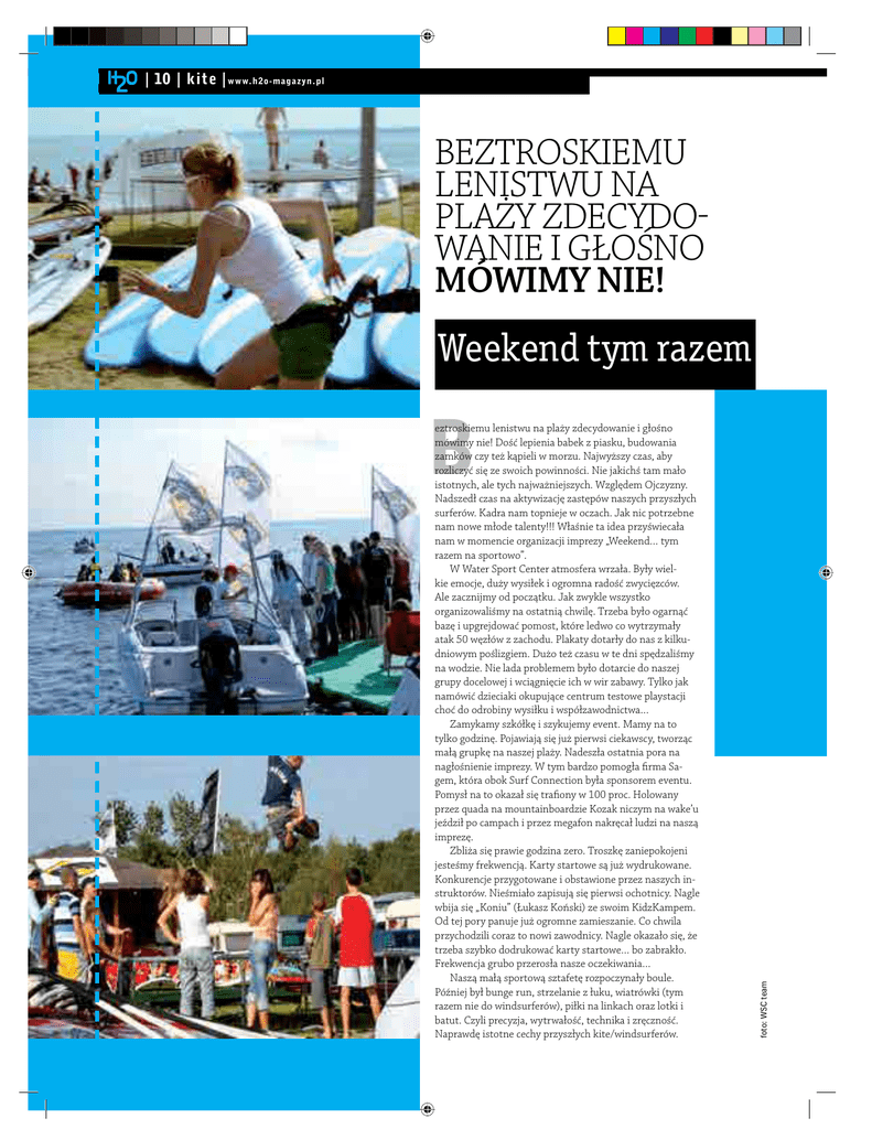 | 10 | kite |www.h2o-magazyn.pl BEZTROSKIEMU LENISTWU NA PLAŻY ZDECYDO WANIE I GŁOŚNO MÓWIMY NIE! Weekend tym razem foto: WSC team B eztroskiemu lenistwu na plaży zdecydowanie i głośno mówimy nie! Dość lepienia babek z piasku, budowania zamków czy też kąpieli w morzu. Najwyższy czas, aby rozliczyć się ze swoich powinności. Nie jakichś tam mało istotnych, ale tych najważniejszych. Względem Ojczyzny. Nadszedł czas na aktywizację zastępów naszych przyszłych surferów. Kadra nam topnieje w oczach. Jak nic potrzebne nam nowe młode talenty!!! Właśnie ta idea przyświecała nam w momencie organizacji imprezy „Weekend… tym razem na sportowo”. W Water Sport Center atmosfera wrzała. Były wielkie emocje, duży wysiłek i ogromna radość zwycięzców. Ale zacznijmy od początku. Jak zwykle wszystko organizowaliśmy na ostatnią chwilę. Trzeba było ogarnąć bazę i upgrejdować pomost, które ledwo co wytrzymały atak 50 węzłów z zachodu. Plakaty dotarły do nas z kilkudniowym poślizgiem. Dużo też czasu w te dni spędzaliśmy na wodzie. Nie lada problemem było dotarcie do naszej grupy docelowej i wciągnięcie ich w wir zabawy. Tylko jak namówić dzieciaki okupujące centrum testowe playstacji choć do odrobiny wysiłku i współzawodnictwa… Zamykamy szkółkę i szykujemy event. Mamy na to tylko godzinę. Pojawiają się już pierwsi ciekawscy, tworząc małą grupkę na naszej plaży. Nadeszła ostatnia pora na nagłośnienie imprezy. W tym bardzo pomogła firma Sagem, która obok Surf Connection była sponsorem eventu. Pomysł na to okazał się trafiony w 100 proc. Holowany przez quada na mountainboardzie Kozak niczym na wake’u jeździł po campach i przez megafon nakręcał ludzi na naszą imprezę. Zbliża się prawie godzina zero. Troszkę zaniepokojeni jesteśmy frekwencją. Karty startowe są już wydrukowane. Konkurencje przygotowane i obstawione przez naszych instruktorów. Nieśmiało zapisują się pierwsi ochotnicy. Nagle wbija się „Koniu” (Łukasz Koński) ze swoim KidzKampem. Od tej pory panuje już ogromne zamieszanie. Co chwila przychodzili coraz to nowi zawodnicy. Nagle okazało się, że trzeba szybko dodrukować karty startowe… bo zabrakło. Frekwencja grubo przerosła nasze oczekiwania… Naszą małą sportową sztafetę rozpoczynały boule. Później był bunge run, strzelanie z łuku, wiatrówki (tym razem nie do windsurferów), piłki na linkach oraz lotki i batut. Czyli precyzja, wytrwałość, technika i zręczność. Naprawdę istotne cechy przyszłych kite/windsurferów. www.h2o-magazyn.pl | kite | 11 | Zaczęła się ostra rywalizacja pomiędzy dziećmi, rodzinami i dorosłymi. W konkurencjach wymagających większej precyzji przodowali dorośli, dzieci zaś przerastały ich na głowę w akrobacjach wykonywanych z deską na batucie. Ogromnym zainteresowaniem cieszył się bunge run, tak samo zresztą jak pokazy wake’owe, które odbywały się tuż po godzinie 16.00. Pomimo twardo ustalonego planu zawodów, wcale niełatwo było je zakończyć. Wciąż pojawiali się nowi zawodnicy. Na szczęście wraz z pierwszym startem sztucznej wyspy za motorówką prawie wszystkich wywiało na pomost. To był prawdziwy test zbijanej przez nas ponad tydzień pływającej konstrukcji. Mieliśmy dosłownie chwile na podliczenie głosów i przygotowanie nagród. W końcu nadszedł oczekiwany przez wszystkich moment. Odczytanie wyników. Muzyka ucichła, a wraz z nią gwar dzieciaków. W kategorii dzieci zwyciężył Sebastian Mroczkowski, kobiety – Iza Kajtoch, a wśród mężczyzn najlepszy był Paweł Malak. Wszyscy najmłodsi otrzymali nagrody pocieszenia. Wraz z zakończeniem zawodów odbyły się pokazy kite&windsurfingu. „Weekend... tym razem na sportowo” dał zarówno nam, jak i uczestnikom mnóstwo zabawy i śmiechu. Wszyscy poczuliśmy ducha sportowej rywalizacji. Mamy też nadzieje, że udało się nam przekonać uczestników do bardziej aktywnego wypoczynku. Zarazem pokazać, że kiteboarding i windsurfing to sporty łatwe do opanowania, nieskomplikowane, a przede wszystkim rodzinne. Jeśli chcesz się o tym przekonać, zapraszamy 11–12 sierpnia na powtórkę. Oczywiście do Water Sport Center. ❚❚❚❚❚ Mariusz Korlak na sportowo… KITEBOARDING I WINDSURFING TO SPORTY ŁATWE DO OPANOWANIA, NIESKOMPLIKO WANE, A PRZEDE WSZYSTKIM RODZINNE