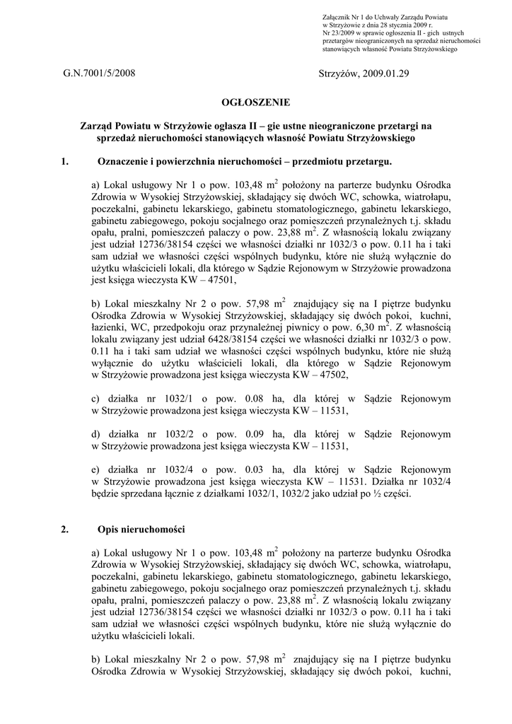 Załącznik Nr 1 do Uchwały Zarządu Powiatu w Strzyżowie z dnia 28 stycznia 2009 r. Nr 23/2009 w sprawie ogłoszenia II - gich ustnych przetargów nieograniczonych na sprzedaż nieruchomości stanowiących własność Powiatu Strzyżowskiego G.N.7001/5/2008 Strzyżów, 2009.01.29 OGŁOSZENIE Zarząd Powiatu w Strzyżowie ogłasza II – gie ustne nieograniczone przetargi na sprzedaż nieruchomości stanowiących własność Powiatu Strzyżowskiego 1. Oznaczenie i powierzchnia nieruchomości – przedmiotu przetargu. a) Lokal usługowy Nr 1 o pow. 103,48 m2 położony na parterze budynku Ośrodka Zdrowia w Wysokiej Strzyżowskiej, składający się dwóch WC, schowka, wiatrołapu, poczekalni, gabinetu lekarskiego, gabinetu stomatologicznego, gabinetu lekarskiego, gabinetu zabiegowego, pokoju socjalnego oraz pomieszczeń przynależnych t.j. składu opału, pralni, pomieszczeń palaczy o pow. 23,88 m2. Z własnością lokalu związany jest udział 12736/38154 części we własności działki nr 1032/3 o pow. 0.11 ha i taki sam udział we własności części wspólnych budynku, które nie służą wyłącznie do użytku właścicieli lokali, dla którego w Sądzie Rejonowym w Strzyżowie prowadzona jest księga wieczysta KW – 47501, b) Lokal mieszkalny Nr 2 o pow. 57,98 m2 znajdujący się na I piętrze budynku Ośrodka Zdrowia w Wysokiej Strzyżowskiej, składający się dwóch pokoi, kuchni, łazienki, WC, przedpokoju oraz przynależnej piwnicy o pow. 6,30 m2. Z własnością lokalu związany jest udział 6428/38154 części we własności działki nr 1032/3 o pow. 0.11 ha i taki sam udział we własności części wspólnych budynku, które nie służą wyłącznie do użytku właścicieli lokali, dla którego w Sądzie Rejonowym w Strzyżowie prowadzona jest księga wieczysta KW – 47502, c) działka nr 1032/1 o pow. 0.08 ha, dla której w Sądzie Rejonowym w Strzyżowie prowadzona jest księga wieczysta KW – 11531, d) działka nr 1032/2 o pow. 0.09 ha, dla której w Sądzie Rejonowym w Strzyżowie prowadzona jest księga wieczysta KW – 11531, e) działka nr 1032/4 o pow. 0.03 ha, dla której w Sądzie Rejonowym w Strzyżowie prowadzona jest księga wieczysta KW – 11531. Działka nr 1032/4 będzie sprzedana łącznie z działkami 1032/1, 1032/2 jako udział po ½ części. 2. Opis nieruchomości a) Lokal usługowy Nr 1 o pow. 103,48 m2 położony na parterze budynku Ośrodka Zdrowia w Wysokiej Strzyżowskiej, składający się dwóch WC, schowka, wiatrołapu, poczekalni, gabinetu lekarskiego, gabinetu stomatologicznego, gabinetu lekarskiego, gabinetu zabiegowego, pokoju socjalnego oraz pomieszczeń przynależnych t.j. składu opału, pralni, pomieszczeń palaczy o pow. 23,88 m2. Z własnością lokalu związany jest udział 12736/38154 części we własności działki nr 1032/3 o pow. 0.11 ha i taki sam udział we własności części wspólnych budynku, które nie służą wyłącznie do użytku właścicieli lokali. b) Lokal mieszkalny Nr 2 o pow. 57,98 m2 znajdujący się na I piętrze budynku Ośrodka Zdrowia w Wysokiej Strzyżowskiej, składający się dwóch pokoi, kuchni, 2 łazienki, WC, przedpokoju oraz przynależnej piwnicy o pow. 6,30 m2. Z własnością lokalu związany jest udział 6428/38154 części we własności działki nr 1032/3 o pow. 0.11 ha i taki sam udział we własności części wspólnych budynku, które nie służą wyłącznie do użytku właścicieli lokali. c) działka nr 1032/1 o pow. 0.08 ha, niezabudowana położona przy Ośrodku Zdrowia w Wysokiej Strzyżowskiej w niedalekim sąsiedztwie głównej drogi oraz kościoła, sklepu i przystanku PKS. d) działka nr 1032/2 o pow. 0.09 ha, niezabudowana położona przy Ośrodku Zdrowia w Wysokiej Strzyżowskiej w niedalekim sąsiedztwie głównej drogi oraz kościoła, sklepu i przystanku PKS. e) działka nr 1032/4 o pow. 0.03 ha, dla której w Sądzie Rejonowym w Strzyżowie prowadzona jest księga wieczysta KW – 11531. Działka nr 1032/4 będzie sprzedana łącznie z działkami 1032/1, 1032/2 jako udział po ½ części i stanowić będzie dojazd do tych działek. Termin do złożenia wniosku przez osoby, którym przysługiwało pierwszeństwo w nabyciu nieruchomości na podstawie art. 34 ust. 1 pkt 1 i 2 ustawy z dnia 21 sierpnia 1997 r. o gospodarce nieruchomościami upłynął w dniu 24 października 2008 r. 3. Przeznaczenie nieruchomości i sposób jej zagospodarowania. Dla w/w. nieruchomości brak obowiązującego planu zagospodarowania przestrzennego. W studium uwarunkowań i kierunków zagospodarowania przestrzennego gminy Strzyżów, działki nr 1032/1, 1032/2, 1032/3, 1032/4 leżą w obszarze inwestycji publicznych. 4. Cena wywoławcza nieruchomości. a) cena wywoławcza dla lokalu usługowego Nr 1 wynosi 62.000,00 zł ( słownie: sześćdziesiąt dwa tysiące złotych), b) cena wywoławcza dla lokalu mieszkalnego Nr 2 wynosi 40.000,00 zł ( słownie: czterdzieści tysięcy złotych), c) cena wywoławcza dla działki nr 1032/1 wynosi 10.000,00 zł (słownie: dziesięć tysięcy złotych ). Sprzedaż działki nr 1032/1 wraz z udziałem ½ części działki nr 1032/4. Do wylicytowanej ceny zostanie doliczony podatek VAT. d) cena wywoławcza dla działki nr 1032/2 wynosi 11.000,00 zł (słownie: jedenaście tysięcy złotych ). Sprzedaż działki nr 1032/2 wraz z udziałem ½ części działki nr 1032/4. Do wylicytowanej ceny zostanie doliczony podatek VAT. Sprzedaż odnośnie lokalu usługowego i lokali mieszkalnych zwolniona z podatku VAT na podstawie art. 43 ust. 1 pkt 2 ustawy z dnia 11 marca 2004 r. o podatku od towarów i usług (Dz. U. z 2004 r. Nr 54, poz. 535 z późn. zm. ). 5. Obciążenia nieruchomości Część lokalu usługowego Nr 1 obciążona jest umowami najmu na czas oznaczony odpowiednio: 3 - pow. 68,46 m2 czas oznaczony od dnia 01.01.2009 r. do 31.12.2011 r., - pow. 19,17 m2 czas oznaczony od dnia 01.01.2009 r. do 31.12.2011 r. Ponadto część lokalu usługowego Nr 1
