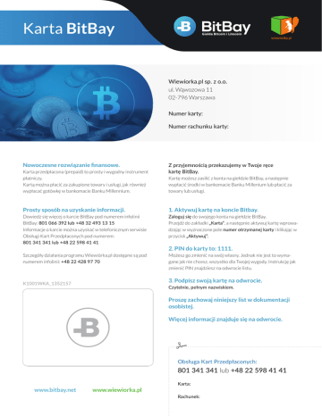 Karta BitBay Wiewiorka.pl sp. z o.o. ul. Wąwozowa 11 02-796 Warszawa Numer karty: Numer rachunku karty: Nowoczesne rozwiązanie finansowe. Karta przedpłacona (prepaid) to prosty i wygodny instrument płatniczy. Kartą można płacić za zakupione towary i usługi, jak również wypłacać gotówkę w bankomacie Banku Millennium. Z przyjemnością przekazujemy w Twoje ręce kartę BitBay. Kartę możesz zasilić z konta na giełdzie BitBay, a następnie wypłacić środki w bankomacie Banku Millenium lub płacić za towary lub usługi. Prosty sposób na uzyskanie informacji. 1. Aktywuj kartę na koncie Bitbay. Dowiedz się więcej o karcie BitBay pod numerem infolinii BitBay: 801 066 392 lub +48 32 493 13 15 Informacje o karcie można uzyskać w telefonicznym serwisie Obsługi Kart Przedpłaconych pod numerem: 801 341 341 lub +48 22 598 41 41 Zaloguj się do swojego konta na giełdzie BitBay. Przejdź do zakładki „Karta”, a następnie aktywuj kartę wprowadzając w wyznaczone pole numer otrzymanej karty i klikając w przycisk „Aktywuj”. 2. PIN do karty to: 1111. Szczegóły działania programu Wiewiórka.pl dostępne są pod numerem infolinii: +48 22 428 97 70 Możesz go zmienić na swój własny. Jednak nie jest to wymagane jak nie chcesz, wszystko dla Twojej wygody. Instrukcję jak zmienić PIN znajdziesz na odwrocie listu. 3. Podpisz swoją kartę na odwrocie. K1001WKA_1352157 Czytelnie, pełnym nazwiskiem. Proszę zachowaj niniejszy list w dokumentacji osobistej. Więcej informacji znajduje się na odwrocie. Obsługa Kart Przedpłaconych: 801 341 341 lub +48 22 598 41 41 Karta: www.bitbay.net www.wiewiorka.pl Rachunek: Karta BitBay Drogi użytkowniku karty Prepaid Wiewiórka.pl! We wszystkich bankomatach Banku Millennium możesz bez opłat: • • • • zmienić PIN do karty, uzyskać informację o aktualnym saldzie środków dostępnych na rachunku karty, uzyskać informację o ostatnich 10 operacjach zarejestrowanych na rachunku karty, wypłacić środki znajdujące się na karcie. Wypłacić środki możesz również w innych bankomatach w Polsce (nie należących do Banku Millennium), jednak wiąże się to z opłatą 2 PLN. Kanałem uzyskiwania informacji o karcie oraz zarządzania nią jest automatyczny telefoniczny serwis Obsługi Kart Przedpłaconych. Dzwoniąc pod numer 801 341 341 lub +48 22 598 41 41, po uprzednim zalogowaniu, możesz: • uzyskać informację o aktualnym saldzie środków dostępnych na rachunku karty, • uzyskać informację o ostatnich 5 operacjach zarejestrowanych na rachunku karty, • zastrzec kartę, • zmienić PIN do karty, • odblokować PIN – w przypadku dokonania prób transakcji potwierdzonych niepoprawnym kodem PIN w liczbie większej niż trzy, możliwość dokonywania dalszych transakcji potwierdzonych kodem PIN zostaje zablokowana. W celu przywrócenia możliwości dokonywania transakcji potwierdzanych kodem PIN niezbędne jest odblokowanie PIN. Logowanie w telefonicznym serwisie Obsługi Kart Przedpłaconych. Dzwoniąc pod numer 801 341 341 lub +48 22 598 41 41 będziesz poproszony o podanie następujących danych w celu weryfikacji: 1. 8-iem ostatnich cyfr z numeru karty → okienko z Twoimi indywidualnymi danymi umieściliśmy na przedniej stronie w prawym dolnym rogu listu. 2. 9-ięc ostatnich cyfr z numeru rachunku → okienko z Twoimi indywidualnymi danymi umieściliśmy na przedniej stronie w prawym dolnym rogu listu. 3. Kodu PIN do karty. Twój PIN to 1111. Jeśli nie ustawiałeś własnego numeru PIN wcześniej. Zastrzeżenie karty przedpłaconej. Jeżeli utracisz swoją kartę lub ulegnie ona zniszczeniu, należy niezwłocznie to zgłosić. Zastrzeżenie karty można zrealizować: • za pośrednictwem serwisu Obsługi Kart Przedpłaconych, dzwoniąc pod numer 801 341 341 lub +48 22 598 41 41, • skontaktować sie z Wiewiórka.pl - dzwoniąc pod numer +48 22 428 97 70. Reklamacje. W przypadku stwierdzenia niezgodności dotyczących księgowania operacji na rachunku karty przedpłaconej, błędów lub innych nieprawidłowości w przeprowadzaniu rozliczeń, należy zgłosić ten fakt pod numerem infolinii Wiewiórka.pl, dzwoniąc pod numer +48 22 428 97 70. Infolinia BitBay: 801 066 392 lub +48 32 493 13 15 Infolinia Wiewiórka.pl: 22 428 97 70 www.bitbay.net www.wiewiorka.pl