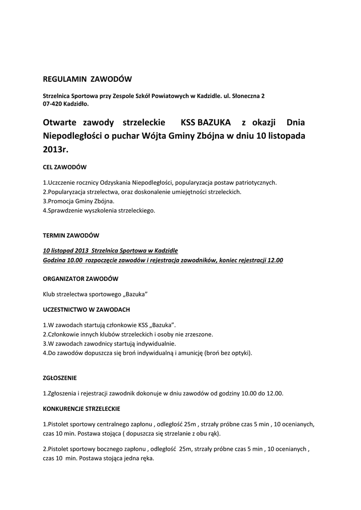 REGULAMIN ZAWODÓW Strzelnica Sportowa przy Zespole Szkół Powiatowych w Kadzidle. ul. Słoneczna 2 07-420 Kadzidło. Otwarte zawody strzeleckie KSS BAZUKA z okazji Dnia Niepodległości o puchar Wójta Gminy Zbójna w dniu 10 listopada 2013r. CEL ZAWODÓW 1.Uczczenie rocznicy Odzyskania Niepodległości, popularyzacja postaw patriotycznych. 2.Popularyzacja strzelectwa, oraz doskonalenie umiejętności strzeleckich. 3.Promocja Gminy Zbójna. 4.Sprawdzenie wyszkolenia strzeleckiego. TERMIN ZAWODÓW 10 listopad 2013 Strzelnica Sportowa w Kadzidle Godzina 10.00 rozpoczęcie zawodów i rejestracja zawodników, koniec rejestracji 12.00 ORGANIZATOR ZAWODÓW Klub strzelectwa sportowego „Bazuka” UCZESTNICTWO W ZAWODACH 1.W zawodach startują członkowie KSS „Bazuka”. 2.Członkowie innych klubów strzeleckich i osoby nie zrzeszone. 3.W zawodach zawodnicy startują indywidualnie. 4.Do zawodów dopuszcza się broń indywidualną i amunicję (broń bez optyki). ZGŁOSZENIE 1.Zgłoszenia i rejestracji zawodnik dokonuje w dniu zawodów od godziny 10.00 do 12.00. KONKURENCJE STRZELECKIE 1.Pistolet sportowy centralnego zapłonu , odległość 25m , strzały próbne czas 5 min , 10 ocenianych, czas 10 min. Postawa stojąca ( dopuszcza się strzelanie z obu rąk). 2.Pistolet sportowy bocznego zapłonu , odległość 25m, strzały próbne czas 5 min , 10 ocenianych , czas 10 min. Postawa stojąca jedna ręka. 3.Karabin sportowy bocznego zapłonu , odległość 50m, strzały próbne czas 5 min , 10 ocenianych, czas 10 min. Postawa leżąca bez pasa, broń podparta w jednym miejscu. 4.Super finał karabin bocznego zapłonu , odległość 50m , strzały próbne czas 5 min, ocenianych czas 5 min. ZASADY KLASYFIKACJI 1.Poszczególne konkurencje wygrywa zawodnik z największą liczbą punktów w danej konkurencji. Nie ma miejsc ex aequo, jeżeli zawodnik uzyskał taką samą liczbę punktów jak inny wygrywa zawodnik z większą liczbą dziesiątek centralnych,( bocznych dziewiątek, czyli większej liczbie punktowej). 2.Do super finału przechodzi 10 zawodników z największą liczbą punktów uzyskanych w trzech konkurencjach (trójboju). W pierwszej kolejności w celu rozstrzygnięcia miejsca brane są wyniki z konkurencji: Psp 10, następnie Ksp 10 i jako trzecie Pcz 10. Kolejność strzelania oraz numer stanowiska będą losowane. Finał strzelany będzie w dwóch zmianach po 5 zawodników. 3.Super finał wygrywa zawodnik który uzyskał najwięcej punktów. Jeżeli zawodnicy uzyskają taką sama liczbę punktów ,wygrywa zawodnik z większą liczbą dziesiątek centralnych ,( bocznych, dziewiątek, czyli większej liczbie punktowej) itd... W przypadku takiej samej liczby punktów i nie rozstrzygnięcia konkursu zawodnicy oddają po jednym strzale aż do rozstrzygnięcia ( czasie 1 min ). Strzelanie odbywa się w postawie leżącej bez pasa, broń podparta w jednym miejscu. NAGRODY 1. Za poszczególne konkurencje zostają przyznane nagrody w postaci bagnetów. 2. Nagrodą za super finał jest szabla Marszałka (replika). POSTANOWIENIA KOŃCOWE 1. Zawody zostaną przeprowadzone zgodnie z regulaminem PZSS i niniejszym regulaminem. 2.Klasyfikacja poszczególnych konkurencji przeprowadzona zostaje w dniu zawodów. 3. Super finał o szablę Marszałka odbędzie się w dniu zawodów natychmiast po zliczeniu wyników. 4. Zawodnicy zwracają koszty amunicji i tarcz. Wpłacają 10pln wpisowego za każdą konkurencję. Komunikat z zawodów będzie przesłany do PZSS i umieszczony na stronie internetowej KSS BAZUKA. Zarząd KSS „BAZUKA”