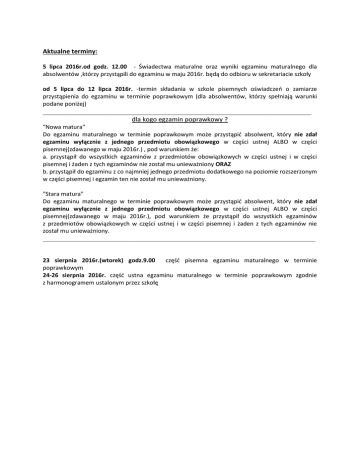 Aktualne terminy: 5 lipca 2016r.od godz. 12.00 - Świadectwa maturalne oraz wyniki egzaminu maturalnego dla absolwentów ,którzy przystąpili do egzaminu w maju 2016r. będą do odbioru w sekretariacie szkoły od 5 lipca do 12 lipca 2016r. -termin składania w szkole pisemnych oświadczeń o zamiarze przystąpienia do egzaminu w terminie poprawkowym (dla absolwentów, którzy spełniają warunki podane poniżej) __________________________________________________________________________ dla kogo egzamin poprawkowy ? "Nowa matura" Do egzaminu maturalnego w terminie poprawkowym może przystąpić absolwent, który nie zdał egzaminu wyłącznie z jednego przedmiotu obowiązkowego w części ustnej ALBO w części pisemnej(zdawanego w maju 2016r.) , pod warunkiem że: a. przystąpił do wszystkich egzaminów z przedmiotów obowiązkowych w części ustnej i w części pisemnej i żaden z tych egzaminów nie został mu unieważniony ORAZ b. przystąpił do egzaminu z co najmniej jednego przedmiotu dodatkowego na poziomie rozszerzonym w części pisemnej i egzamin ten nie został mu unieważniony. "Stara matura" Do egzaminu maturalnego w terminie poprawkowym może przystąpić absolwent, który nie zdał egzaminu wyłącznie z jednego przedmiotu obowiązkowego w części ustnej ALBO w części pisemnej(zdawanego w maju 2016r.), pod warunkiem że przystąpił do wszystkich egzaminów z przedmiotów obowiązkowych w części ustnej i w części pisemnej i żaden z tych egzaminów nie został mu unieważniony. __________________________________________________________________________________ 23 sierpnia 2016r.(wtorek) godz.9.00 część pisemna egzaminu maturalnego w terminie poprawkowym 24-26 sierpnia 2016r. część ustna egzaminu maturalnego w terminie poprawkowym zgodnie z harmonogramem ustalonym przez szkołę