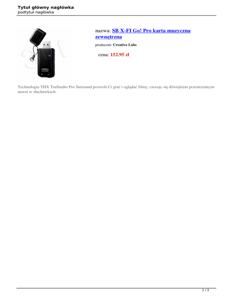 Tytuł główny nagłówka podtytuł nagłówka nazwa: SB X-FI Go! Pro karta muzyczna zewnętrzna producent: Creative Labs cena: 152.95 zł Technologia THX TruStudio Pro Surround pozwoli Ci grać i oglądać filmy, ciesząc się dźwiękiem przestrzennym nawet w słuchawkach. 1/2 Tytuł główny nagłówka podtytuł nagłówka Kod Producenta www Interfejs Zestaw zawiera: Typ Pilot Rodzaj wyjść Rodzaj wejść Producent układu Model układu Wyjście cyfrowe Rodzaj wyjść cyfrowych Wejście cyfrowe Rodzaj wejść cyfrowych Game Port Dodatkowy panel nazwa wartość 70SB129000002 http://pl.store.creative.com/products/produ ct.aspx?catid=1&pid=20056 USB Karta dźwiękowa Sound Blaster X-Fi Go! Pro,kabel USB,instrukcja obsługi,płyta CD z oprogramowaniem. Zewnętrzna Nie Jedno stereofoniczne gniazdo 3,50 mm (1/8 cala) typu jack pełniące rolę analogowego wyjścia liniowego lub wyjścia słuchawkowego Jedno stereofoniczne gniazdo 3,50 mm (1/8 cala) typu jack pełniące rolę wejścia mikrofonowego Creative Sound Blaster Brak Brak Elektryczne Brak Nie Brak 2/2