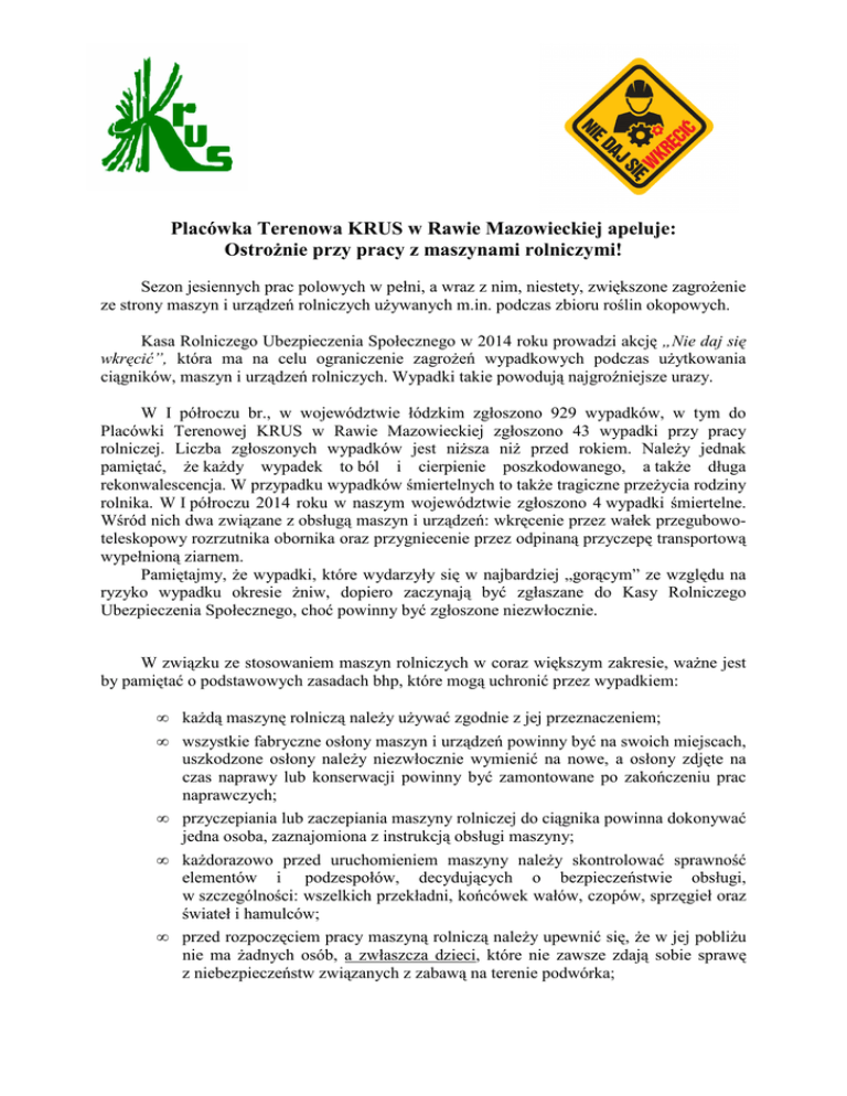 Placówka Terenowa KRUS w Rawie Mazowieckiej apeluje: Ostrożnie przy pracy z maszynami rolniczymi! Sezon jesiennych prac polowych w pełni, a wraz z nim, niestety, zwiększone zagrożenie ze strony maszyn i urządzeń rolniczych używanych m.in. podczas zbioru roślin okopowych. Kasa Rolniczego Ubezpieczenia Społecznego w 2014 roku prowadzi akcję „Nie daj się wkręcić”, która ma na celu ograniczenie zagrożeń wypadkowych podczas użytkowania ciągników, maszyn i urządzeń rolniczych. Wypadki takie powodują najgroźniejsze urazy. W I półroczu br., w województwie łódzkim zgłoszono 929 wypadków, w tym do Placówki Terenowej KRUS w Rawie Mazowieckiej zgłoszono 43 wypadki przy pracy rolniczej. Liczba zgłoszonych wypadków jest niższa niż przed rokiem. Należy jednak pamiętać, że każdy wypadek to ból i cierpienie poszkodowanego, a także długa rekonwalescencja. W przypadku wypadków śmiertelnych to także tragiczne przeżycia rodziny rolnika. W I półroczu 2014 roku w naszym województwie zgłoszono 4 wypadki śmiertelne. Wśród nich dwa związane z obsługą maszyn i urządzeń: wkręcenie przez wałek przegubowoteleskopowy rozrzutnika obornika oraz przygniecenie przez odpinaną przyczepę transportową wypełnioną ziarnem. Pamiętajmy, że wypadki, które wydarzyły się w najbardziej „gorącym” ze względu na ryzyko wypadku okresie żniw, dopiero zaczynają być zgłaszane do Kasy Rolniczego Ubezpieczenia Społecznego, choć powinny być zgłoszone niezwłocznie. W związku ze stosowaniem maszyn rolniczych w coraz większym zakresie, ważne jest by pamiętać o podstawowych zasadach bhp, które mogą uchronić przez wypadkiem: • • każdą maszynę rolniczą należy używać zgodnie z jej przeznaczeniem; wszystkie fabryczne osłony maszyn i urządzeń powinny być na swoich miejscach, uszkodzone osłony należy niezwłocznie wymienić na nowe, a osłony zdjęte na czas naprawy lub konserwacji powinny być zamontowane po zakończeniu prac naprawczych; • przyczepiania lub zaczepiania maszyny rolniczej do ciągnika powinna dokonywać jedna osoba, zaznajomiona z instrukcją obsługi maszyny; • każdorazowo przed uruchomieniem maszyny należy skontrolować sprawność elementów i podzespołów, decydujących o bezpieczeństwie obsługi, w szczególności: wszelkich przekładni, końcówek wałów, czopów, sprzęgieł oraz świateł i hamulców; • przed rozpoczęciem pracy maszyną rolniczą należy upewnić się, że w jej pobliżu nie ma żadnych osób, a zwłaszcza dzieci, które nie zawsze zdają sobie sprawę z niebezpieczeństw związanych z zabawą na terenie podwórka; • do pracy z wykorzystaniem maszyn i narzędzi rolniczych należy zakładać ubrania przylegające do ciała, bez zwisających elementów oraz buty z podeszwą zmniejszającą ryzyko poślizgu; • maszyny rolnicze należy utrzymywać w czystości, elementy elektryczne trzeba często oczyszczać z kurzu i pyłu, aby zapobiec zagrożeniom pożarowym; • nie należy przewozić ludzi na pracujących lub transportowanych maszynach, chyba, że producent dopuszcza taką możliwość, a maszyny są wyposażone w siedziska dla pasażerów; • koła i pasy napędowe, przekładanie, wały przegubowo-teleskopowe oraz końcówki wałów bezwzględnie muszą posiadać komplet osłon; • osprzęt uruchamiający (linki, łańcuchy, drążki itp.) urządzeń zdalnie sterowanych powinien być tak ułożony, aby we wszystkich położeniach transportowych i roboczych nie doszło do samoczynnego uruchomienia; • podczas podłączania węży hydraulicznych do układu hydraulicznego ciągnika należy zwrócić uwagę, aby zarówno układ hydrauliczny urządzenia, jak i ciągnika był pozbawiony ciśnienia; • podczas przemieszczania się maszyn po drogach publicznych, powinny one znajdować się w pozycji transportowej; • • niedozwolona jest praca maszynami naprawianymi prowizorycznie; każdorazowo przed opuszczeniem ciągnika lub maszyny należy odpowiednio zabezpieczyć sprzęt, np. maszynę zawieszaną na ciągniku trzeba całkowicie opuścić, następnie można wyłączyć silnik i wyjąć kluczyk ze stacyjki; • w celu uniknięcia samoczynnego przetoczenia, wszystkie maszyny w czasie postoju powinny być zabezpieczone klinami podłożonymi pod koła; • dołączanie i odłączanie wałków przegubowo-teleskopowych można wykonywać tylko przy wyłączonym napędzie wałka odbioru mocy, wyłączonym silniku ciągnika i po wyjęciu kluczyka ze stacyjki. Prosimy wszystkich rolników o zachowanie szczególnej ostrożności podczas pracy z maszynami rolniczymi oraz o stosowanie opisanych powyżej zasad bezpiecznej pracy. Unikniemy w ten sposób niepotrzebnych problemów, bólu, cierpienia i stresów. Elżbieta Nawrocka Dyrektor Oddziału Regionalnego KRUS w Łodzi