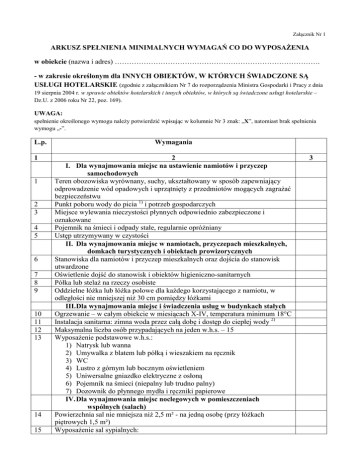 Załącznik Nr 1 ARKUSZ SPEŁNIENIA MINIMALNYCH WYMAGAŃ CO DO WYPOSAŻENIA w obiekcie (nazwa i adres) …………………………………………………………………………. - w zakresie określonym dla INNYCH OBIEKTÓW, W KTÓRYCH ŚWIADCZONE SĄ USŁUGI HOTELARSKIE (zgodnie z załącznikiem Nr 7 do rozporządzenia Ministra Gospodarki i Pracy z dnia 19 sierpnia 2004 r. w sprawie obiektów hotelarskich i innych obiektów, w których są świadczone usługi hotelarskie – Dz.U. z 2006 roku Nr 22, poz. 169). UWAGA: spełnienie określonego wymogu należy potwierdzić wpisując w kolumnie Nr 3 znak: „X”, natomiast brak spełnienia wymogu „-”. L.p. 1 1 2 3 4 5 6 7 8 9 10 11 12 13 14 15 Wymagania 2 I. Dla wynajmowania miejsc na ustawienie namiotów i przyczep samochodowych Teren obozowiska wyrównany, suchy, ukształtowany w sposób zapewniający odprowadzenie wód opadowych i uprzątnięty z przedmiotów mogących zagrażać bezpieczeństwu Punkt poboru wody do picia 1) i potrzeb gospodarczych Miejsce wylewania nieczystości płynnych odpowiednio zabezpieczone i oznakowane Pojemnik na śmieci i odpady stałe, regularnie opróżniany Ustęp utrzymywany w czystości II. Dla wynajmowania miejsc w namiotach, przyczepach mieszkalnych, domkach turystycznych i obiektach prowizorycznych Stanowiska dla namiotów i przyczep mieszkalnych oraz dojścia do stanowisk utwardzone Oświetlenie dojść do stanowisk i obiektów higieniczno-sanitarnych Półka lub stelaż na rzeczy osobiste Oddzielne łóżka lub łóżka polowe dla każdego korzystającego z namiotu, w odległości nie mniejszej niż 30 cm pomiędzy łóżkami III. Dla wynajmowania miejsc i świadczenia usług w budynkach stałych Ogrzewanie – w całym obiekcie w miesiącach X-IV, temperatura minimum 18°C Instalacja sanitarna: zimna woda przez całą dobę i dostęp do ciepłej wody 2) Maksymalna liczba osób przypadających na jeden w.h.s. – 15 Wyposażenie podstawowe w.h.s.: 1) Natrysk lub wanna 2) Umywalka z blatem lub półką i wieszakiem na ręcznik 3) WC 4) Lustro z górnym lub bocznym oświetleniem 5) Uniwersalne gniazdko elektryczne z osłoną 6) Pojemnik na śmieci (niepalny lub trudno palny) 7) Dozownik do płynnego mydła i ręczniki papierowe IV. Dla wynajmowania miejsc noclegowych w pomieszczeniach wspólnych (salach) Powierzchnia sal nie mniejsza niż 2,5 m² - na jedną osobę (przy łóżkach piętrowych 1,5 m²) Wyposażenie sal sypialnych: 3 16 17 18 19 20 21 22 23 1) Łóżka jednoosobowe o wymiarach minimum 80 x 190 cm 2) Oddzielnie zamykane szafki dla każdej osoby 3) Stół 4) Krzesła lub taborety (1 na osobę) lub ławy 5) Wieszaki na odzież wierzchnią 6) Lustro 7) Oświetlenie ogólne Dostęp do w.h.s. jak w lp. 12 i 13 V. Dla wynajmowania samodzielnych pokoi Powierzchnia mieszkalna w m²: 1) Pokój 1- i 2-osobowy – 6 m² 2) Pokój większy niż 2-osobowy – dodatkowo 2 m² na każdą nastepną osobę3) Zestaw wyposażenia meblowego: 1) Łóżka jednoosobowe o wymiarach minimum 80 x 190 cm lub łóżka dwuosobowe o wymiarach minimum 120 x 190 cm 2) Nocny stolik lub półka przy każdym łóżku 3) Stół lub stolik 4) Krzesło lub taboret (1 na osobę, lecz nie mniej niż 2 na pokój) lub ława 5) Wieszak na odzież oraz półka lub stelaż na rzeczy osobiste Pościel dla jednej osoby: 1) Kołdra lub dwa koce 2) Poduszka 3) Poszwa 4) Poszewka na poduszkę 5) Prześcieradło Oświetlenie – minimum jeden punkt świetlny o mocy 60 W Zasłony okienne zaciemniające Dostęp do w.h.s. jak w lp. 12 i 13 Kosz na śmieci niepalny lub trudno zapalny Objaśnienia odnośników i skrótów: 1) dopuszcza się miejsca biwakowania przy szlakach wodnych bez punktu poboru wody do picia, 2) minimum dwie godziny rano i dwie godziny wieczorem o ustalonych porach, 3) w pomieszczeniach o wysokości co najmniej 2,5 m dopuszcza się łóżka piętrowe – powierzchnia pokoju może zostać zmniejszona o 20%, w.h.s. – węzeł higieniczno-sanitarny. ………………………………. miejscowość, data …………………………………………… czytelny podpis wnioskodawcy