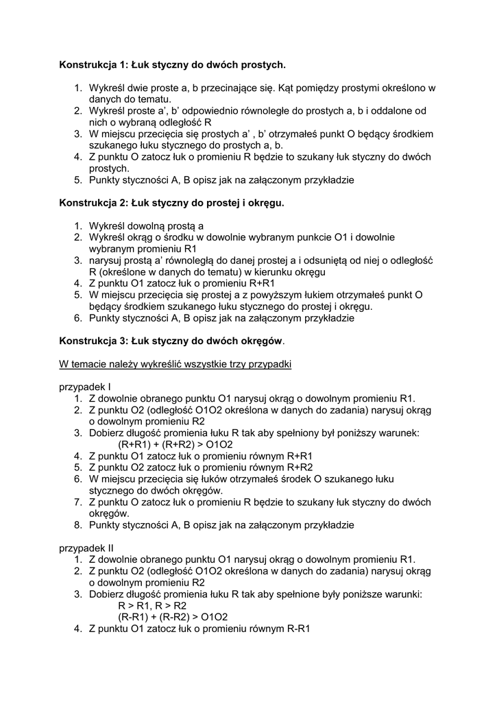 Konstrukcja 1: Łuk styczny do dwóch prostych. 1. Wykreśl dwie proste a, b przecinające się. Kąt pomiędzy prostymi określono w danych do tematu. 2. Wykreśl proste a’, b’ odpowiednio równoległe do prostych a, b i oddalone od nich o wybraną odległość R 3. W miejscu przecięcia się prostych a’ , b’ otrzymałeś punkt O będący środkiem szukanego łuku stycznego do prostych a, b. 4. Z punktu O zatocz łuk o promieniu R będzie to szukany łuk styczny do dwóch prostych. 5. Punkty styczności A, B opisz jak na załączonym przykładzie Konstrukcja 2: Łuk styczny do prostej i okręgu. 1. Wykreśl dowolną prostą a 2. Wykreśl okrąg o środku w dowolnie wybranym punkcie O1 i dowolnie wybranym promieniu R1 3. narysuj prostą a’ równoległą do danej prostej a i odsuniętą od niej o odległość R (określone w danych do tematu) w kierunku okręgu 4. Z punktu O1 zatocz łuk o promieniu R+R1 5. W miejscu przecięcia się prostej a z powyższym łukiem otrzymałeś punkt O będący środkiem szukanego łuku stycznego do prostej i okręgu. 6. Punkty styczności A, B opisz jak na załączonym przykładzie Konstrukcja 3: Łuk styczny do dwóch okręgów. W temacie należy wykreślić wszystkie trzy przypadki przypadek I 1. Z dowolnie obranego punktu O1 narysuj okrąg o dowolnym promieniu R1. 2. Z punktu O2 (odległość O1O2 określona w danych do zadania) narysuj okrąg o dowolnym promieniu R2 3. Dobierz długość promienia łuku R tak aby spełniony był poniższy warunek: (R+R1) + (R+R2) > O1O2 4. Z punktu O1 zatocz łuk o promieniu równym R+R1 5. Z punktu O2 zatocz łuk o promieniu równym R+R2 6. W miejscu przecięcia się łuków otrzymałeś środek O szukanego łuku stycznego do dwóch okręgów. 7. Z punktu O zatocz łuk o promieniu R będzie to szukany łuk styczny do dwóch okręgów. 8. Punkty styczności A, B opisz jak na załączonym przykładzie przypadek II 1. Z dowolnie obranego punktu O1 narysuj okrąg o dowolnym promieniu R1. 2. Z punktu O2 (odległość O1O2 określona w danych do zadania) narysuj okrąg o dowolnym promieniu R2 3. Dobierz długość promienia łuku R tak aby spełnione były poniższe warunki: R > R1, R > R2 (R-R1) + (R-R2) > O1O2 4. Z punktu O1 zatocz łuk o promieniu równym R-R1 5. Z punktu O2 zatocz łuk o promieniu równym R-R2 6. W miejscu przecięcia się łuków otrzymałeś środek O szukanego łuku stycznego do dwóch okręgów. 7. Z punktu O zatocz łuk o promieniu R będzie to szukany łuk styczny do dwóch okręgów. 8. Punkty styczności A, B opisz jak na załączonym przykładzie przypadek III 1. Z dowolnie obranego punktu O1 narysuj okrąg o dowolnym promieniu R1. 2. Z punktu O2 (odległość O1O2 określona w danych do zadania) narysuj okrąg o dowolnym promieniu R2 3. Dobierz długość promienia łuku R tak aby spełnione były poniższe warunki: R > R1 (R-R1) + (R+R2) > O1O2 4. Z punktu O1 zatocz łuk o promieniu równym R-R1 5. Z punktu O2 zatocz łuk o promieniu równym R+R2 6. W miejscu przecięcia się łuków otrzymałeś środek O szukanego łuku stycznego do dwóch okręgów. 7. Z punktu O zatocz łuk o promieniu R będzie to szukany łuk styczny do dwóch okręgów. 8. Punkty styczności A, B opisz jak na załączonym przykładzie Konstrukcja 4: Spirala Archimedesa. 1. Wykreśl kwadrat ABCD (bok k kwadratu określony w danych do tematu) 2. wykreśl półproste a, b, c, d zawierające odpowiednio boki AD, BA, CB, DC wg następującej reguły: - półprosta a z punktu A w kierunku D - półprosta b z punktu B w kierunku A - półprosta c z punktu C w kierunku B - półprosta d z punktu D w kierunku C 3. Z punktu B odłóż odległość k na półprostej c – otrzymałeś punk B1. Z punktu B zatocz łuk o promieniu k od punktu A do B1 4. Z punktu C odłóż odległość 2*k na półprostej d – otrzymałeś punk C1. Z punktu C zatocz łuk o promieniu 2*k od punktu B1 do C1 5. Z punktu D odłóż odległość 3*k na półprostej a – otrzymałeś punk D1. Z punktu D zatocz łuk o promieniu 3*k od punktu C1 do D1 6. Z punktu A odłóż odległość 4*k na półprostej b – otrzymałeś punk A1. Z punktu A zatocz łuk o promieniu 4*k od punktu D1 do A1 7. Z punktu B odłóż odległość 5*k na półprostej c – otrzymałeś punk B2. Z punktu B zatocz łuk o promieniu 5*k od punktu A1 do B2 8. Z punktu C odłóż odległość 6*k na półprostej d – otrzymałeś punk C2. Z punktu C zatocz łuk o promieniu 6*k od punktu B2 do C2 9. Z punktu D odłóż odległość 7*k na półprostej a – otrzymałeś punk D2. Z punktu D zatocz łuk o promieniu 7*k od punktu C2 do D2 10. Z punktu A odłóż odległość 8*k na półprostej b – otrzymałeś punk A2. Z punktu A zatocz łuk o promieniu 8*k od punktu D2 do A2 Konstrukcja 5: Elipsa. 1. Wykreśl dwa współśrodkowe okręgi (środek O) o promieniach R1, R2 (określonych w danych do tematu) 2. Wykreśl osie pionową i poziomą okręgów. Opisz punkty przecięcia się osi poziomej z większym okręgiem A, C (duża oś konstruowanej elipsy) oraz punkty przecięcia się osi pionowej z mniejszym okręgiem B, D (mała oś konstruowanej elipsy) 3. Każdą z ćwiartek okręgów podziel półprostymi rozchodzącymi się promieniście ze środka okręgów O na około 5 równych części (jak na rysunku). 4. Z punktów przecięcia się mniejszego okręgu z półprostymi poprowadź krótkie odcinki równoległe do osi poziomej (osi AC). 5. Z punktów przecięcia się większego okręgu z półprostymi poprowadź krótkie odcinki równoległe do osi pionowej (osi BD) tak by przecięły odpowiednie odcinki poziome. 6. Punkty otrzymane w wyniku przecięcia się odcinków poziomych i pionowych są punktami leżącymi na elipsie. 7. Korzystając z krzywika eliptycznego wykreśl po otrzymanych punktach elipsę. Konstrukcja 6: Hiperbola. 1. Wykreśl asymptoty hiperboli przecinające się w punkcie O 2. Zaznacz punkt A w określonej w danych do tematu odległości od asymptot 