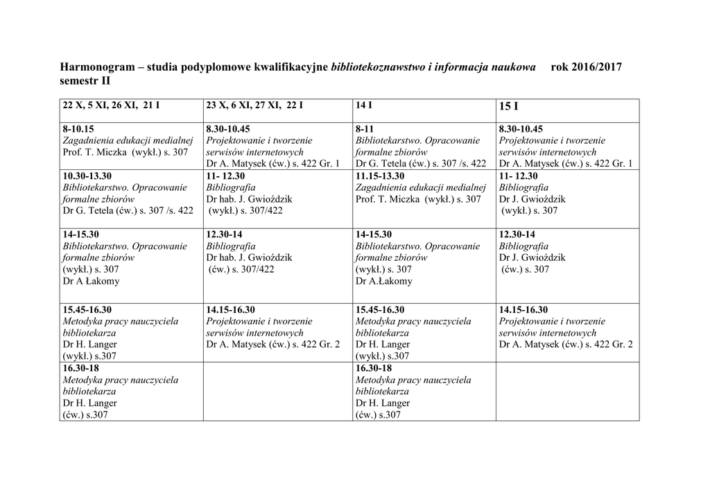 Harmonogram – studia podyplomowe kwalifikacyjne bibliotekoznawstwo i informacja naukowa semestr II rok 2016/2017 22 X, 5 XI, 26 XI, 21 I 23 X, 6 XI, 27 XI, 22 I 14 I 15 I 8-10.15 Zagadnienia edukacji medialnej Prof. T. Miczka (wykł.) s. 307 8.30-10.45 Projektowanie i tworzenie serwisów internetowych Dr A. Matysek (ćw.) s. 422 Gr. 1 11- 12.30 Bibliografia Dr hab. J. Gwioździk (wykł.) s. 307/422 8-11 Bibliotekarstwo. Opracowanie formalne zbiorów Dr G. Tetela (ćw.) s. 307 /s. 422 11.15-13.30 Zagadnienia edukacji medialnej Prof. T. Miczka (wykł.) s. 307 8.30-10.45 Projektowanie i tworzenie serwisów internetowych Dr A. Matysek (ćw.) s. 422 Gr. 1 11- 12.30 Bibliografia Dr J. Gwioździk (wykł.) s. 307 14-15.30 Bibliotekarstwo. Opracowanie formalne zbiorów (wykł.) s. 307 Dr A Łakomy 12.30-14 Bibliografia Dr hab. J. Gwioździk (ćw.) s. 307/422 14-15.30 Bibliotekarstwo. Opracowanie formalne zbiorów (wykł.) s. 307 Dr A.Łakomy 12.30-14 Bibliografia Dr J. Gwioździk (ćw.) s. 307 15.45-16.30 Metodyka pracy nauczyciela bibliotekarza Dr H. Langer (wykł.) s.307 16.30-18 Metodyka pracy nauczyciela bibliotekarza Dr H. Langer (ćw.) s.307 14.15-16.30 Projektowanie i tworzenie serwisów internetowych Dr A. Matysek (ćw.) s. 422 Gr. 2 15.45-16.30 Metodyka pracy nauczyciela bibliotekarza Dr H. Langer (wykł.) s.307 16.30-18 Metodyka pracy nauczyciela bibliotekarza Dr H. Langer (ćw.) s.307 14.15-16.30 Projektowanie i tworzenie serwisów internetowych Dr A. Matysek (ćw.) s. 422 Gr. 2 10.30-13.30 Bibliotekarstwo. Opracowanie formalne zbiorów Dr G. Tetela (ćw.) s. 307 /s. 422