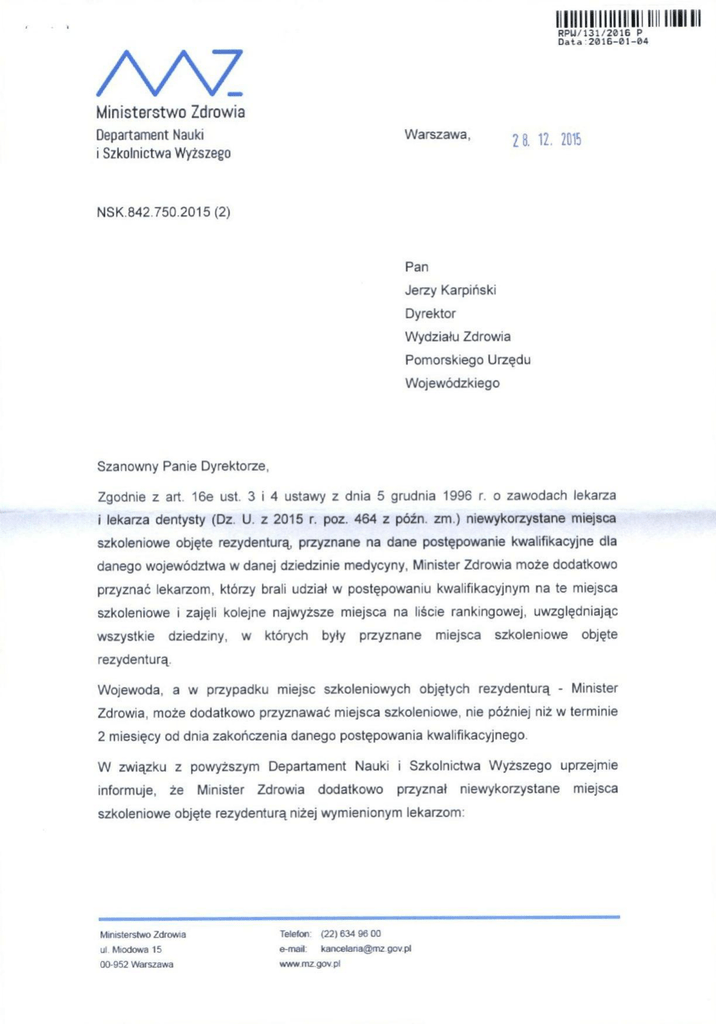 II RPU/131/2ei6 P Data 2016-01-04 AAZ Ministerstwo Zdrowia Departament Nauki i Szkolnictwa Wyzszego Warszawa. 28. 12, 2015 NSK.842 750.2015 (2) Pan Jerzy Karpihski Dyrektor Wydziatu Zdrowia Pomorskiego Urz^du Wojewodzkiego Szanowny Panie Dyrektorze, Zgodnie z art 16e ust. 3 i 4 ustawy z dnia 5 grudnia 1996 r. o zawodach lekarza 1 lekarza dentysty (Dz U. z 2015 r. poz. 464 z pozn. zm ) niewykorzystane miejsca szkoleniowe obj^te rezydentur^ przyznane na dane post^powanie kwalifikacyjne dia danego wojewodztwa w danej dziedzinie medycyny, Minister Zdrowia moze dodatkowo przyznac lekarzom, ktbrzy brali udzial w post^powaniu kwalifikacyjnym na te miejsca szkoleniowe i zaj§li kolejne najwyzsze miejsca na liscie rankingowej, uwzgl§dniaj^c wszystkie dziedziny, w ktorych byly przyznane miejsca szkoleniowe obj§te rezydentur^ Wojewoda, a w przypadku miejsc szkoleniowych obj^tych rezydentur^ - Minister Zdrowia, moze dodatkowo przyznawac miejsca szkoleniowe, nie pdzniej niz w terminie 2 miesi^cy od dnia zakohczenia danego post^powania kwalifikacyjnego W zwi^zku z powyzszym Departament Nauki i Szkolnictwa Wyzszego uprzejmie informuje, ze Minister Zdrowia dodatkowo przyznat niewykorzystane szkoleniowe obj^te rezydentur^ nizej wymienionym lekarzom: Minislerslwo Zdrowia Teletor (22) 634 96 00 ul Miodowa 15 e-mail kancelana@rTiz gov pi 00-952 Warszawa www mz gov pi miejsca MIejsce na Niezakwalifikowany liscie Lp. w trybie: rankingowej Wynik post^powania kwahrikacyjnego Wybrana specjaiizacja % Identyfikator wniosku w syslemie WORS 1, 5 rezydenckim 64,14% 79398 Otorynolaryngologia 2. 10 rezydenckim i pozarezydenckim 65.66% 77902 Potoznictwo i ginekologia 3. 11 rezydenckim 63,00% 76343 4. 13 rezydenckim 74,23% 79993 Radiologia i diagnostyka obrazowa 5. 14 rezydenckim 73.20% 70730 Radiologia i diagnostyka obrazowa 6 15 rezydenckim i pozarezydenckim 72,73% 74065 Radiologia i diagnostyka obrazowa 7. 16 rezydenckim 71,94% 70615 Radiologia i diagnostyka obrazowa 8, 17 rezydenckim 66,84% 73114 Radiologia i diagnostyka obrazowa 9. 18 rezydenckim i pozarezydenckim 65,98% 74369 Radiobgia i diagnostyka obrazowa 19 rezydenckim 64,50% 74579 Radiologia i diagnostyka obrazowa 10. Po(o2nictwo i ginekologia Z wyrazami szacunku, KTOR aci*«i yzszego" Mmla Ortawska-Hottimen