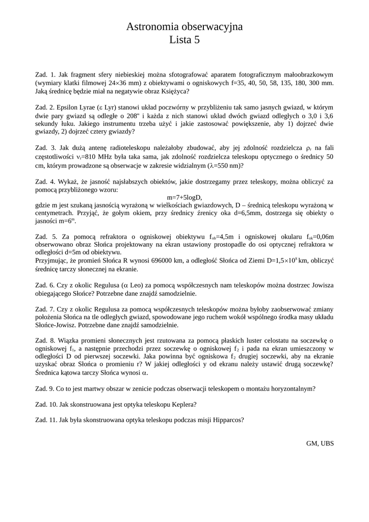 Astronomia obserwacyjna Lista 5 Zad. 1. Jak fragment sfery niebieskiej można sfotografować aparatem fotograficznym małoobrazkowym (wymiary klatki filmowej 24×36 mm) z obiektywami o ogniskowych f=35, 40, 50, 58, 135, 180, 300 mm. Jaką średnicę będzie miał na negatywie obraz Księżyca? Zad. 2. Epsilon Lyrae (ε Lyr) stanowi układ poczwórny w przybliżeniu tak samo jasnych gwiazd, w którym dwie pary gwiazd są odległe o 208'' i każda z nich stanowi układ dwóch gwiazd odległych o 3,0 i 3,6 sekundy łuku. Jakiego instrumentu trzeba użyć i jakie zastosować powiększenie, aby 1) dojrzeć dwie gwiazdy, 2) dojrzeć cztery gwiazdy? Zad. 3. Jak dużą antenę radioteleskopu należałoby zbudować, aby jej zdolność rozdzielcza ρr na fali częstotliwości νr=810 MHz była taka sama, jak zdolność rozdzielcza teleskopu optycznego o średnicy 50 cm, którym prowadzone są obserwacje w zakresie widzialnym (λ=550 nm)? Zad. 4. Wykaż, że jasność najsłabszych obiektów, jakie dostrzegamy przez teleskopy, można obliczyć za pomocą przybliżonego wzoru: m=7+5logD, gdzie m jest szukaną jasnością wyrażoną w wielkościach gwiazdowych, D – średnicą teleskopu wyrażoną w centymetrach. Przyjąć, że gołym okiem, przy średnicy źrenicy oka d=6,5mm, dostrzega się obiekty o jasności m=6m. Zad. 5. Za pomocą refraktora o ogniskowej obiektywu f ob=4,5m i ogniskowej okularu fok=0,06m obserwowano obraz Słońca projektowany na ekran ustawiony prostopadle do osi optycznej refraktora w odległości d=5m od obiektywu. Przyjmując, że promień Słońca R wynosi 696000 km, a odległość Słońca od Ziemi D=1,5×108 km, obliczyć średnicę tarczy słonecznej na ekranie. Zad. 6. Czy z okolic Regulusa (α Leo) za pomocą współczesnych nam teleskopów można dostrzec Jowisza obiegającego Słońce? Potrzebne dane znajdź samodzielnie. Zad. 7. Czy z okolic Regulusa za pomocą współczesnych teleskopów można byłoby zaobserwować zmiany położenia Słońca na tle odległych gwiazd, spowodowane jego ruchem wokół wspólnego środka masy układu Słońce-Jowisz. Potrzebne dane znajdź samodzielnie. Zad. 8. Wiązka promieni słonecznych jest rzutowana za pomocą płaskich luster celostatu na soczewkę o ogniskowej f1, a następnie przechodzi przez soczewkę o ogniskowej f 2 i pada na ekran umieszczony w odległości D od pierwszej soczewki. Jaka powinna być ogniskowa f 2 drugiej soczewki, aby na ekranie uzyskać obraz Słońca o promieniu r? W jakiej odległości y od ekranu należy ustawić drugą soczewkę? Średnica kątowa tarczy Słońca wynosi α. Zad. 9. Co to jest martwy obszar w zenicie podczas obserwacji teleskopem o montażu horyzontalnym? Zad. 10. Jak skonstruowana jest optyka teleskopu Keplera? Zad. 11. Jak była skonstruowana optyka teleskopu podczas misji Hipparcos? GM, UBS
