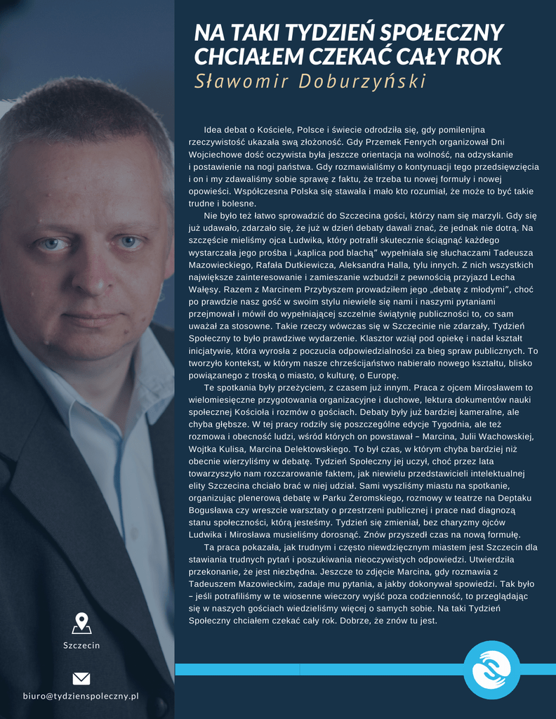 NA TAKI TYDZIEŃ SPOŁECZNY CHCIAŁEM CZEKAĆ CAŁY ROK Sławomir Doburzyński Idea debat o Kościele, Polsce i świecie odrodziła się, gdy pomilenijna rzeczywistość ukazała swą złożoność. Gdy Przemek Fenrych organizował Dni Wojciechowe dość oczywista była jeszcze orientacja na wolność, na odzyskanie i postawienie na nogi państwa. Gdy rozmawialiśmy o kontynuacji tego przedsięwzięcia i on i my zdawaliśmy sobie sprawę z faktu, że trzeba tu nowej formuły i nowej opowieści. Współczesna Polska się stawała i mało kto rozumiał, że może to być takie trudne i bolesne. Nie było też łatwo sprowadzić do Szczecina gości, którzy nam się marzyli. Gdy się już udawało, zdarzało się, że już w dzień debaty dawali znać, że jednak nie dotrą. Na szczęście mieliśmy ojca Ludwika, który potrafił skutecznie ściągnąć każdego wystarczała jego prośba i „kaplica pod blachą” wypełniała się słuchaczami Tadeusza Mazowieckiego, Rafała Dutkiewicza, Aleksandra Halla, tylu innych. Z nich wszystkich największe zainteresowanie i zamieszanie wzbudził z pewnością przyjazd Lecha Wałęsy. Razem z Marcinem Przybyszem prowadziłem jego „debatę z młodymi”, choć po prawdzie nasz gość w swoim stylu niewiele się nami i naszymi pytaniami przejmował i mówił do wypełniającej szczelnie świątynię publiczności to, co sam uważał za stosowne. Takie rzeczy wówczas się w Szczecinie nie zdarzały, Tydzień Społeczny to było prawdziwe wydarzenie. Klasztor wziął pod opiekę i nadał kształt inicjatywie, która wyrosła z poczucia odpowiedzialności za bieg spraw publicznych. To tworzyło kontekst, w którym nasze chrześcijaństwo nabierało nowego kształtu, blisko powiązanego z troską o miasto, o kulturę, o Europę. Te spotkania były przeżyciem, z czasem już innym. Praca z ojcem Mirosławem to wielomiesięczne przygotowania organizacyjne i duchowe, lektura dokumentów nauki społecznej Kościoła i rozmów o gościach. Debaty były już bardziej kameralne, ale chyba głębsze. W tej pracy rodziły się poszczególne edycje Tygodnia, ale też rozmowa i obecność ludzi, wśród których on powstawał – Marcina, Julii Wachowskiej, Wojtka Kulisa, Marcina Delektowskiego. To był czas, w którym chyba bardziej niż obecnie wierzyliśmy w debatę. Tydzień Społeczny jej uczył, choć przez lata towarzyszyło nam rozczarowanie faktem, jak niewielu przedstawicieli intelektualnej elity Szczecina chciało brać w niej udział. Sami wyszliśmy miastu na spotkanie, organizując plenerową debatę w Parku Żeromskiego, rozmowy w teatrze na Deptaku Bogusława czy wreszcie warsztaty o przestrzeni publicznej i prace nad diagnozą stanu społeczności, którą jesteśmy. Tydzień się zmieniał, bez charyzmy ojców Ludwika i Mirosława musieliśmy dorosnąć. Znów przyszedł czas na nową formułę. Ta praca pokazała, jak trudnym i często niewdzięcznym miastem jest Szczecin dla stawiania trudnych pytań i poszukiwania nieoczywistych odpowiedzi. Utwierdziła przekonanie, że jest niezbędna. Jeszcze to zdjęcie Marcina, gdy rozmawia z Tadeuszem Mazowieckim, zadaje mu pytania, a jakby dokonywał spowiedzi. Tak było – jeśli potrafiliśmy w te wiosenne wieczory wyjść poza codzienność, to przeglądając się w naszych gościach wiedzieliśmy więcej o samych sobie. Na taki Tydzień Społeczny chciałem czekać cały rok. Dobrze, że znów tu jest. Szczecin [email protected]