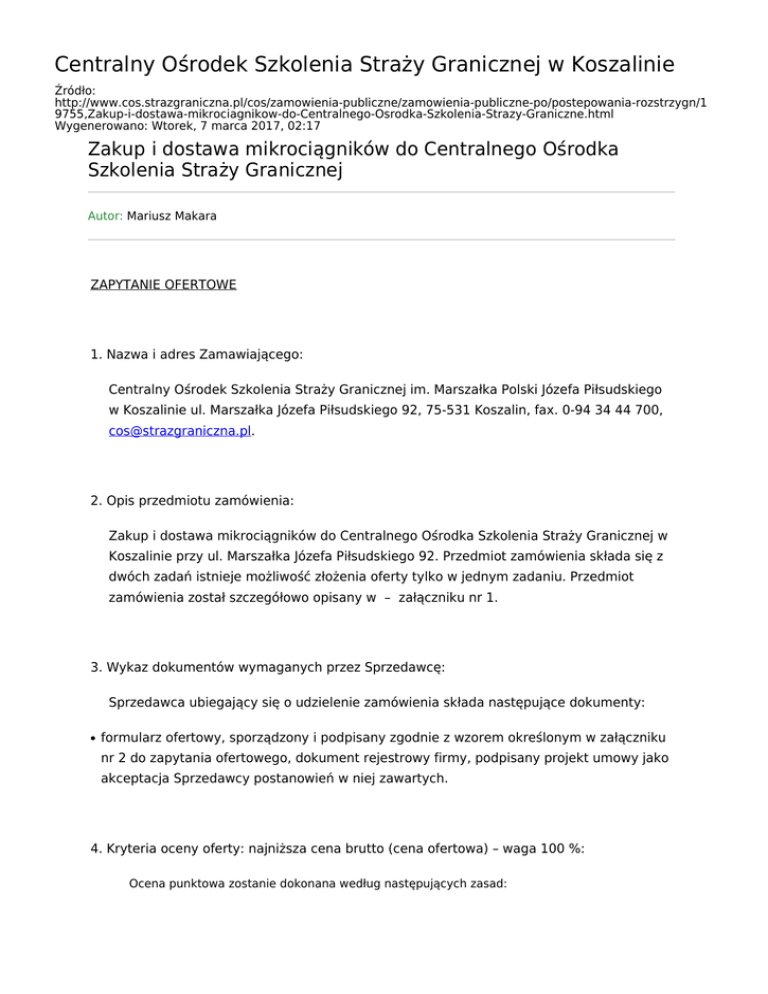 Centralny Ośrodek Szkolenia Straży Granicznej w Koszalinie Źródło: http://www.cos.strazgraniczna.pl/cos/zamowienia-publiczne/zamowienia-publiczne-po/postepowania-rozstrzygn/1 9755,Zakup-i-dostawa-mikrociagnikow-do-Centralnego-Osrodka-Szkolenia-Strazy-Graniczne.html Wygenerowano: Wtorek, 7 marca 2017, 02:17 Zakup i dostawa mikrociągników do Centralnego Ośrodka Szkolenia Straży Granicznej Autor: Mariusz Makara ZAPYTANIE OFERTOWE 1. Nazwa i adres Zamawiającego: Centralny Ośrodek Szkolenia Straży Granicznej im. Marszałka Polski Józefa Piłsudskiego w Koszalinie ul. Marszałka Józefa Piłsudskiego 92, 75-531 Koszalin, fax. 0-94 34 44 700, [email protected]. 2. Opis przedmiotu zamówienia: Zakup i dostawa mikrociągników do Centralnego Ośrodka Szkolenia Straży Granicznej w Koszalinie przy ul. Marszałka Józefa Piłsudskiego 92. Przedmiot zamówienia składa się z dwóch zadań istnieje możliwość złożenia oferty tylko w jednym zadaniu. Przedmiot zamówienia został szczegółowo opisany w – załączniku nr 1. 3. Wykaz dokumentów wymaganych przez Sprzedawcę: Sprzedawca ubiegający się o udzielenie zamówienia składa następujące dokumenty: ● formularz ofertowy, sporządzony i podpisany zgodnie z wzorem określonym w załączniku nr 2 do zapytania ofertowego, dokument rejestrowy firmy, podpisany projekt umowy jako akceptacja Sprzedawcy postanowień w niej zawartych. 4. Kryteria oceny oferty: najniższa cena brutto (cena ofertowa) – waga 100 %: Ocena punktowa zostanie dokonana według następujących zasad: za ofertę najkorzystniejszą zostanie uznana oferta, która uzyska najwyższą ilość punktów spośród ofert niepodlegających odrzuceniu w danym zadaniu. 5. Termin, miejsce, sposób i forma złożenia oferty: 1. ofertę należy złożyć w formie pisemnej w terminie do dnia 21 listopada 2016 r. godz. 1100; 2. miejsce, sposób i forma złożenia oferty – ofertę można: a. złożyć osobiście w siedzibie Zamawiającego, mieszczącej się w Koszalinie przy ul. Marszałka Józefa Piłsudskiego 92 – w Kancelarii Jawnej, do dnia 21 listopada 2016 r. godz. 1100, b. przesłać na adres Zamawiającego wskazany w ppkt a) do dnia 21 listopada 2016 r. do godz. 1100, c. przesłać fax-em na numer 0-94 34 44 700 do dnia 21 listopada 2016 r. do godz. 1100, d. przesłać pocztą elektroniczną do dnia 21 listopada 2016 r. do godz. 1100 na adres [email protected]; 1. na ofertę składają się: a. formularz ofertowy, b. dokument rejestrowy firmy, c. podpisany projekt umowy jako akceptacja Sprzedawcy postanowień w niej zawartych; 1. oferta musi być podpisana wyłącznie przez osobę lub osoby upoważnione z mocy prawa do składania oświadczeń woli w imieniu Sprzedawcy, a jeżeli osoba/osoby podpisujące ofertę działają na podstawie pełnomocnictwa, to pełnomocnictwo to musi być dołączone do formularza ofertowego. 6. Termin realizacji zamówienia: Termin realizacji zamówienia: od dnia podpisania umowy do dnia 22 grudnia 2016 r. 7. Oferta podlega odrzuceniu, jeśli pomimo wezwania Sprzedawcy do wyjaśnienia treści lub uzupełnenia oferty: 1. jest niezgodna z opisem przedmiotu zamówienia; 2. Sprzedawca nie potwierdził spełnienia określonych w zapytaniu ofertowym wymagań, np. poprzez niezłożenie wymaganych dokumentów. 8. Osoby upoważnione przez Zamawiającego do kontaktu ze Sprzedawcą w niniejszym postępowaniu: 1. chor. szt. SG Jacek Jarkiewicz (tel. 94 34 44 435) 2. Pani Dorota Skalska (tel. 94 34 44 192) Zamawiający zastrzega sobie możliwość zmiany warunków prowadzonego zapytania ofertowego oraz jego odwołania. ZAŁĄCZNIKI DO STRONY Formularz ofertowy (docx, 27.26 KB) Data publikacji 15.11.2016 08:00 Opis przedmiotu zamówienia (docx, 241.12 KB) Data publikacji 15.11.2016 08:00 Wzór umowy (rtf, 152.58 KB) Data publikacji 15.11.2016 08:00 Informacja o udzieleniu zamówienia (pdf, 317.05 KB) Data publikacji 24.11.2016 12:56