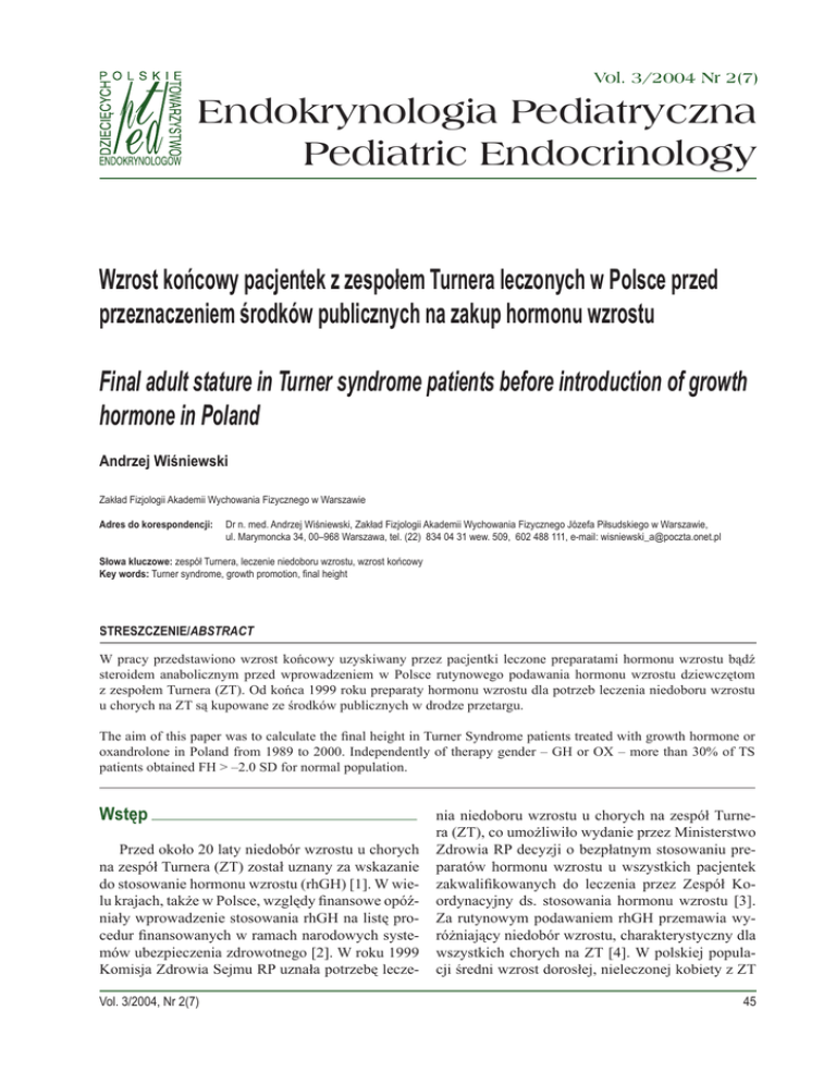 Vol. 3/2004 Nr 2(7) Endokrynologia Pediatryczna Pediatric Endocrinology Wzrost końcowy pacjentek z zespołem Turnera leczonych w Polsce przed przeznaczeniem środków publicznych na zakup hormonu wzrostu Final adult stature in Turner syndrome patients before introduction of growth hormone in Poland Andrzej Wiśniewski Zakład Fizjologii Akademii Wychowania Fizycznego w Warszawie Adres do korespondencji: Dr n. med. Andrzej Wiśniewski, Zakład Fizjologii Akademii Wychowania Fizycznego Józefa Piłsudskiego w Warszawie, ul. Marymoncka 34, 00–968 Warszawa, tel. (22) 834 04 31 wew. 509, 602 488 111, e-mail: [email protected] Słowa kluczowe: zespół Turnera, leczenie niedoboru wzrostu, wzrost końcowy Key words: Turner syndrome, growth promotion, final height STRESZCZENIE/ STRESZCZENIE/ABSTRACT W pracy przedstawiono wzrost końcowy uzyskiwany przez pacjentki leczone preparatami hormonu wzrostu bądź steroidem anabolicznym przed wprowadzeniem w Polsce rutynowego podawania hormonu wzrostu dziewczętom z zespołem Turnera (ZT). Od końca 1999 roku preparaty hormonu wzrostu dla potrzeb leczenia niedoboru wzrostu u chorych na ZT są kupowane ze środków publicznych w drodze przetargu. The aim of this paper was to calculate the final height in Turner Syndrome patients treated with growth hormone or oxandrolone in Poland from 1989 to 2000. Independently of therapy gender – GH or OX – more than 30% of TS patients obtained FH > –2.0 SD for normal population. Wstęp Przed około 20 laty niedobór wzrostu u chorych na zespół Turnera (ZT) został uznany za wskazanie do stosowanie hormonu wzrostu (rhGH) [1]. W wielu krajach, także w Polsce, względy finansowe opóźniały wprowadzenie stosowania rhGH na listę procedur finansowanych w ramach narodowych systemów ubezpieczenia zdrowotnego [2]. W roku 1999 Komisja Zdrowia Sejmu RP uznała potrzebę leczeVol. 3/2004, Nr 2(7) nia niedoboru wzrostu u chorych na zespół Turnera (ZT), co umożliwiło wydanie przez Ministerstwo Zdrowia RP decyzji o bezpłatnym stosowaniu preparatów hormonu wzrostu u wszystkich pacjentek zakwalifikowanych do leczenia przez Zespół Koordynacyjny ds. stosowania hormonu wzrostu [3]. Za rutynowym podawaniem rhGH przemawia wyróżniający niedobór wzrostu, charakterystyczny dla wszystkich chorych na ZT [4]. W polskiej populacji średni wzrost dorosłej, nieleczonej kobiety z ZT 45 Praca oryginalna Endokrynol. Ped., 3/2004;2(7):45-56 wynosi 142,1 cm i jest niższy o 23,4 cm od średniej wysokości 18-letniej zdrowej kobiety w populacji warszawskiej [4, 5]. Po raz pierwszy przysadkowy, ludzki hormon wzrostu u chorej na zespół Turnera zastosował RF Escamilla w szpitalu uniwersyteckim w San Francisco w roku 1959, prowadząc leczenie przez 114 dni [6, 7]. Współczesne leczenie niedoboru wzrostu u chorych na ZT zapoczątkował R. G. Rosenfeld, prowadząc od roku 1983 próby kliniczne z preparatem ludzkiego rekombinowanego hormonu wzrostu (rhGH) u 70 pacjentek [8–11]. W Polsce T. E. Romer i J. Zarzycki jako pierwsi przeprowadzili w roku 1989 badania kliniczne nad odpowiedzią wzrostową na ludzki rekombinowany hormon wzrostu u 10 chorych na ZT, a następnie w roku 1991 A. Wiśniewski i T. E. Romer rozpoczęli stosowanie rhGH (Norditropin, NovoNordisk) u 50 dziewcząt z ZT w wieku od 3 do 10 roku życia [12–15]. Leczenie tych pacjentek w Klinice Endokrynologii Instytutu „Pomnik Centrum Zdrowia Dziecka” w Warszawie, prowadzone aż do zakończenia ich wzrastania, przyczyniło się do udokumentowania zasadności rutynowego stosowania hormonu wzrostu u chorych na zespół Turnera. Celem pracy jest przedstawienie wartości wzrostu końcowego (FH) uzyskiwanego u dziewcząt leczonych przed wprowadzeniem w Polsce bezpłatnego, rutynowego podawania hormonu wzrostu chorym na zespół Turnera. Ocena obejmuje pa- cjentki zarówno otrzymujące preparaty hormonu wzrostu, jak i otrzymujące wyłącznie steroid anaboliczny o nazwie handlowej oxandrolon, który wobec niedostępności rhGH do roku 1999 był lekiem z wyboru w leczeniu niedoboru wzrostu w ZT. Oxandrolon był zalecany także w innych krajach prowadzących leczenie niedoboru wzrostu u chorych na ZT [10, 16, 17]. Materiał Badaniem objęto 207 chorych na ZT, u których leczenie niedoboru wzrostu rozpoczęto przed wprowadzeniem rutynowego i bezpłatnego stosowania hormonu wzrostu. W ocenie wzrostu końcowego nie uwzględniono pacjentek ze skrzywieniem kręgosłupa, którego leczenie wymagało zabiegu operacyjnego albo noszenia gorsetu ortopedycznego. Rozpoznanie zespołu Turnera u każdej pacjentki potwierdzono wynikiem badania cytogenetycznego z zastosowaniem oceny zróżnicowania prążków. W tabeli I podano liczbę chorych i procent najczęściej stwierdzanych aberracji chromosomalnych. U 4 chorych, u których stwierdzono kariotyp mozaikowy z obecnością fragmentu niezidentyfikowanego chromosomu (45,X/46,X, + m), badania rozszerzono o identyfikujące pochodzenie chromosomu markerowego. Zostały one wykonane w Zakładzie Genetyki Instytutu Matki i Dziecka w Warszawie [18–20]. Tab. I. Kariotypy 207 chorych na zespół Turnera, liczba przypadków i procent w badanej grupie Tab. I. Karyotype analysis in 207 Turner patients, number of cases and percentage Kariotyp / karyotype N = 207 OX treated, n = 79 rhGH treated, n = 128 45X 117 / 56,5% 43 / 54,4% 74 / 57,8% Mozaiki / mosaics 70 / 33,8% 29 / 36,7% 41 / 32,0% Aberracje struktury*: 20 / 9,7% 7 / 8,9% 13 / 10,2% X i(Xq) [1] 18 / 8,7% 7 11 / 8,6% X del(Xq) [2] 1 / 0,5% – 1 / 0,9% X del(Xp) [3] 1 / 0,5% – 1 / 0,9% Y chromosome 12 / 5,8% 4 / 5,1% 8 / 6,2% f(Y) [4] 4 / 1,9% 1 / 1,3% 3 / 2,3% * Structural aberration: [1] isochromosom ramienia długiego X, isochromosome of the long arm of the X. [2] delecja ramienia długiego X, deletion of the long arm of the X. [3] delecja ramienia krótkiego X, deletion of the short arm of the X. [4] fragment chromosomu Y, fragment of the Y chromosome. 46 Wiśniewski A. – Wzrost k