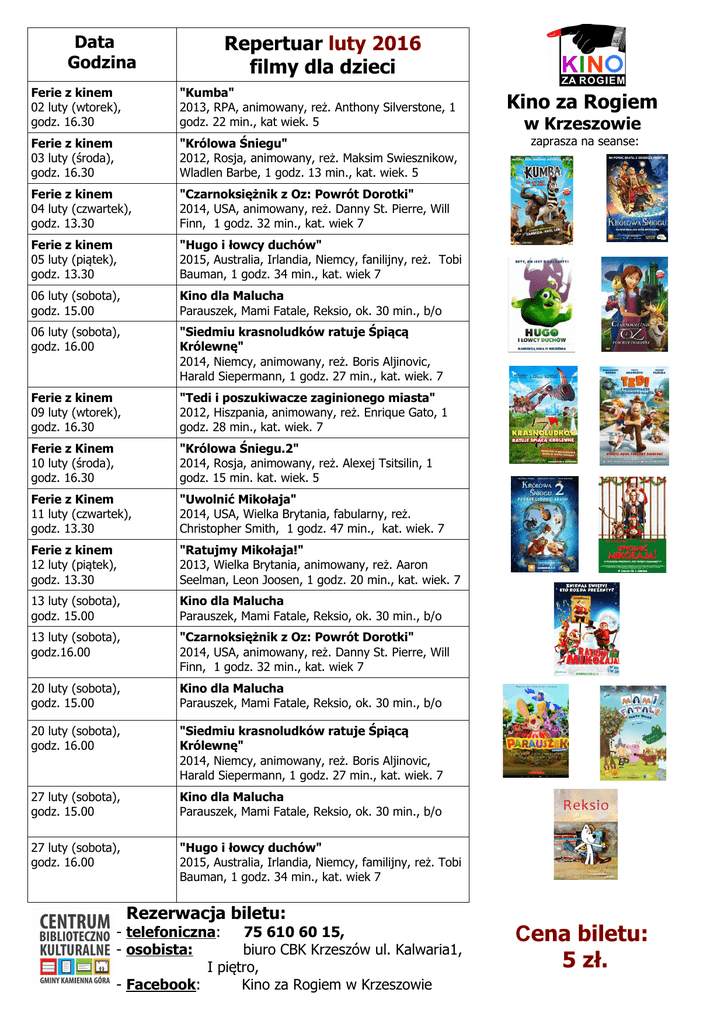 Data Godzina Repertuar luty 2016 filmy dla dzieci Ferie z kinem 02 luty (wtorek), godz. 16.30 "Kumba" 2013, RPA, animowany, reż. Anthony Silverstone, 1 godz. 22 min., kat wiek. 5 Kino za Rogiem Ferie z kinem 03 luty (środa), godz. 16.30 "Królowa Śniegu" 2012, Rosja, animowany, reż. Maksim Swiesznikow, Wladlen Barbe, 1 godz. 13 min., kat. wiek. 5 zaprasza na seanse: Ferie z kinem 04 luty (czwartek), godz. 13.30 "Czarnoksiężnik z Oz: Powrót Dorotki" 2014, USA, animowany, reż. Danny St. Pierre, Will Finn, 1 godz. 32 min., kat. wiek 7 Ferie z kinem 05 luty (piątek), godz. 13.30 "Hugo i łowcy duchów" 2015, Australia, Irlandia, Niemcy, fanilijny, reż. Tobi Bauman, 1 godz. 34 min., kat. wiek 7 06 luty (sobota), godz. 15.00 Kino dla Malucha Parauszek, Mami Fatale, Reksio, ok. 30 min., b/o 06 luty (sobota), godz. 16.00 "Siedmiu krasnoludków ratuje Śpiącą Królewnę" 2014, Niemcy, animowany, reż. Boris Aljinovic, Harald Siepermann, 1 godz. 27 min., kat. wiek. 7 Ferie z kinem 09 luty (wtorek), godz. 16.30 "Tedi i poszukiwacze zaginionego miasta" 2012, Hiszpania, animowany, reż. Enrique Gato, 1 godz. 28 min., kat. wiek. 7 Ferie z Kinem 10 luty (środa), godz. 16.30 "Królowa Śniegu.2" 2014, Rosja, animowany, reż. Alexej Tsitsilin, 1 godz. 15 min. kat. wiek. 5 Ferie z Kinem 11 luty (czwartek), godz. 13.30 "Uwolnić Mikołaja" 2014, USA, Wielka Brytania, fabularny, reż. Christopher Smith, 1 godz. 47 min., kat. wiek. 7 Ferie z kinem 12 luty (piątek), godz. 13.30 "Ratujmy Mikołaja!" 2013, Wielka Brytania, animowany, reż. Aaron Seelman, Leon Joosen, 1 godz. 20 min., kat. wiek. 7 13 luty (sobota), godz. 15.00 Kino dla Malucha Parauszek, Mami Fatale, Reksio, ok. 30 min., b/o 13 luty (sobota), godz.16.00 "Czarnoksiężnik z Oz: Powrót Dorotki" 2014, USA, animowany, reż. Danny St. Pierre, Will Finn, 1 godz. 32 min., kat. wiek 7 20 luty (sobota), godz. 15.00 Kino dla Malucha Parauszek, Mami Fatale, Reksio, ok. 30 min., b/o 20 luty (sobota), godz. 16.00 "Siedmiu krasnoludków ratuje Śpiącą Królewnę" 2014, Niemcy, animowany, reż. Boris Aljinovic, Harald Siepermann, 1 godz. 27 min., kat. wiek. 7 27 luty (sobota), godz. 15.00 Kino dla Malucha Parauszek, Mami Fatale, Reksio, ok. 30 min., b/o 27 luty (sobota), godz. 16.00 "Hugo i łowcy duchów" 2015, Australia, Irlandia, Niemcy, familijny, reż. Tobi Bauman, 1 godz. 34 min., kat. wiek 7 Rezerwacja biletu: - telefoniczna: 75 610 60 15, - osobista: biuro CBK Krzeszów ul. Kalwaria1, I piętro, - Facebook: Kino za Rogiem w Krzeszowie w Krzeszowie Cena biletu: 5 zł.