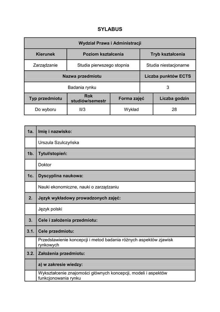 SYLABUS Wydział Prawa i Administracji Kierunek Poziom kształcenia Tryb kształcenia Zarządzanie Studia pierwszego stopnia Studia niestacjonarne Nazwa przedmiotu Liczba punktów ECTS Badania rynku 3 Typ przedmiotu Rok studiów/semestr Do wyboru 1a. Forma zajęć Liczba godzin Wykład 28 II/3 Imię i nazwisko: Urszula Szulczyńska 1b. Tytuł/stopień: Doktor 1c. Dyscyplina naukowa: Nauki ekonomiczne, nauki o zarządzaniu 2. Język wykładowy prowadzonych zajęć: Język polski 3. Cele i załoŜenia przedmiotu: 3.1. Cele przedmiotu: Przedstawienie koncepcji i metod badania róŜnych aspektów zjawisk rynkowych 3.2. ZałoŜenia przedmiotu: a) w zakresie wiedzy: Wykształcenie znajomości głównych koncepcji, modeli i aspektów funkcjonowania rynku b) w zakresie postaw: Wykształcenie potrzeb w zakresie pozyskiwania informacji o rynku dla zmniejszania niepewności w zarządzaniu oraz ograniczających ryzyko podejmowania decyzji o działaniach na rynku c) w zakresie umiejętności: Wykształcenie umiejętność wykorzystania danych płynących z rynku do podejmowania decyzji zarządczych; umiejętności zastosowania metod statystycznych i modeli ekonometrycznych do analizy danych rynkowych 4. Wymagania wstępne: Wiedza z zakresu mikroekonomii i statystyki 5. Metody dydaktyczne: Wykład aktywny, prezentacje przy uŜyciu rzutnika multimedialnego, rozwiązywanie zadań ilustrujących prezentowane zagadnienia i metody przy wykorzystaniu arkuszy kalkulacyjnych 6. Forma i warunki zaliczania przedmiotu: Pisemny sprawdzian wiadomości 7. Treści kształcenia (programowe): Istota rynku i mechanizmu rynkowego; działanie klasycznego i ograniczonego mechanizmu rynkowego; znaczenie badań rynku dla procesu podejmowania decyzji; mechanizm równowagi rynkowej w ujęciu statycznym i dynamicznym; modelowanie ekonometryczne zjawisk rynkowych; analiza pojemności rynku; analiza rynku w ujęciu przestrzennym; metody klasyfikacji obiektów, zastosowanie w badaniach rynku analizy conjoint; analiza chłonności rynku; analiza rozwoju zjawisk rynkowych w czasie; badanie udziału przedsiębiorstwa i jego konkurencyjności na rynku; badania rynku w przekroju strukturalnym 8. Wykaz literatury podstawowej: S. Mynarski, Badania rynkowe w przedsiębiorstwie, Akademia Ekonomiczna w Krakowie, Kraków 2001; Analiza rynku, red. H. Mruk, PWE, Warszawa 2003 9. Wykaz literatury uzupełniającej: Analiza rynku. Systemy i mechanizmy, red. S. Mynarski, Kraków 1993; S. Mynarski, Analiza rynku. Makromechanizmy, Akademia Ekonomiczna w Krakowie, Kraków 2000; G. Rosa, A. Smalec, Analiza i funkcjonowanie rynku na przykładach, Uniwersytet Szczeciński, Szczecin 2000; M. Rószkiewicz, Metody ilościowe w badaniach marketingowych, Wydawnictwo Naukowe PWN, Warszawa 2002; W. Wrzosek, Funkcjonowanie rynku, PWE, Warszawa 2002; H. Simon, Zarządzanie cenami, Wydawnictwo Naukowe PWN, Warszawa 1996; W. F. Samuelson, S. G. Marks, Ekonomia menedŜerska, PWE, Warszawa 1998 10. Akceptacja kierownika Katedry/Zakładu/Studium: