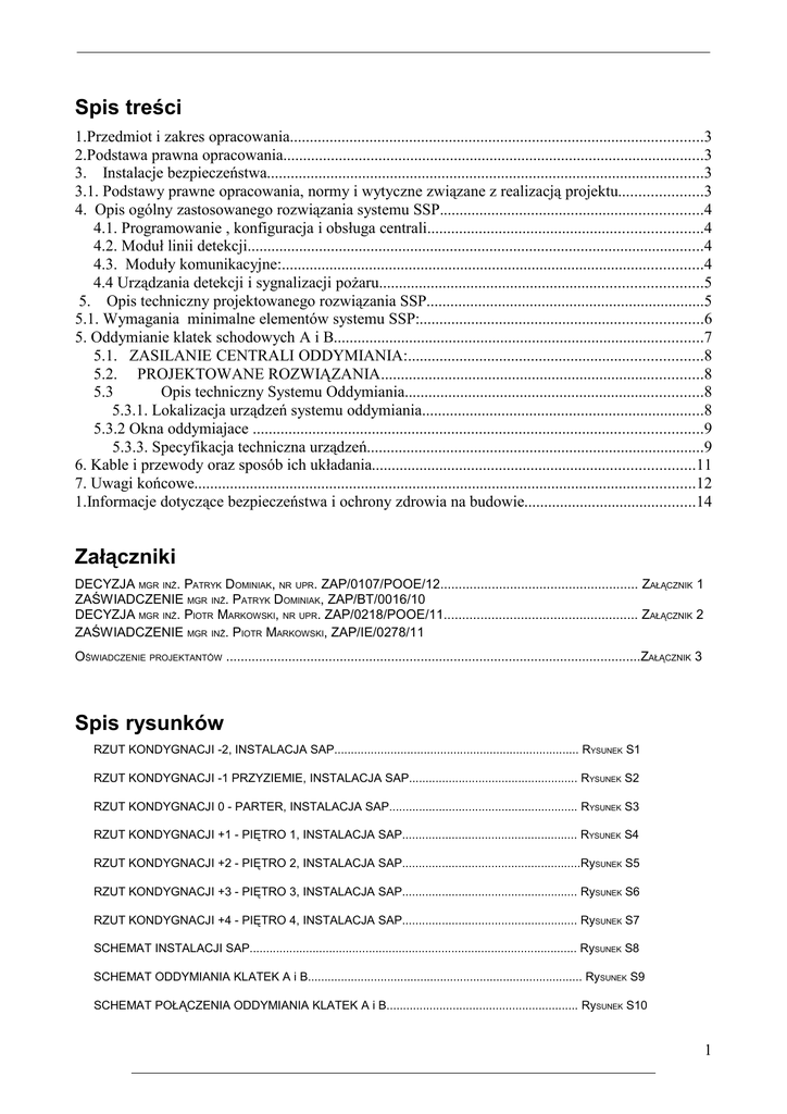 Spis treści 1.Przedmiot i zakres opracowania........................................................................................................3 2.Podstawa prawna opracowania..........................................................................................................3 3. Instalacje bezpieczeństwa..............................................................................................................3 3.1. Podstawy prawne opracowania, normy i wytyczne związane z realizacją projektu.....................3 4. Opis ogólny zastosowanego rozwiązania systemu SSP..................................................................4 4.1. Programowanie , konfiguracja i obsługa centrali.....................................................................4 4.2. Moduł linii detekcji...................................................................................................................4 4.3. Moduły komunikacyjne:..........................................................................................................4 4.4 Urządzania detekcji i sygnalizacji pożaru.................................................................................5 5. Opis techniczny projektowanego rozwiązania SSP......................................................................5 5.1. Wymagania minimalne elementów systemu SSP:.......................................................................6 5. Oddymianie klatek schodowych A i B.............................................................................................7 5.1. ZASILANIE CENTRALI ODDYMIANIA:..........................................................................8 5.2. PROJEKTOWANE ROZWIĄZANIA.................................................................................8 5.3 Opis techniczny Systemu Oddymiania...........................................................................8 5.3.1. Lokalizacja urządzeń systemu oddymiania.......................................................................8 5.3.2 Okna oddymiajace .................................................................................................................9 5.3.3. Specyfikacja techniczna urządzeń.....................................................................................9 6. Kable i przewody oraz sposób ich układania.................................................................................11 7. Uwagi końcowe..............................................................................................................................12 1.Informacje dotyczące bezpieczeństwa i ochrony zdrowia na budowie...........................................14 Załączniki DECYZJA MGR INŻ. PATRYK DOMINIAK, NR UPR. ZAP/0107/POOE/12...................................................... ZAŁĄCZNIK 1 ZAŚWIADCZENIE MGR INŻ. PATRYK DOMINIAK, ZAP/BT/0016/10 DECYZJA MGR INŻ. PIOTR MARKOWSKI, NR UPR. ZAP/0218/POOE/11..................................................... ZAŁĄCZNIK 2 ZAŚWIADCZENIE MGR INŻ. PIOTR MARKOWSKI, ZAP/IE/0278/11 OŚWIADCZENIE PROJEKTANTÓW .................................................................................................................ZAŁĄCZNIK 3 Spis rysunków RZUT KONDYGNACJI -2, INSTALACJA SAP.......................................................................... RYSUNEK S1 RZUT KONDYGNACJI -1 PRZYZIEMIE, INSTALACJA SAP................................................... RYSUNEK S2 RZUT KONDYGNACJI 0 - PARTER, INSTALACJA SAP......................................................... RYSUNEK S3 RZUT KONDYGNACJI +1 - PIĘTRO 1, INSTALACJA SAP..................................................... RYSUNEK S4 RZUT KONDYGNACJI +2 - PIĘTRO 2, INSTALACJA SAP......................................................RySUNEK S5 RZUT KONDYGNACJI +3 - PIĘTRO 3, INSTALACJA SAP..................................................... RySUNEK S6 RZUT KONDYGNACJI +4 - PIĘTRO 4, INSTALACJA SAP..................................................... RySUNEK S7 SCHEMAT INSTALACJI SAP................................................................................................... RySUNEK S8 SCHEMAT ODDYMIANIA KLATEK A i B................................................................................... RySUNEK S9 SCHEMAT POŁĄCZENIA ODDYMIANIA KLATEK A i B.......................................................... RySUNEK S10 1 1. Przedmiot i zakres opracowania „ROZBUDOWA, PRZEBUDOWA, NADBUDOWA ZESPOŁU BUDYNKÓW AKADEMII SZTUKI W SZCZECINIE, POŁĄCZONA ZE ZMIANĄ SPOSOBU UŻYTKOWANIA BUDYNKU INTERNATU NA CELE DYDAKTYCZNE ORAZ BUDOWĄ ELEKTROENERGETYCZNEJ SIECI KABLOWEJ, ZAGOSPODAROWANIEM TERENU, BUDOWĄ NIEZBĘDNYCH URZĄDZEŃ I OBIEKTÓW INFRASTRUKTURY TECHNICZNEJ” INSTALACJA SAP I ODDYMIANIE KLATEK SCHODOWYCH Adres: CENTRUM PRZEMYSŁÓW KREATYWNYCH, AKADEMII SZTUKI W SZCZECINIEINTERNAT, PL. ORŁA BIAŁEGO 2 ; SZCZECIN 70-562 DZ.NR 33/16, 33/9, OBRĘB:1036 Inwestor: AKADEMIA SZTUKI W SZCZECINIE, PL. ORŁA BIAŁEGO 2, 70-562 SZCZECIN 2. Podstawa prawna opracowania 3. • umowa pomiędzy Inwestorem a projektantem • koncepcja rozwiązań techniczno-technologicznych oraz ustalenia pomiędzy Inwestorem, a Projektantem; • projekty branżowe instalacji i architektury • obowiązujące normy i przepisy Instalacje bezpieczeństwa 3.1. Podstawy prawne opracowania, normy i wytyczne związane z realizacją projektu • Rozporządzenie Ministra Spraw Wewnętrznych i Administracji z dnia 7 czerwca 2010 r. w sprawie ochrony przeciwpożarowej budynków, innych obiektów budowlanych i terenów (Dz. U. Nr 109, poz. 719) • Rozporządzenie Ministra Spraw Wewnętrznych i Administracji z dnia 20 czerwca 2007 r. w sprawie wykazu wyrobów służących zapewnieniu bezpieczeństwa publicznego lub ochronie zdrowia i życia oraz mienia, a także zasad wydawania dopuszczenia tych wyrobów do użytkowania (Dz. U. Nr 143, poz. 1002 ze zm.) • Rozporządzenie Ministra Infrastruktury z dnia 12 kwietnia 2002 roku w s